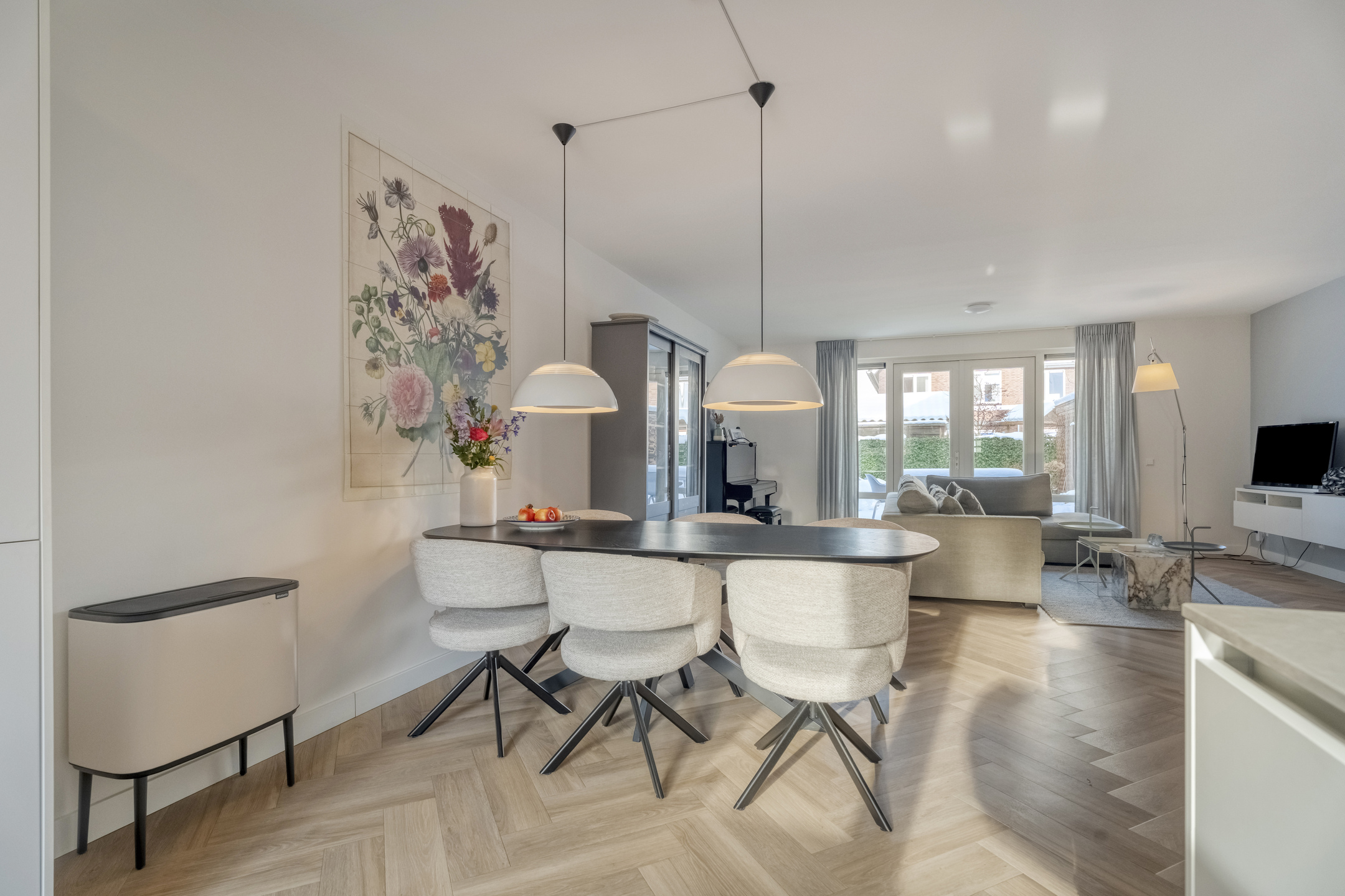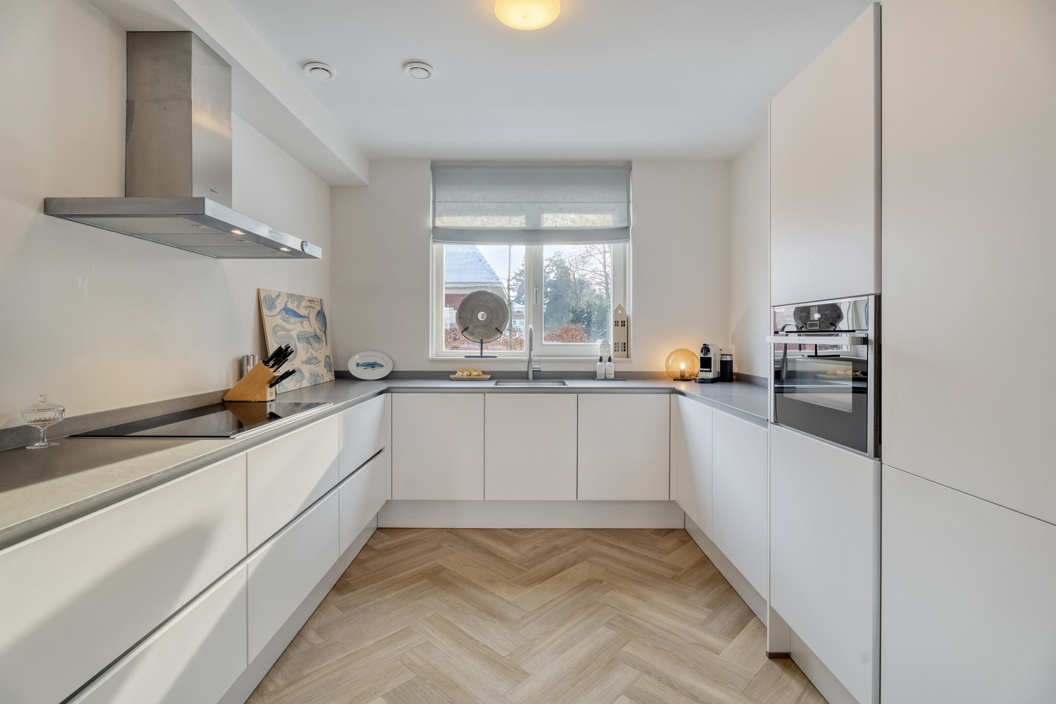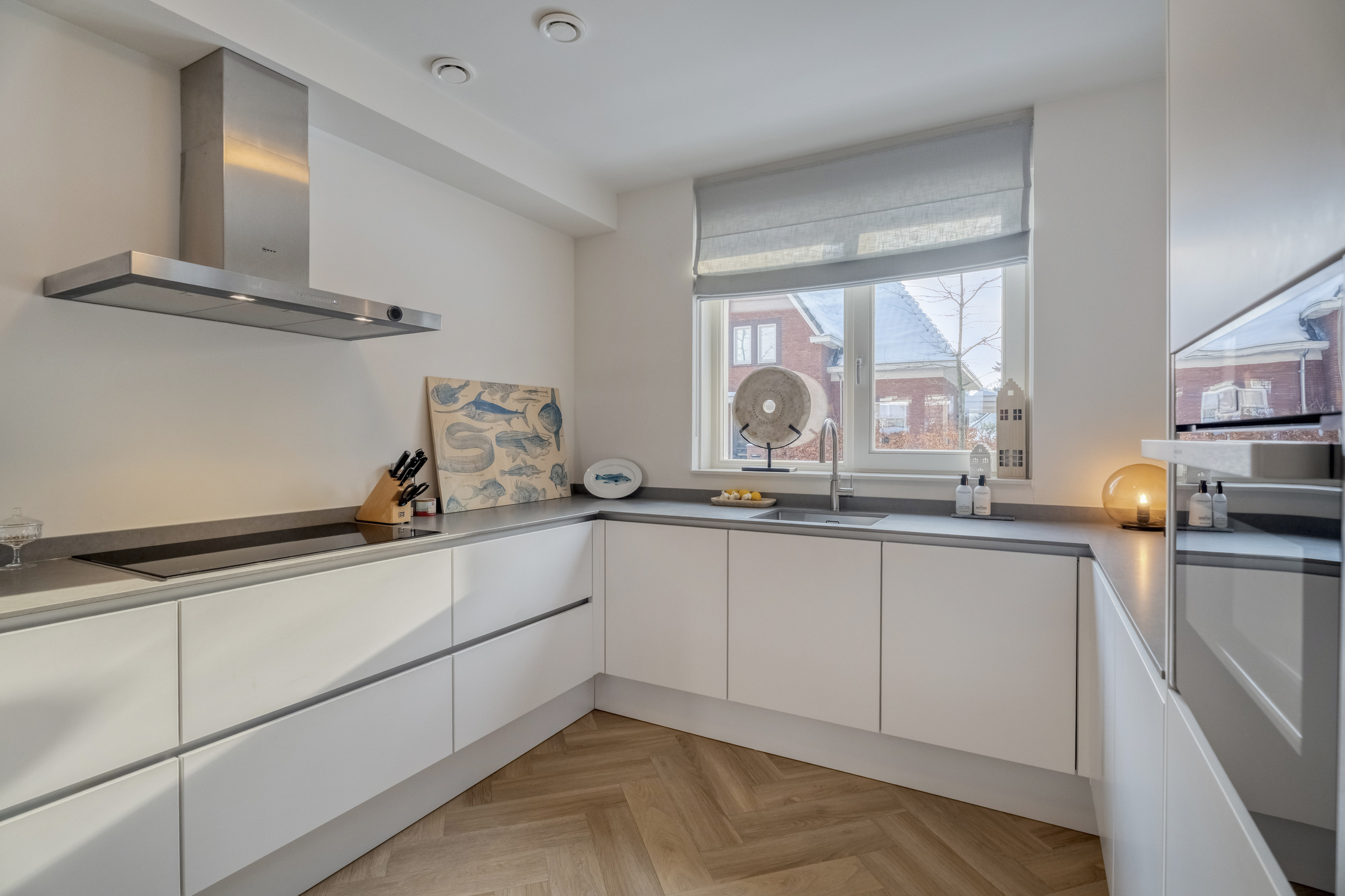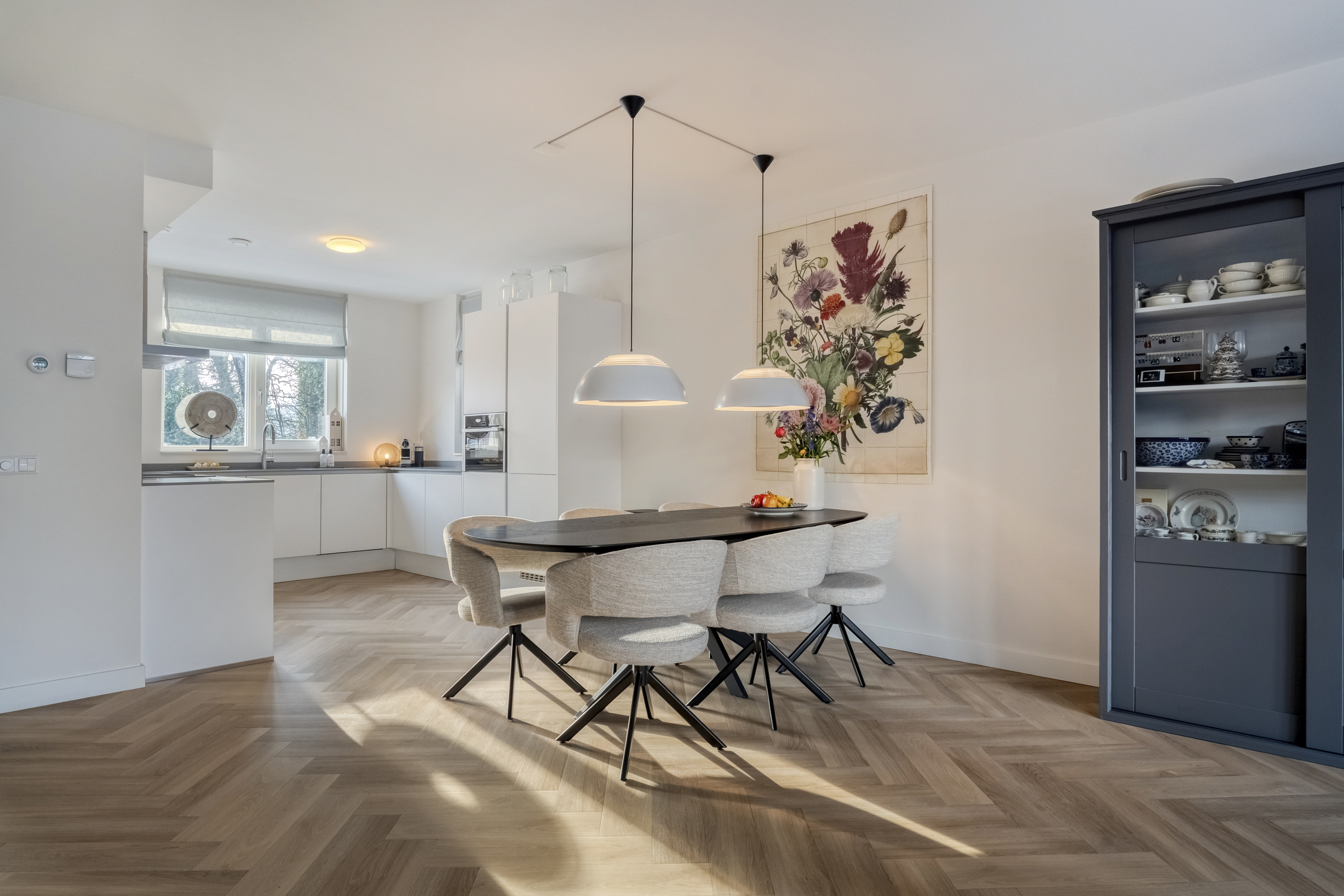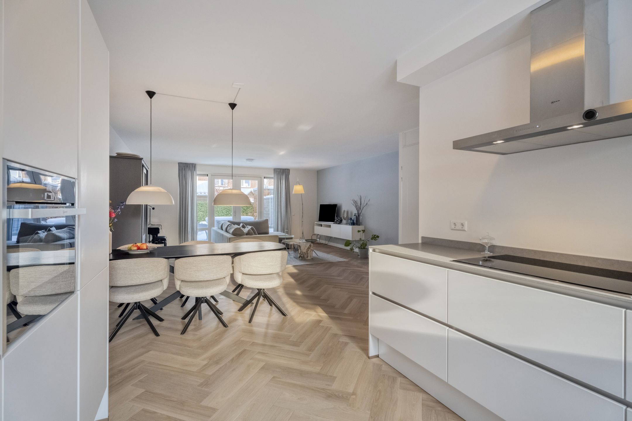 De woonkamer is tuingericht, met dubbele openslaande deuren naar het terras. De visgraat PVC-vloer met vloerverwarming, glad gestucte wanden en het lichte kleurgebruik zorgen voor een luxe uitstraling. De open keuken ligt aan de voorzijde en is voorzien van een moderne, greeploze opstelling in U-vorm met hoogwaardige inbouwapparatuur, een Quooker, een composieten blad en veel werkruimte. Hier kook je met plezier en heb je ook nog ruimte om gezellig te zitten.