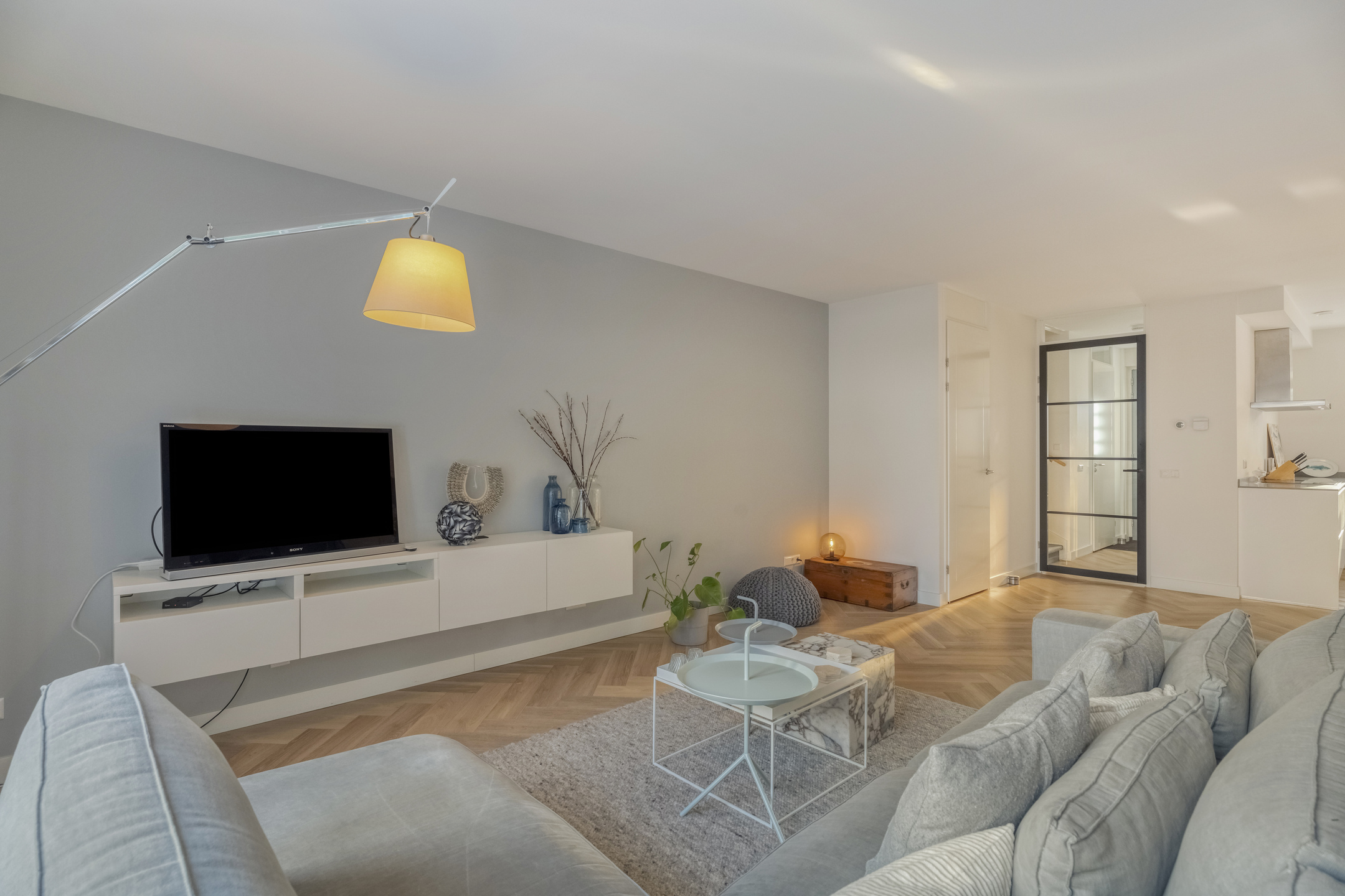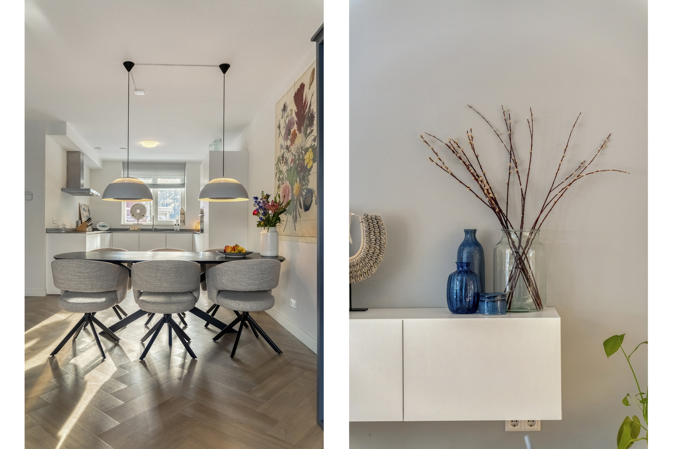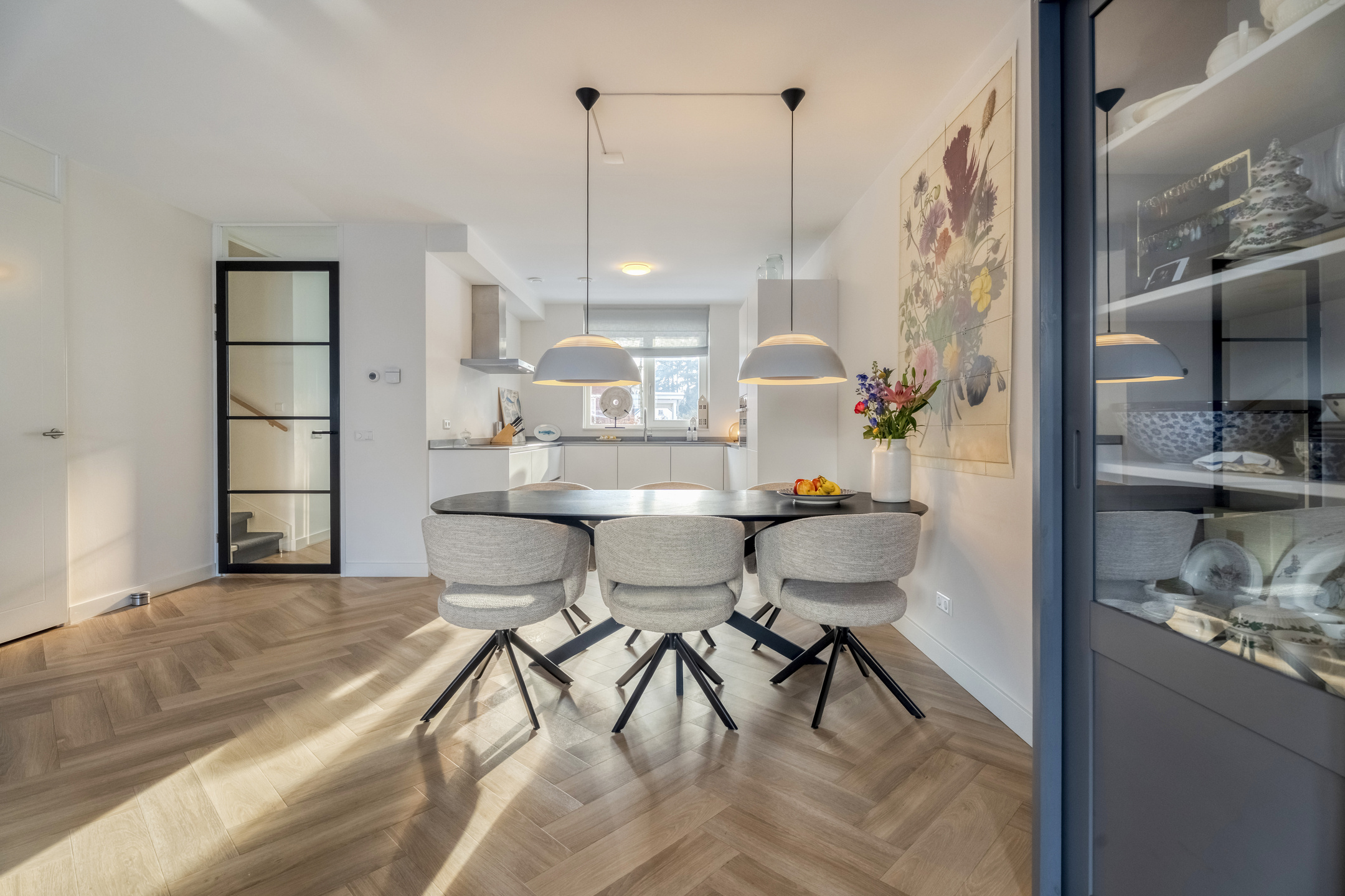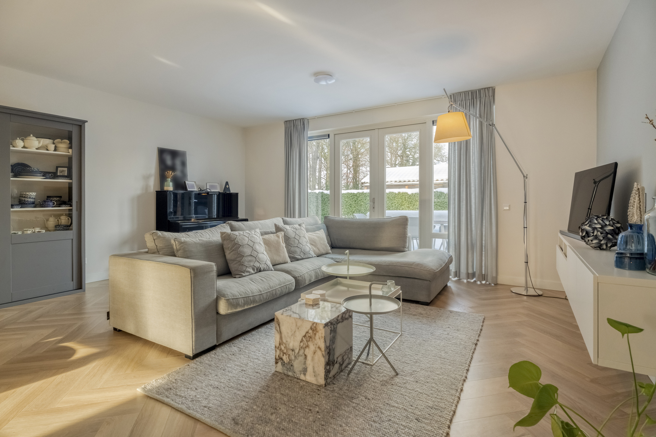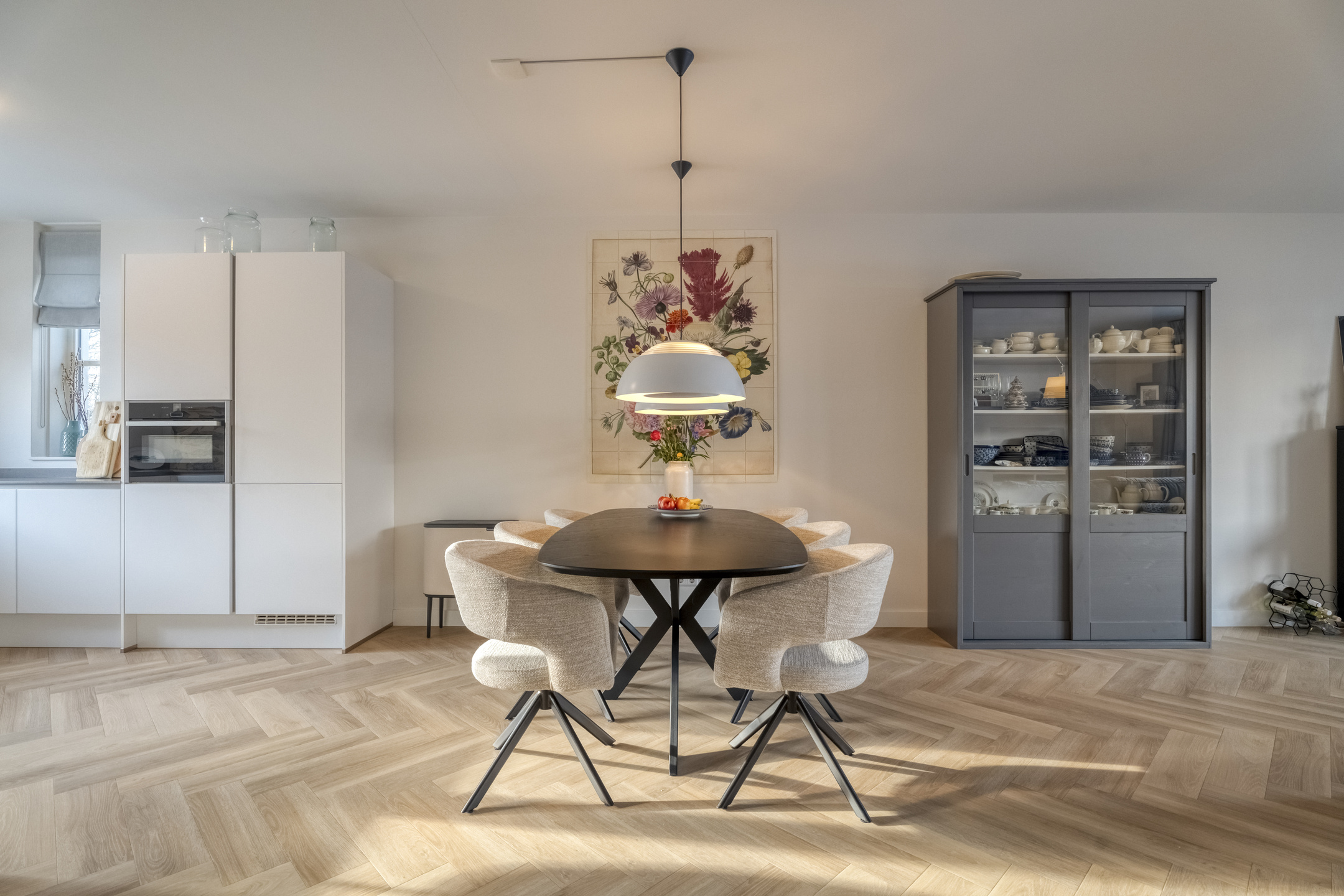 De woonkamer is tuingericht, met dubbele openslaande deuren naar het terras. De visgraat PVC-vloer met vloerverwarming, glad gestucte wanden en het lichte kleurgebruik zorgen voor een luxe uitstraling. De open keuken ligt aan de voorzijde en is voorzien van een moderne, greeploze opstelling in U-vorm met hoogwaardige inbouwapparatuur, een Quooker, een composieten blad en veel werkruimte. Hier kook je met plezier en heb je ook nog ruimte om gezellig te zitten.