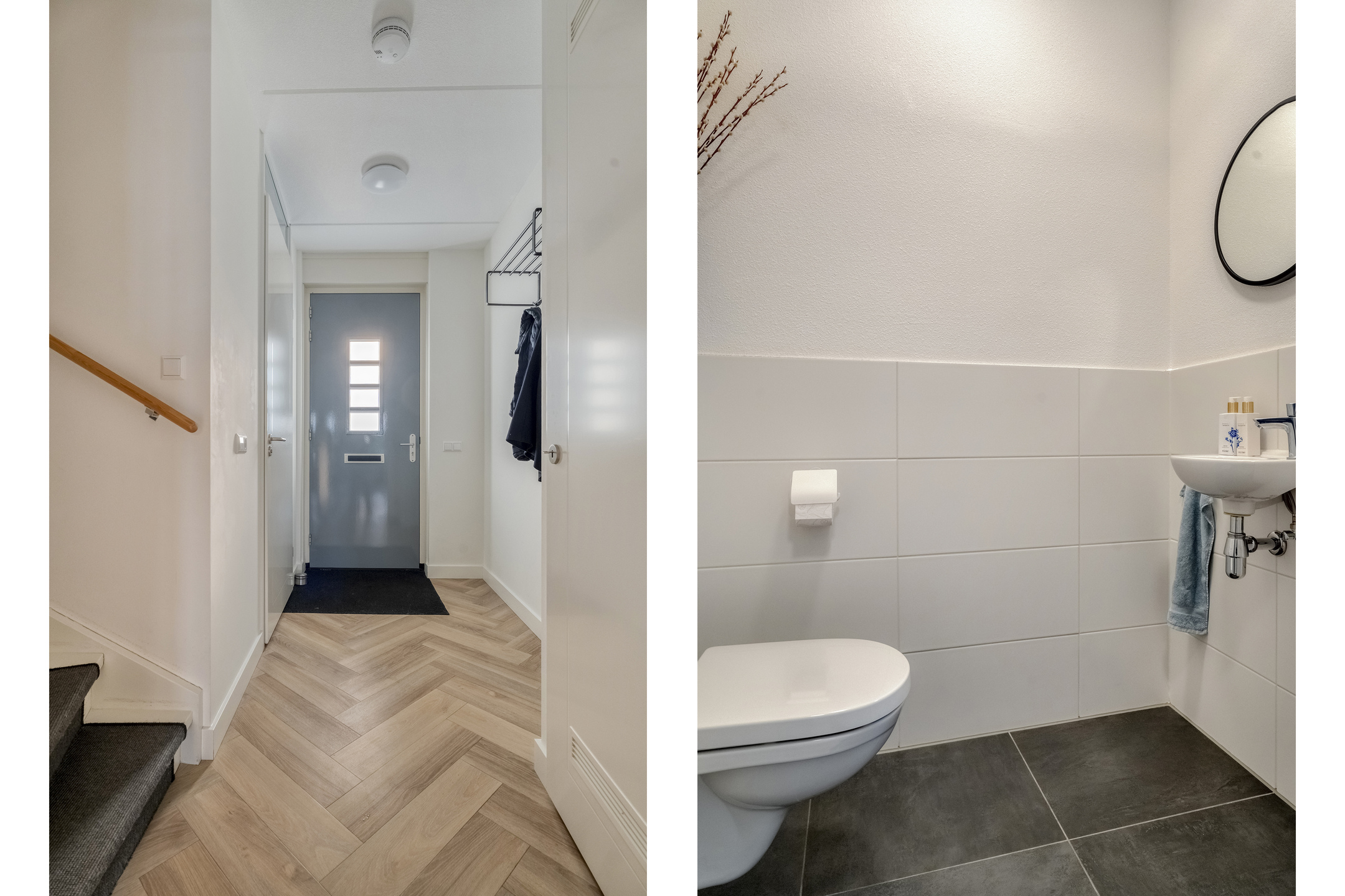 Je komt binnen via een strak aangelegde voortuin met oprit. De hal is licht en ruim, en voorzien van een modern toilet, meterkast en trapopgang. Via een stijlvolle zwarte taatsdeur stap je de royale woonkamer binnen.