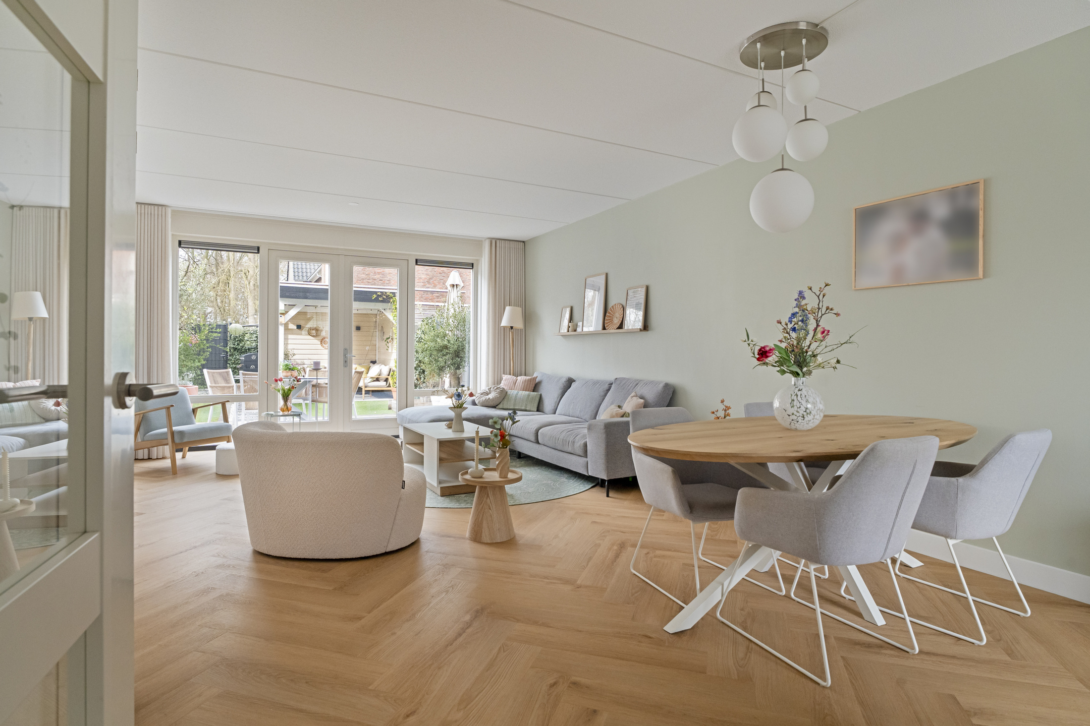 Wat direct opvalt, is de lichte en rustige sfeer. De woonkamer is tuingericht en dankzij de grote raampartijen en openslaande deuren valt er veel daglicht naar binnen. De ruimte is praktisch ingedeeld met een comfortabel zitgedeelte aan de achterzijde en voldoende plek voor een eettafel. De begane grond is voorzien van vloerverwarming en het geheel is strak afgewerkt met een mooie PVC vloerafwerking.