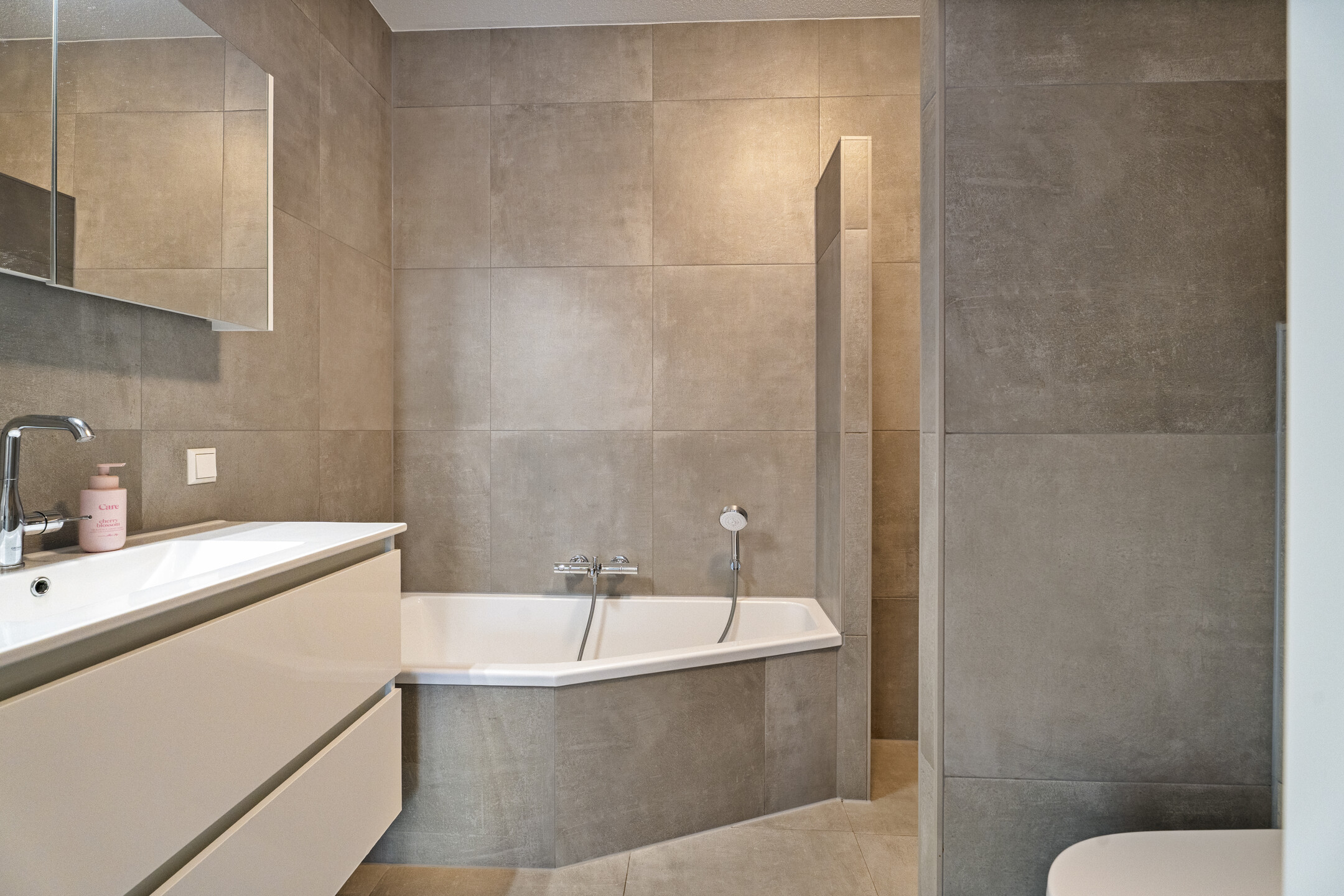 De badkamer is modern afgewerkt en voorzien van een ligbad, douche, wastafelmeubel en toilet. Alles in een rustige, eigentijdse stijl die goed aansluit bij de rest van de woning.