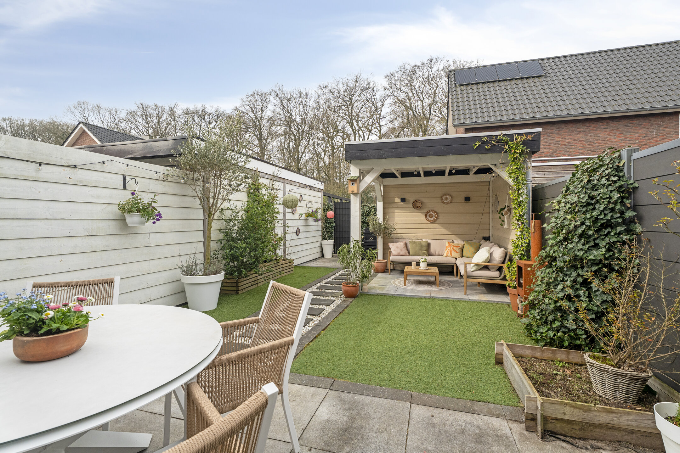 De achtertuin is verzorgd aangelegd en biedt een fijne combinatie van groen en terras. Direct achter de woning kun je heerlijk zitten en onder de overkapping achterin de tuin is het ook op minder zonnige dagen goed vertoeven.