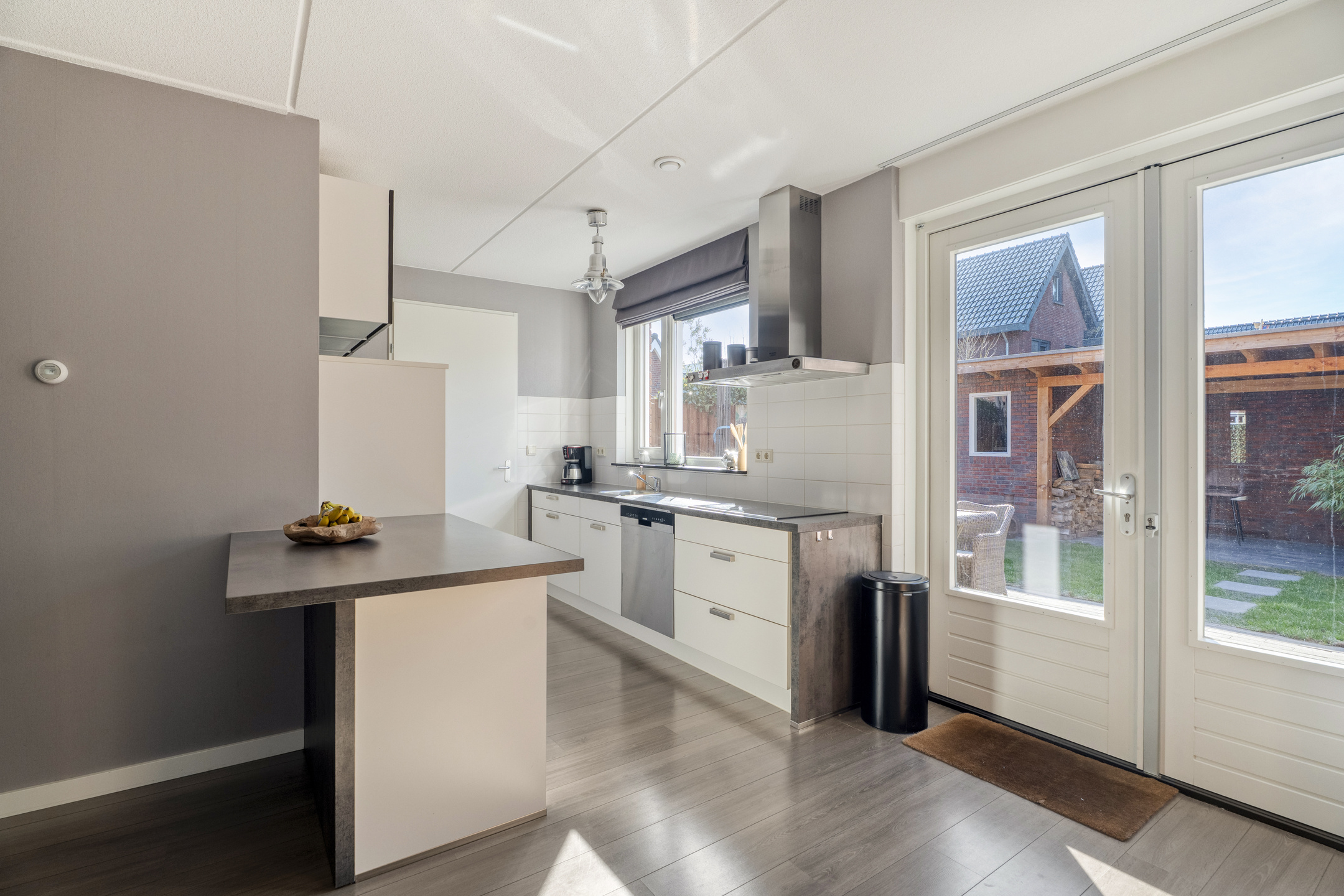 Aan de achterzijde bevindt zich de woonkeuken met aansluitend het eetgedeelte. De keuken heeft een strakke opstelling met veel werk- en bergruimte en diverse inbouwapparatuur. Het kookgedeelte ligt aan het raam met uitzicht op de achtertuin. Via de openslaande deuren loop je zo het terras op.