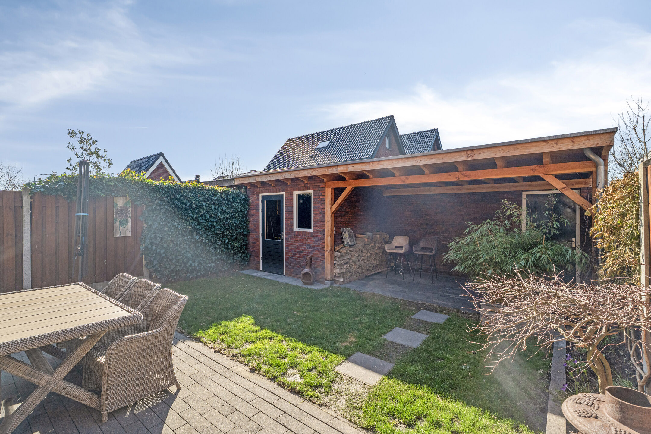 Achterin de tuin bevindt zich een fraaie houten overkapping, een heerlijke plek om tot in de avond van het buitenleven te genieten. Daarnaast is er een praktische berging aanwezig voor fietsen en tuingereedschap.