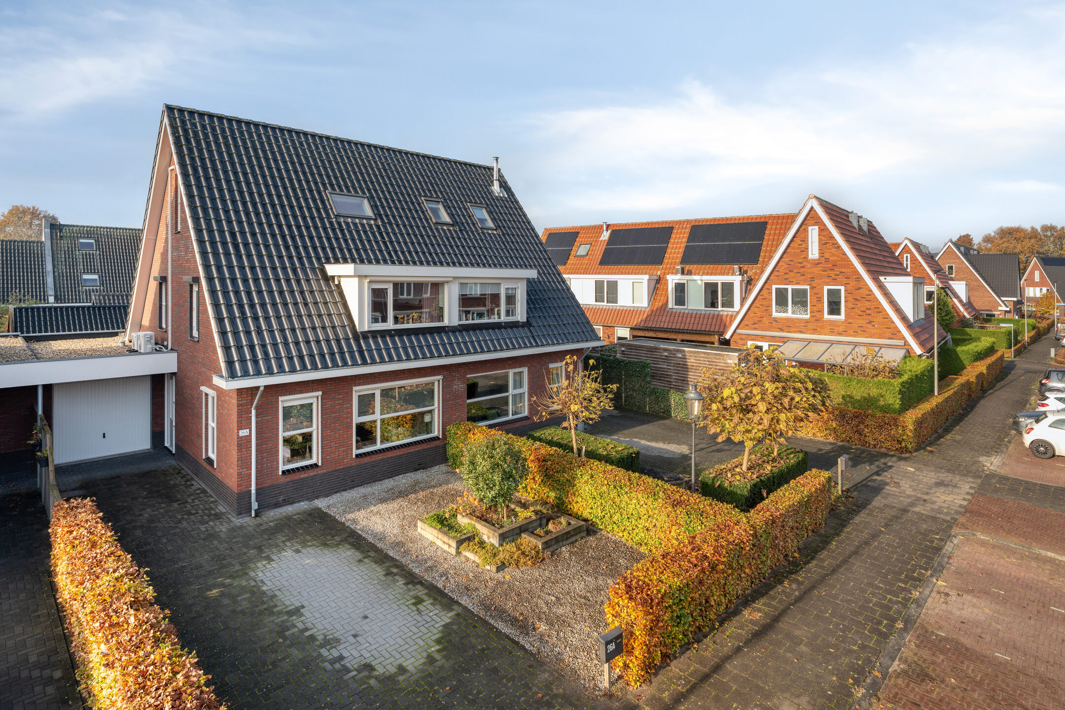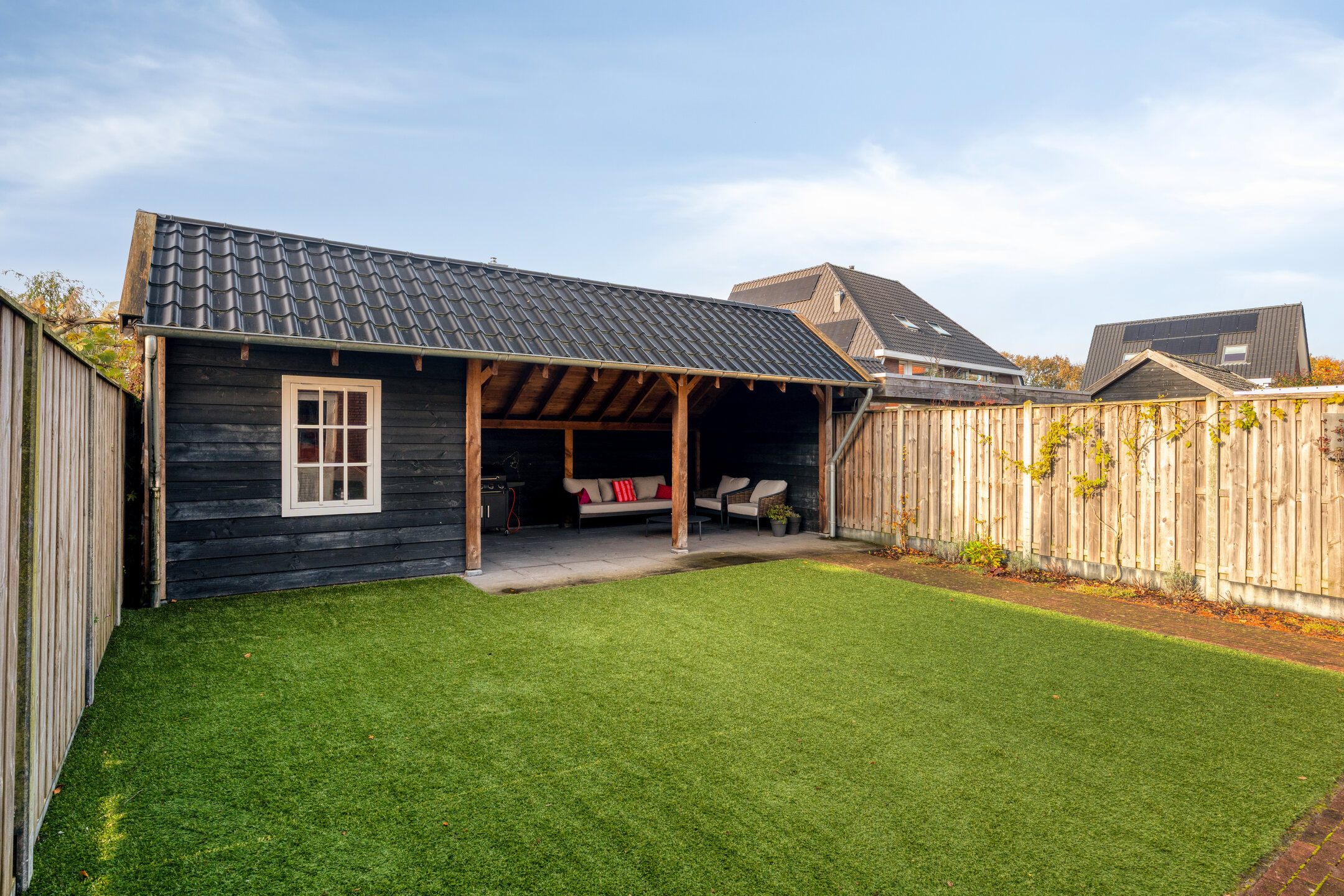 De achtertuin is strak en onderhoudsvriendelijk ingericht met kunstgras, bestrating en een sfeervolle houten veranda met berging. Hier kun je het hele jaar door buiten zitten, ook als het weer iets minder meewerkt. De tuin is volledig omsloten en daarmee veilig voor kinderen of huisdieren. Aan de voorzijde biedt de oprit ruimte voor meerdere auto's en de voortuin is groen aangeplant.