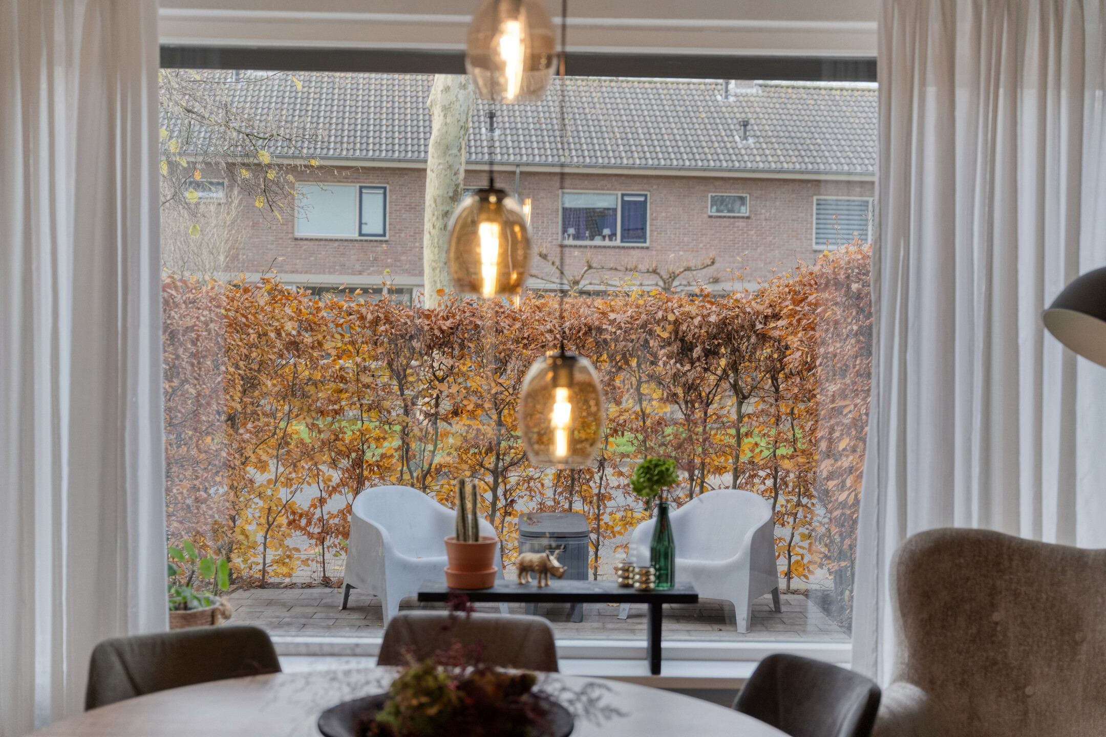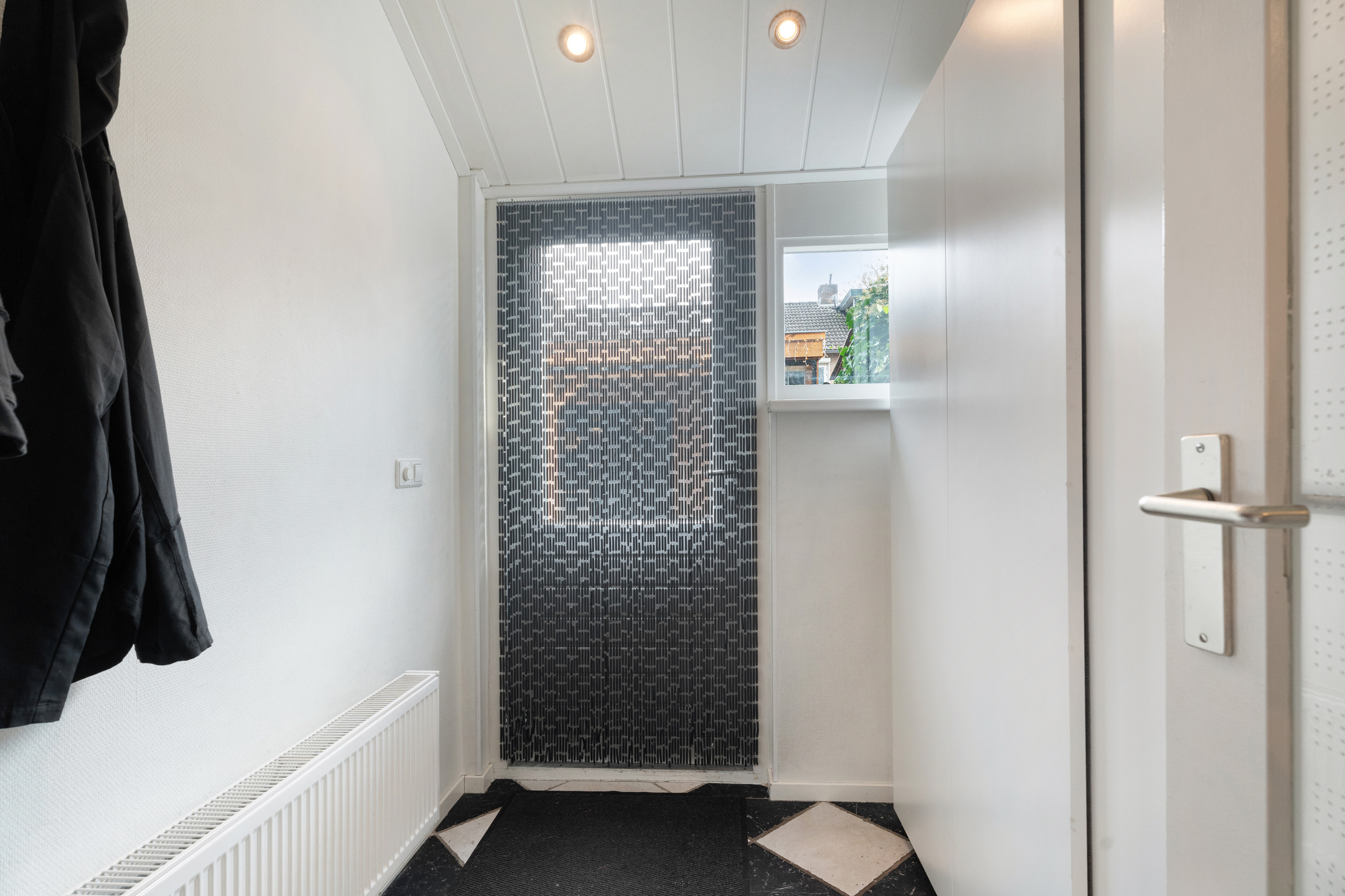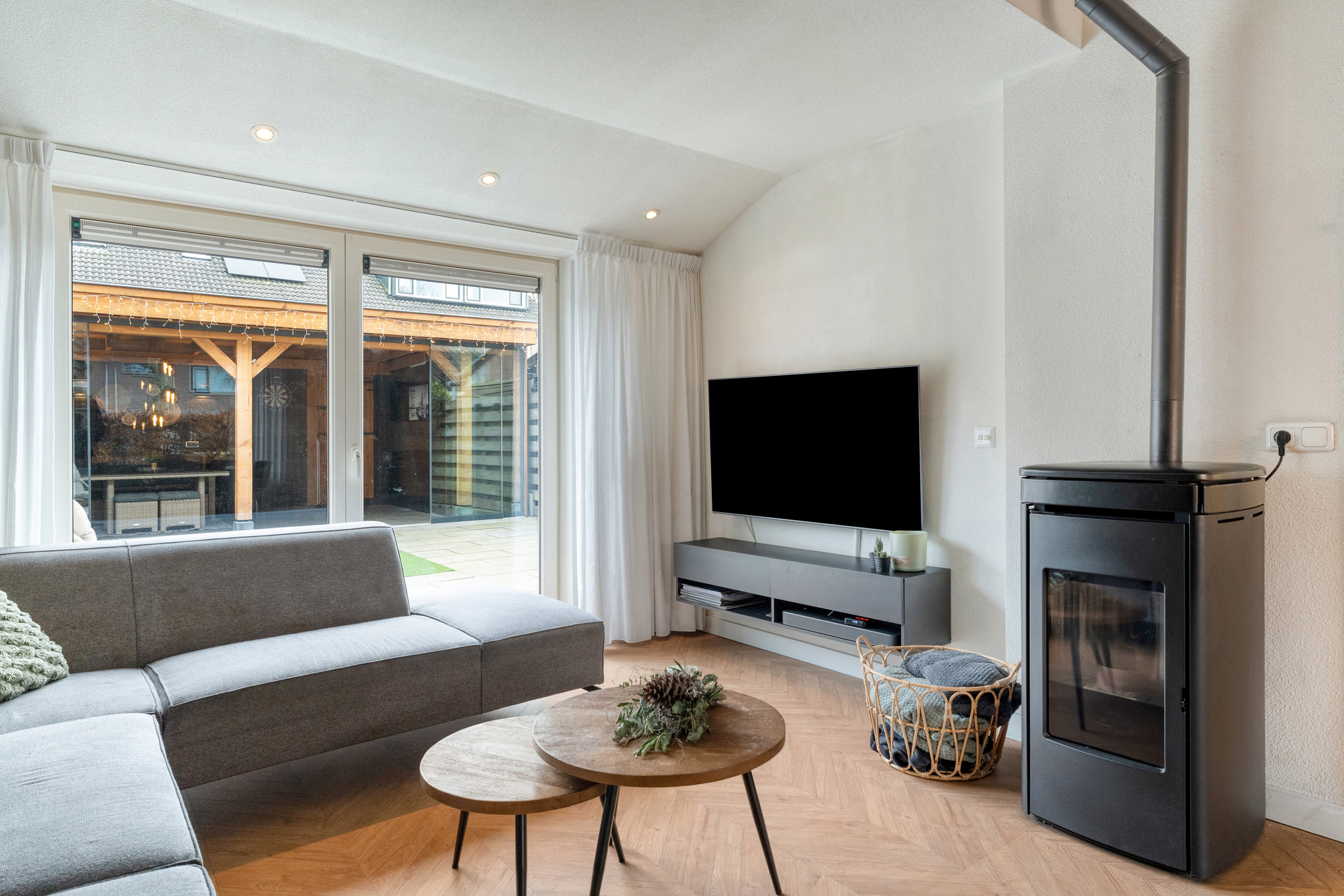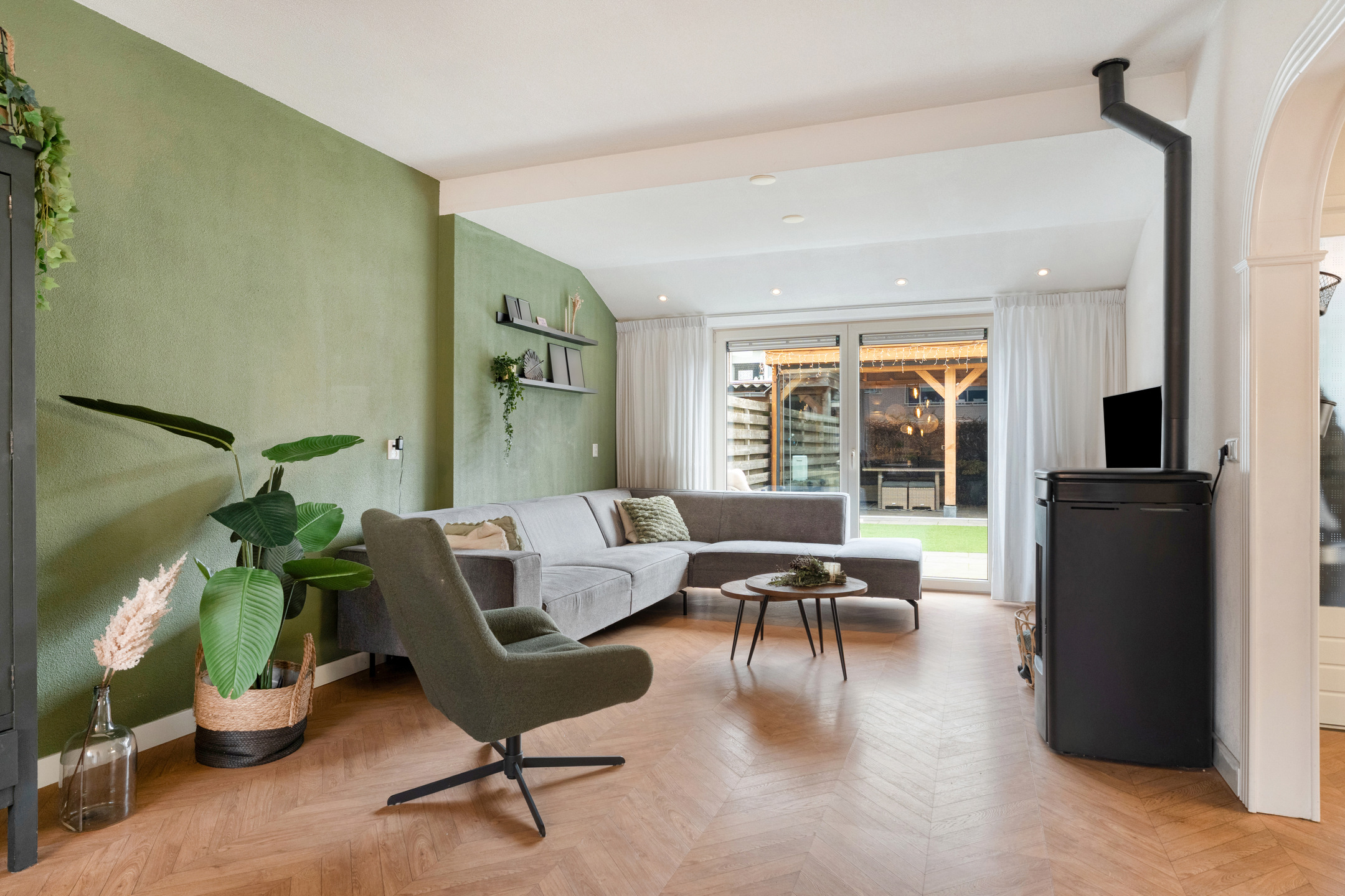 Je komt binnen via de nette voortuin en betreedt de hal met meterkast, trapopgang, trapkast en het toilet. De woning is aan de achterzijde uitgebouwd, wat zorgt voor extra leefruimte in de woonkamer. De zithoek bevindt zich nu aan de tuinzijde, met grote kunststof openslaande deuren naar het terras en zicht op de veranda. Wil je liever aan de voorzijde zitten? Dan is dat eenvoudig te realiseren. De huidige opstelling laat goed zien dat de ruimte flexibel en praktisch in te delen is.
