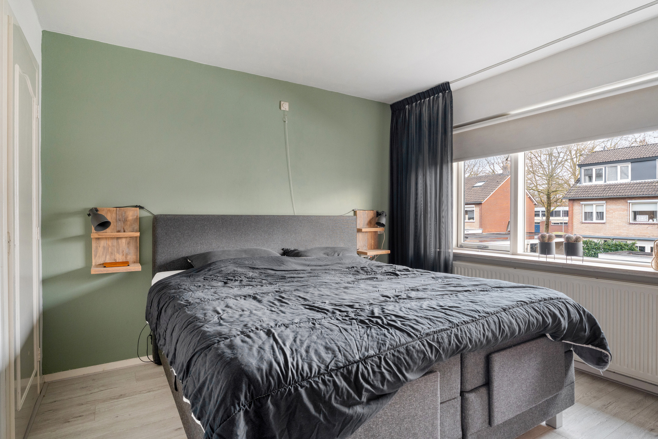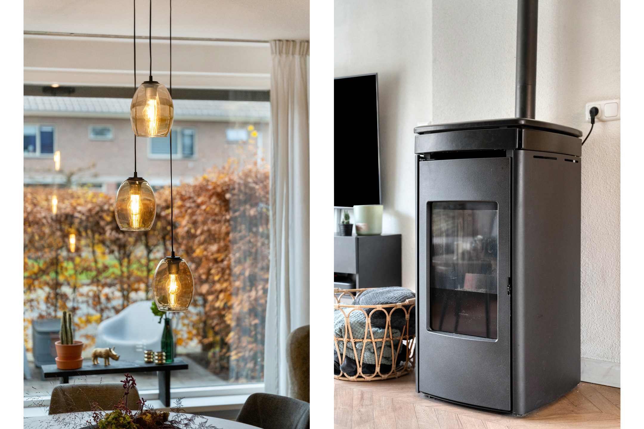 De woonkamer is sfeervol afgewerkt met een houtlook Hongaarsepuntvloer, rustige kleuren op de wanden en een aansluiting voor een pelletkachel. Aan de voorzijde vind je de eethoek met volop ruimte voor een grote tafel. Tussen de woonkamer en de keuken is deels een muur, maar je kunt er ook voor kiezen om hier een volledig open keuken van te maken.
