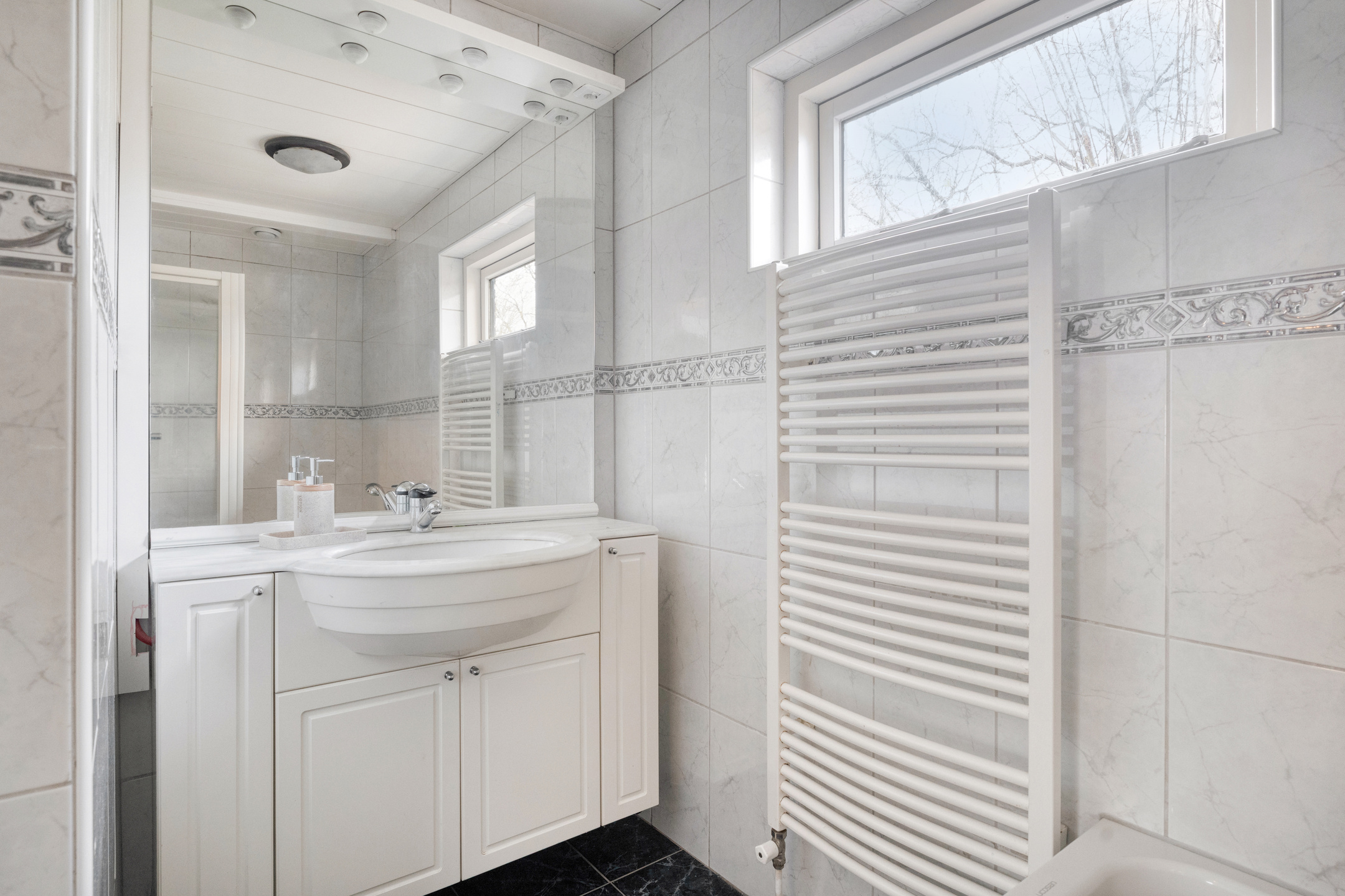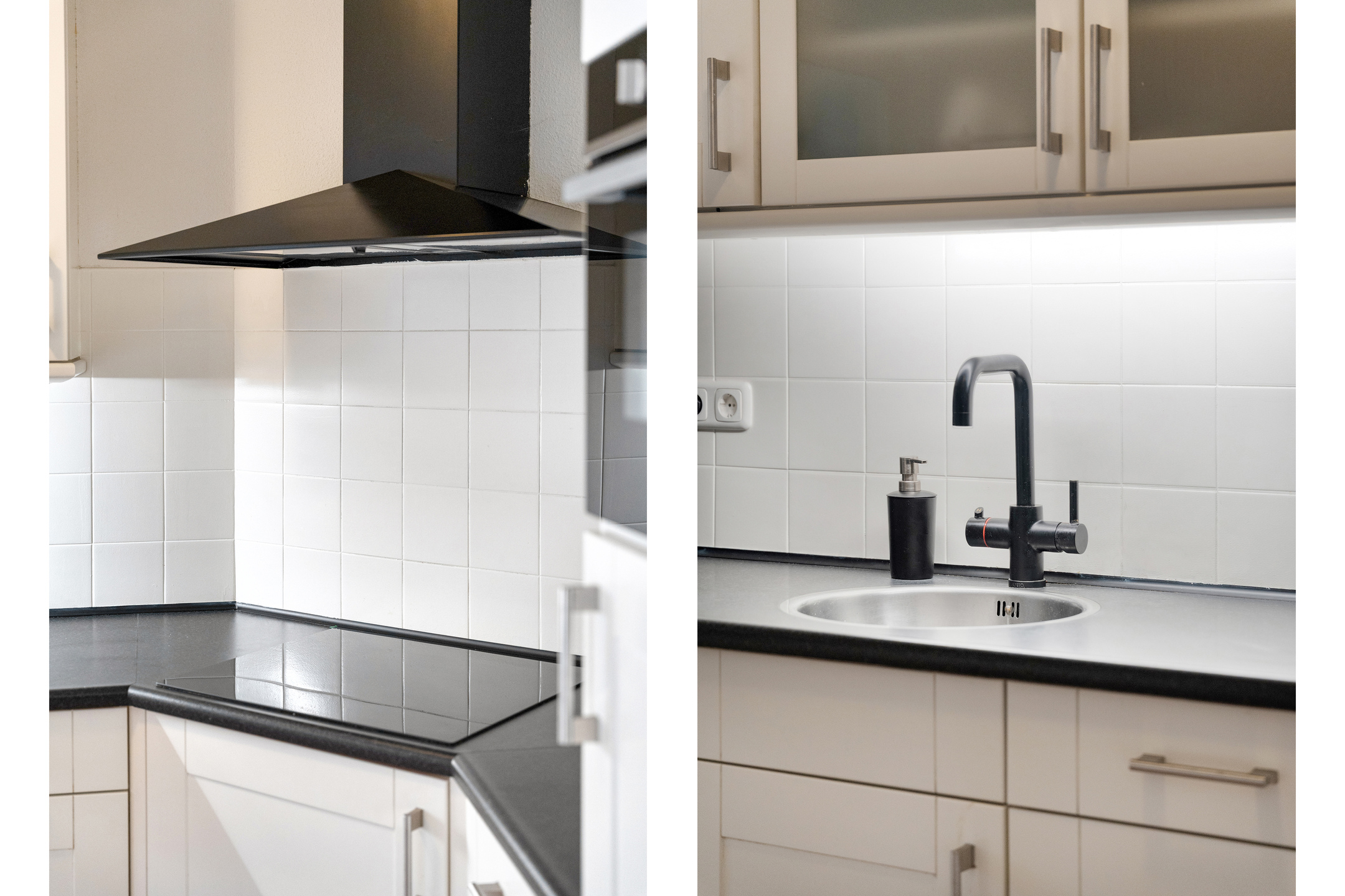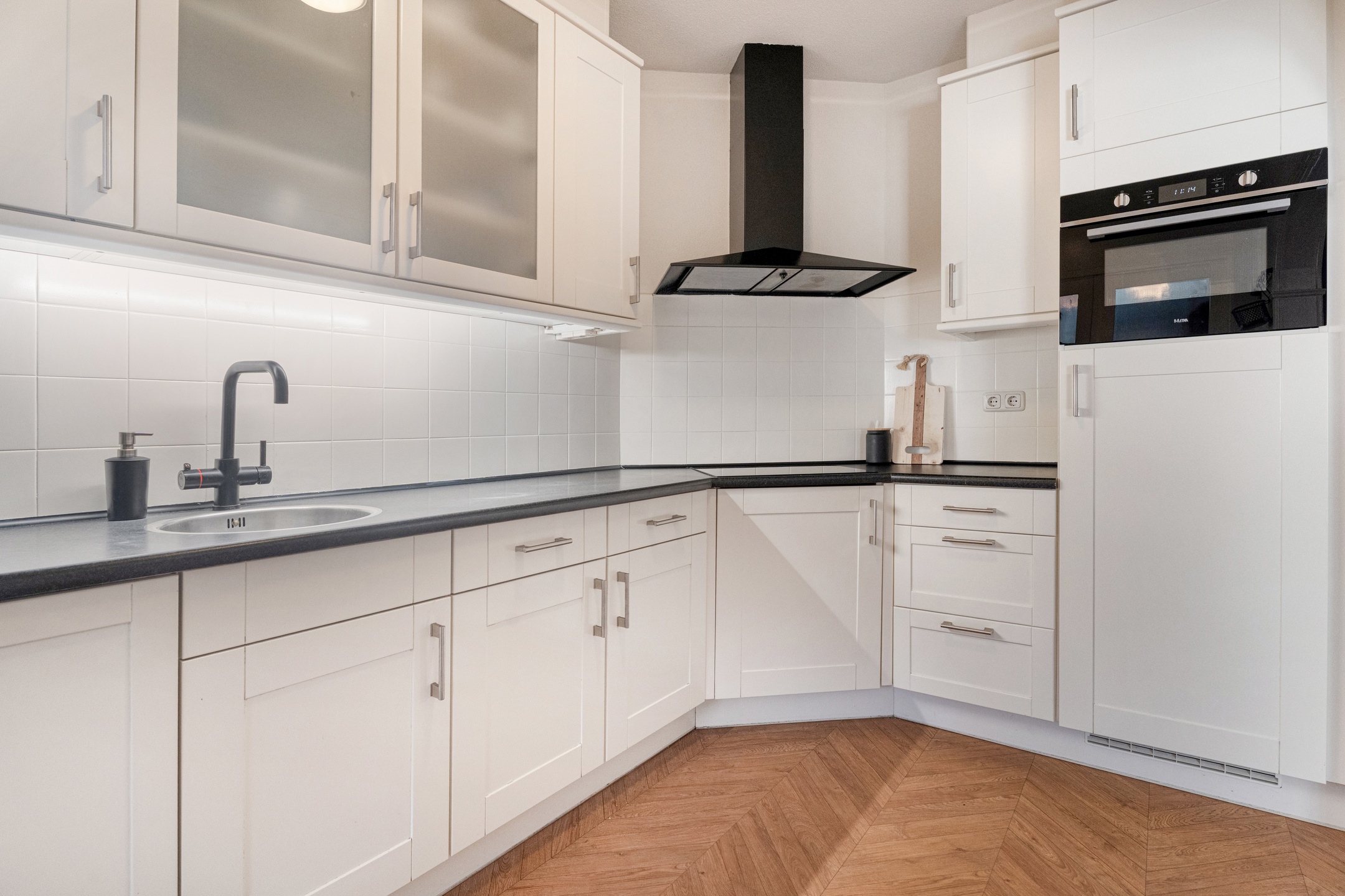 De keuken zelf is uitgevoerd in een hoekopstelling met lichte fronten en donker werkblad, en beschikt over diverse inbouwapparatuur. Aansluitend vind je de praktische bijkeuken met kastenwand en de aansluitingen voor wasmachine en droger. Hier is ook toegang tot de tuin en een ruime bergkast.