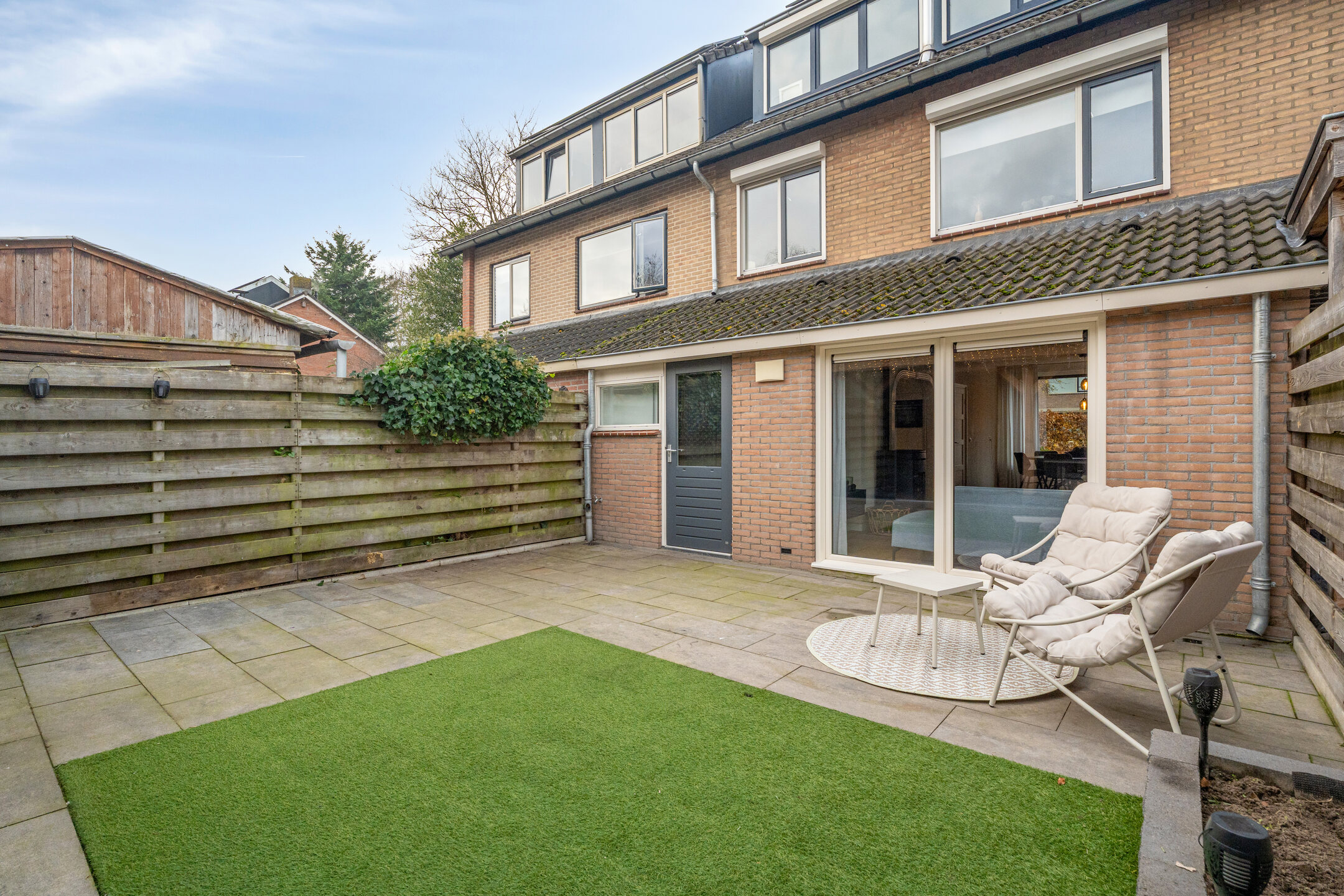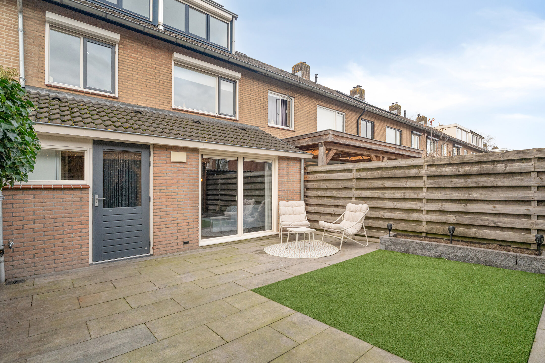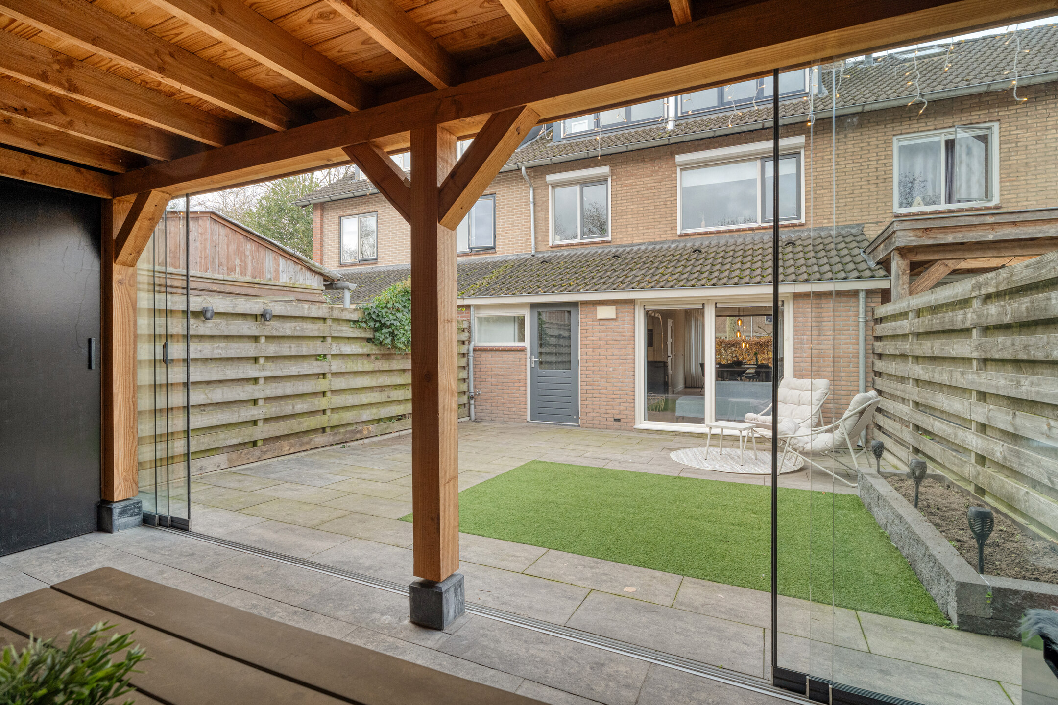 De voortuin is sfeervol ingericht met een haag die het zicht naar binnen ontneemt, waardoor je hier verrassend veel privacy hebt. De achtertuin is onderhoudsvriendelijk aangelegd met kunstgras en terrastegels. De absolute blikvanger is de grote veranda met glazen schuifpanelen: een plek waar je het hele jaar door buiten kunt zitten, eten of ontspannen. De veranda is verbonden met de berging, ideaal voor tuinspullen. Mocht je hier te weinig ruimte bij hebben? Dan is wellicht de garage voor jou een interessante optie. Achterin bevindt zich een achterom. De optionele garagebox ligt in de directe nabijheid.