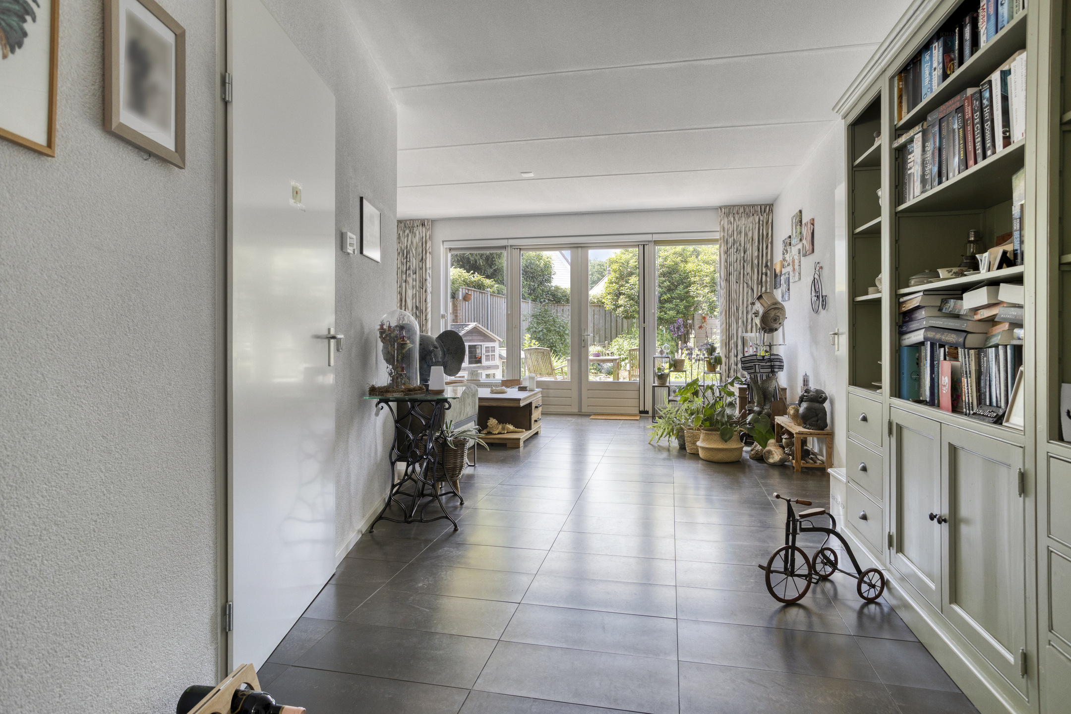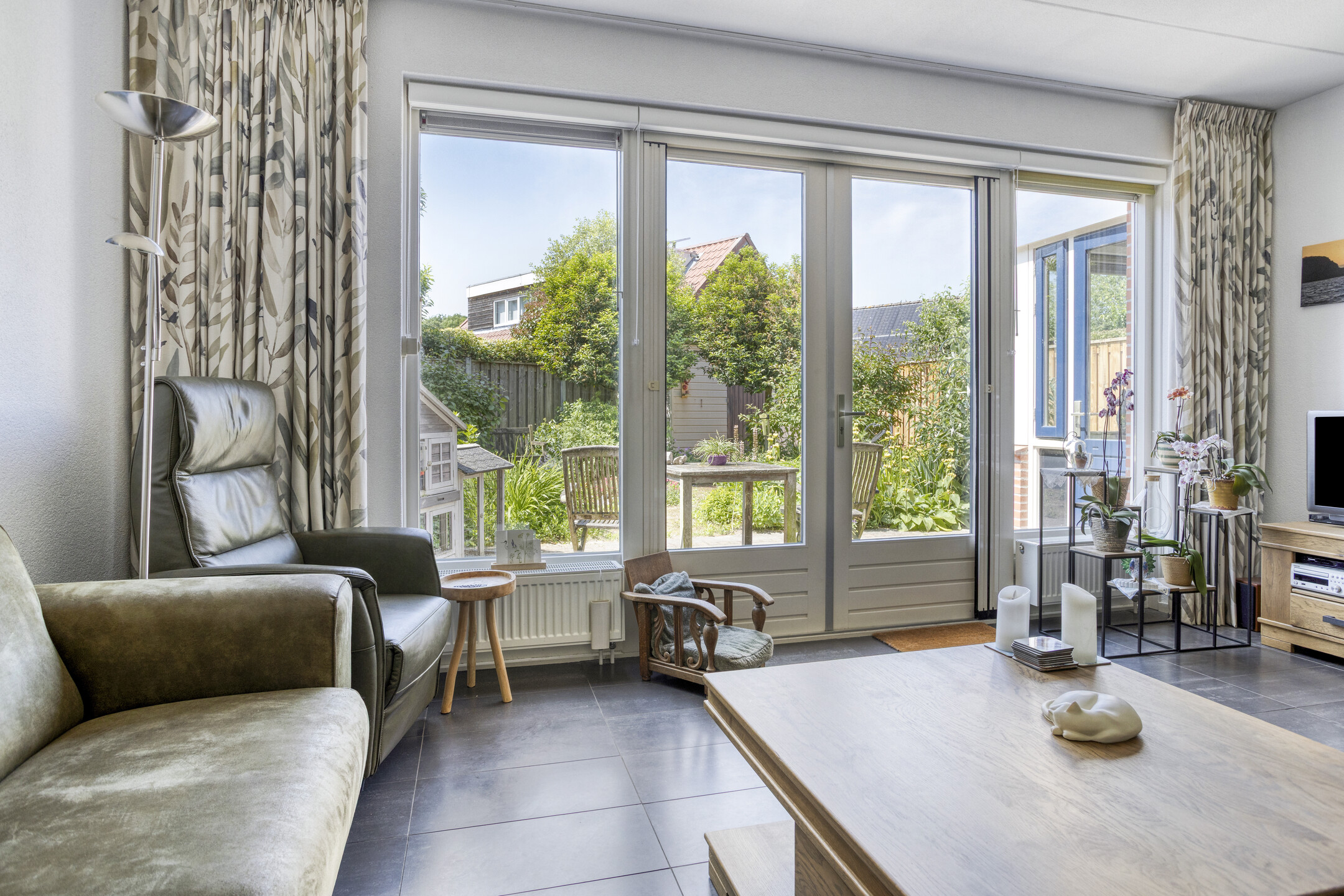 De woonkamer aan de achterzijde heeft door middel van de openslaande deuren een fraai uitzicht over de achtertuin.