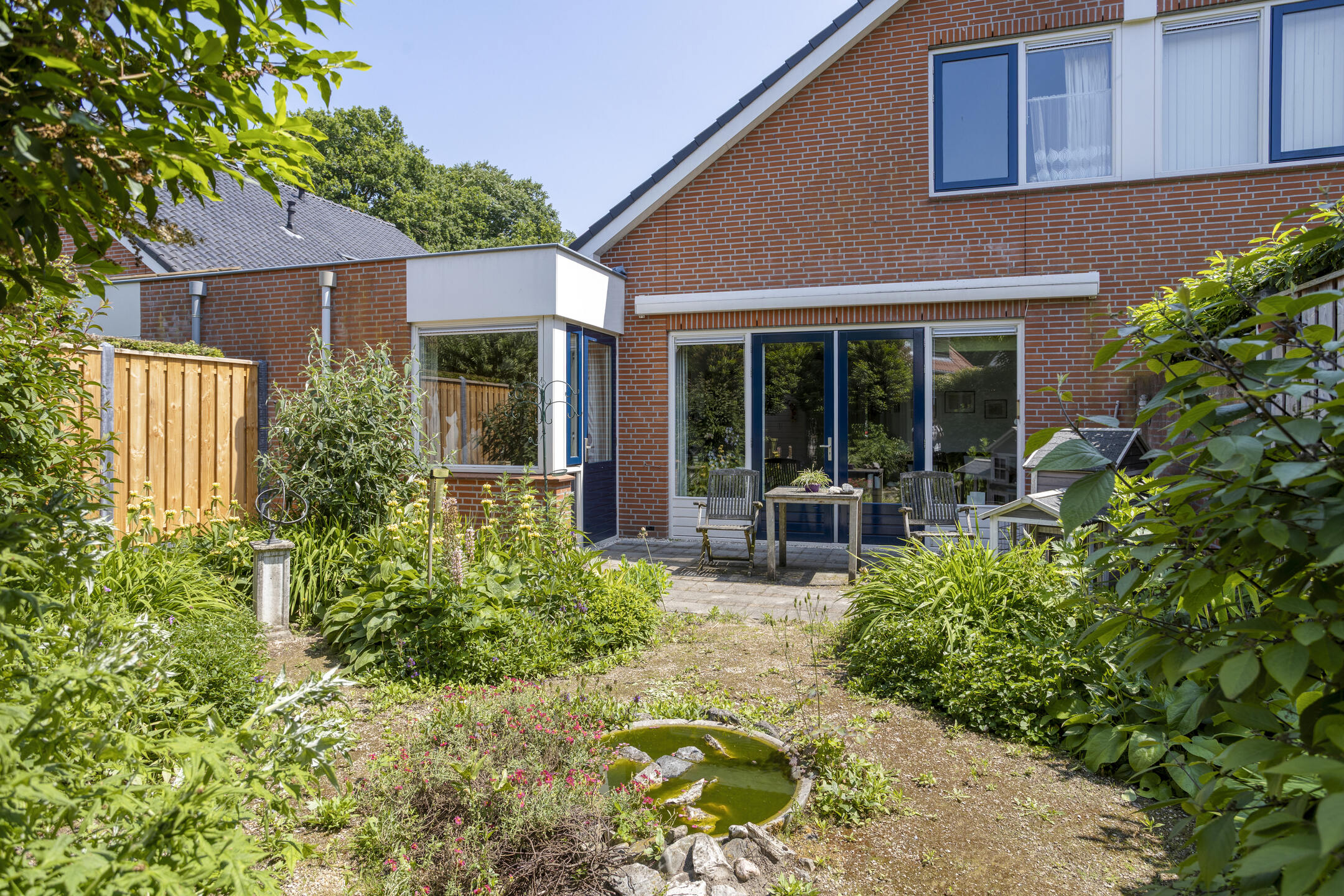 De achtertuin is zonnig gelegen en is voorzien van veel beplanting, terras en nieuwe schuttingen. Door de beschutte ligging geniet u hier van rust en privacy. Aan de voorzijde beschikt de woning over een brede oprit en een ruime garage met elektrisch bedienbare deur, ideaal voor stalling, hobbyruimte of opslag.
