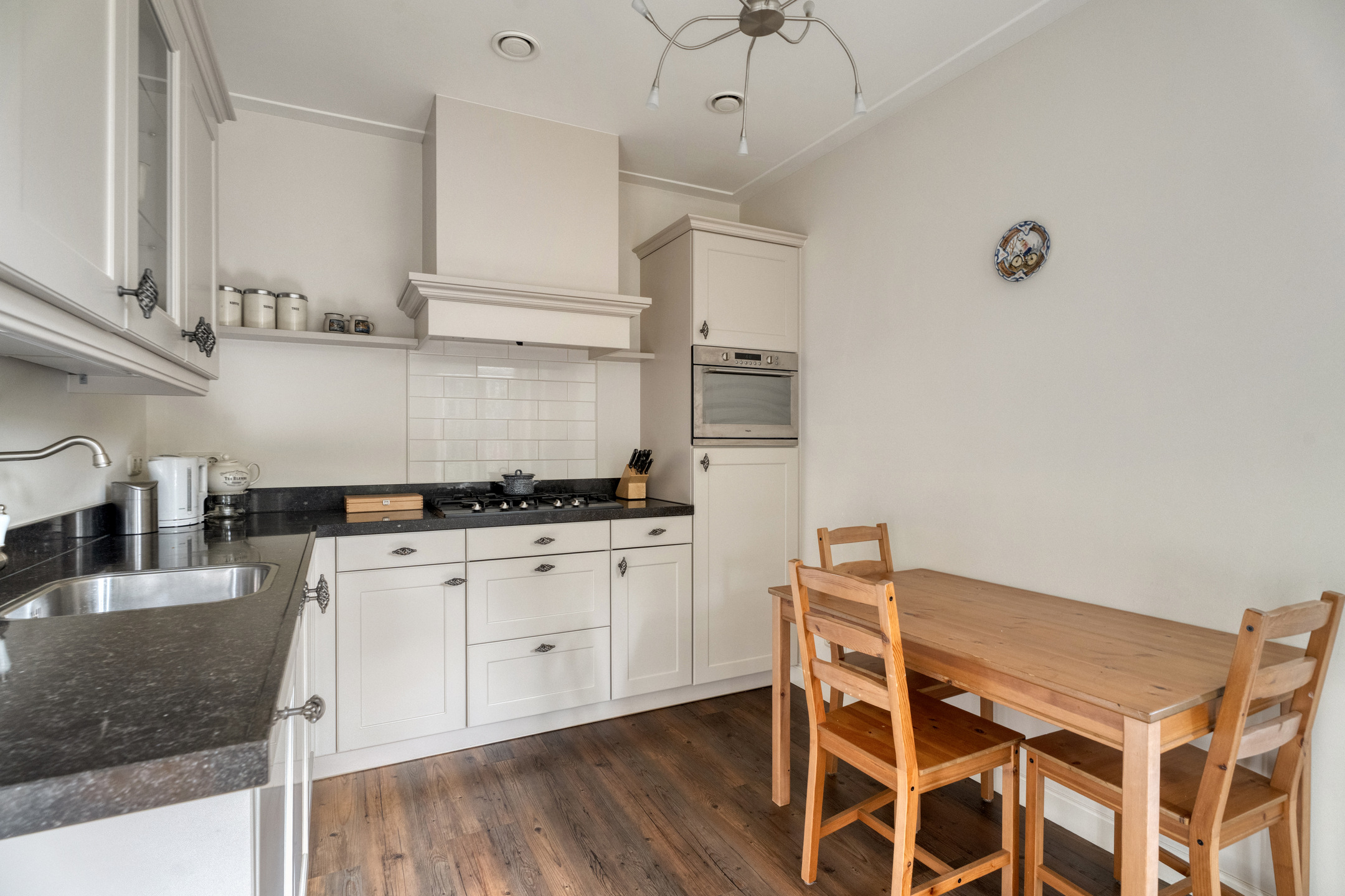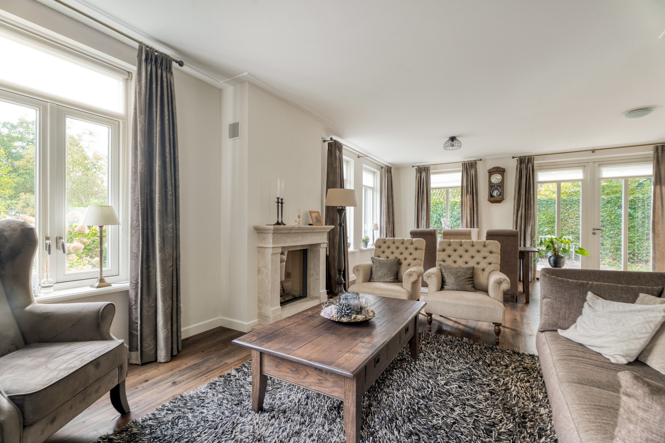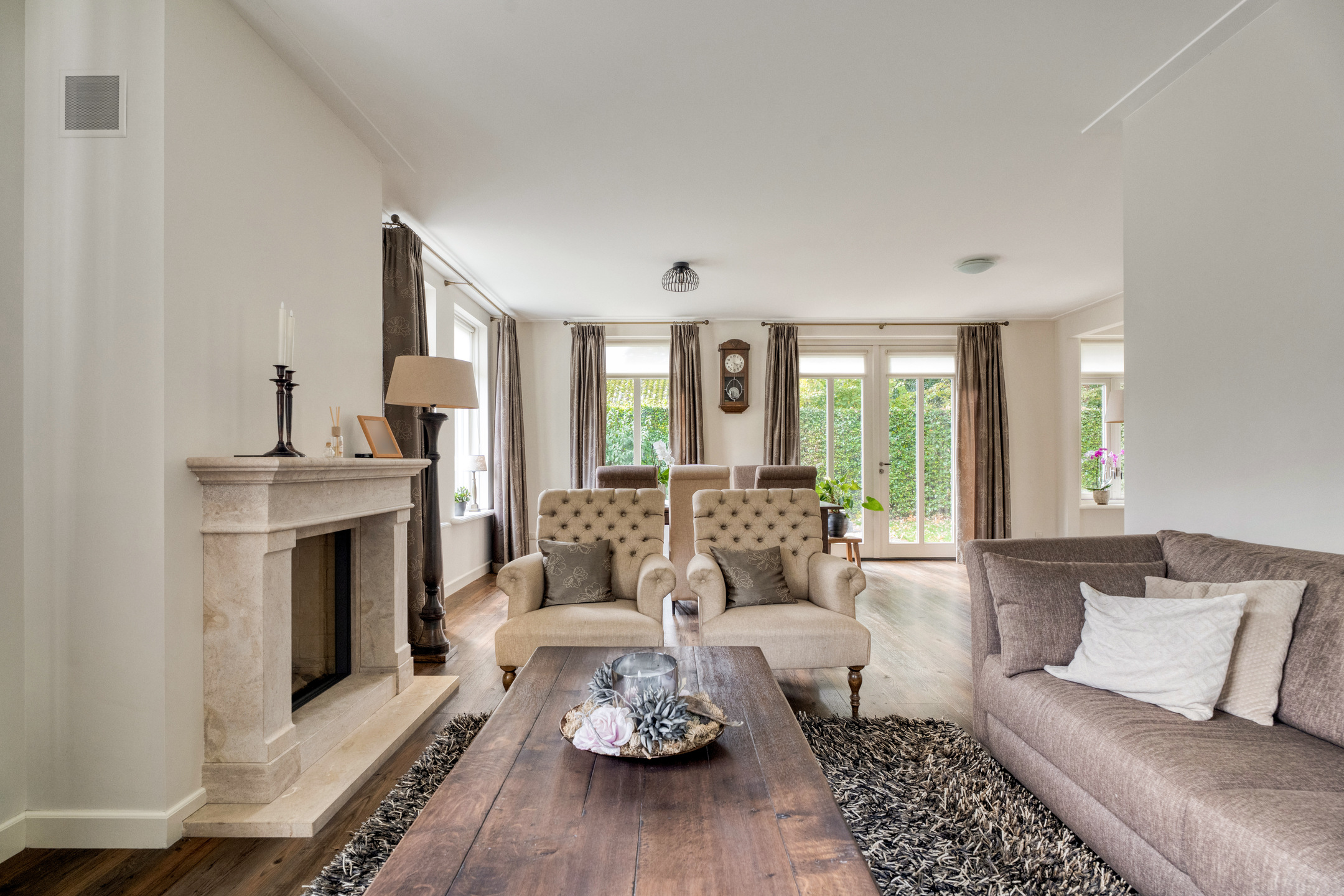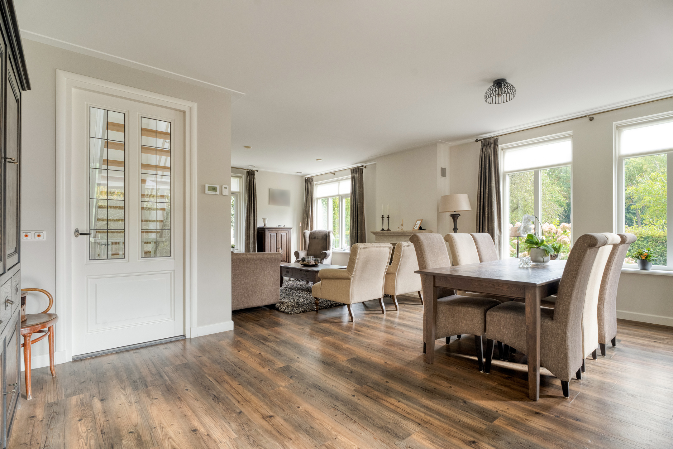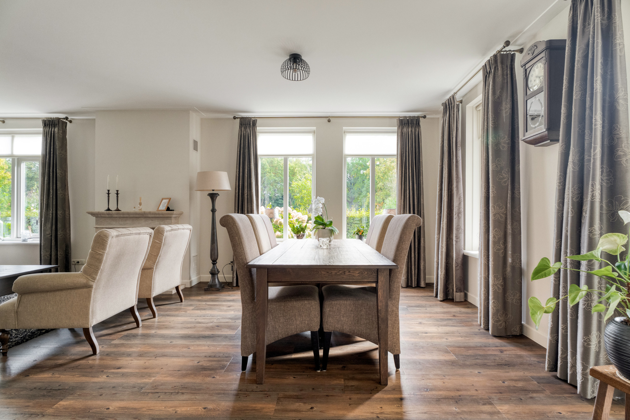 De royale L-vormige woonkamer, met gezellige gashaard, is heerlijk licht dankzij de grote raampartijen en openslaande deuren en biedt volop ruimte voor een zit- en eetgedeelte. Aan de achterzijde bevindt zich de dichte keuken met een nette keukenopstelling en voldoende werk- en kastruimte. Er is een mogelijkheid om de muur tussen de woonkamer en keuken te verwijderen, waardoor er een nog royalere open ruimte ontstaat. Via de keuken bereikt u de praktische bijkeuken met aansluitingen voor de witgoedapparatuur en achterdeur – ideaal als achterom.