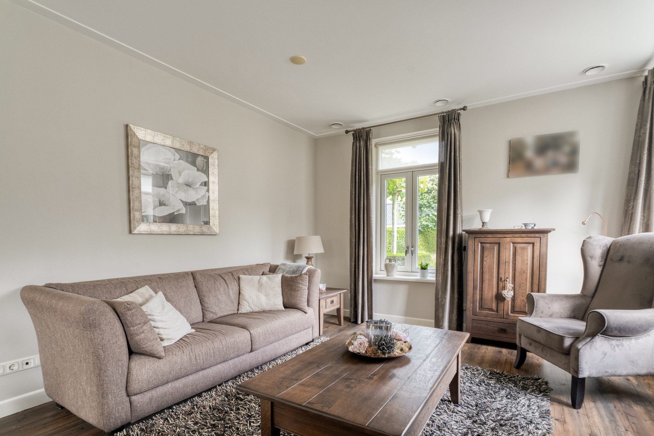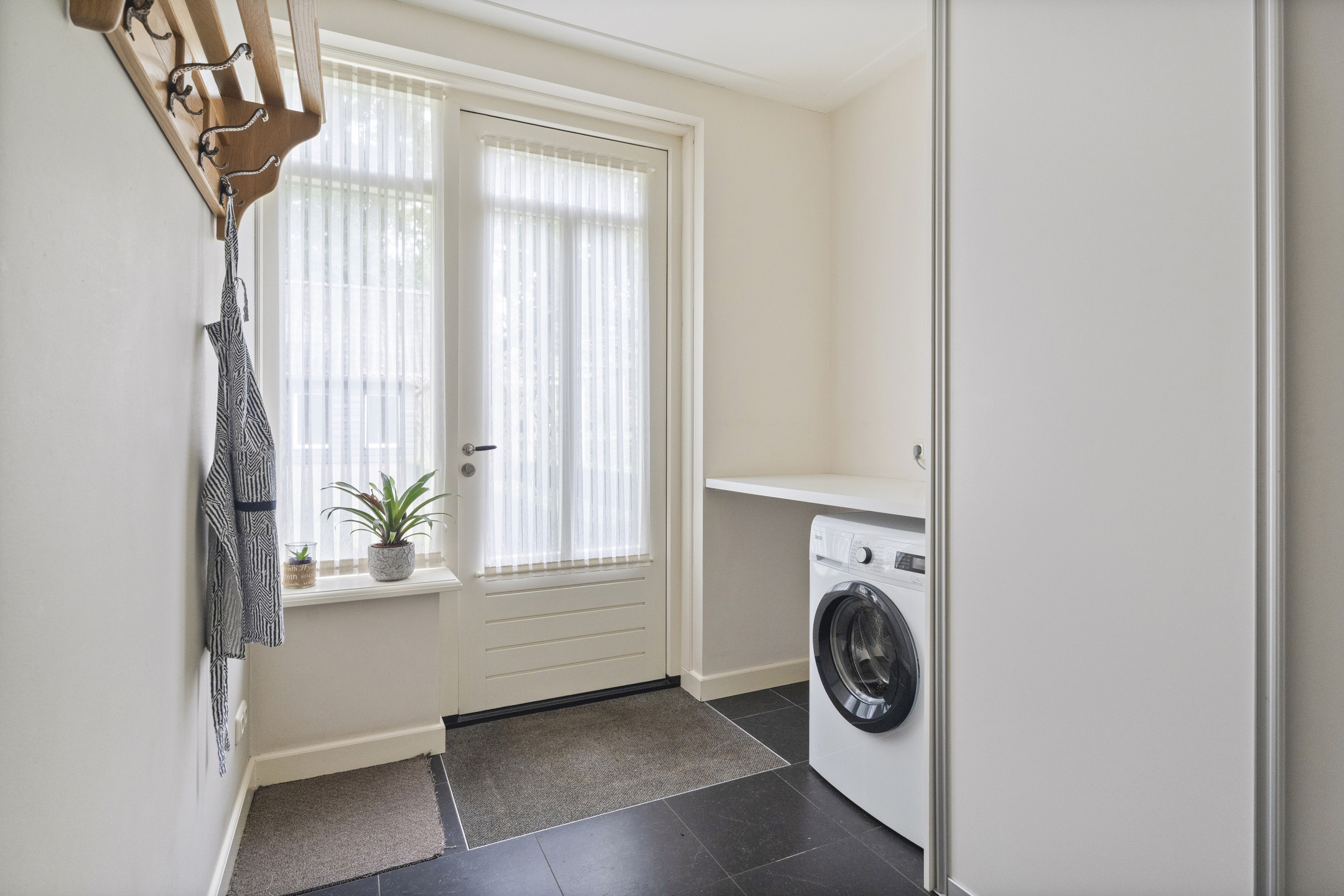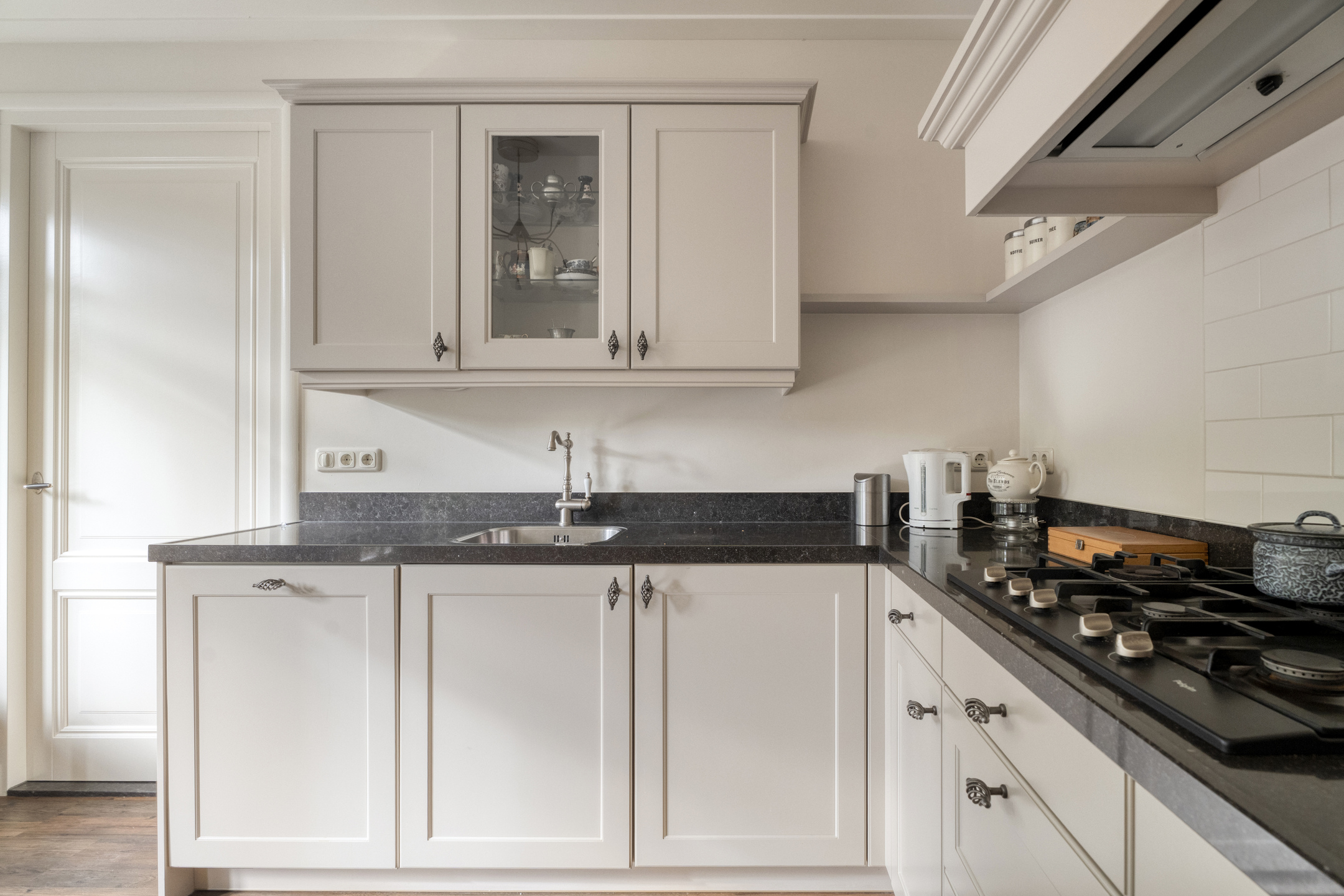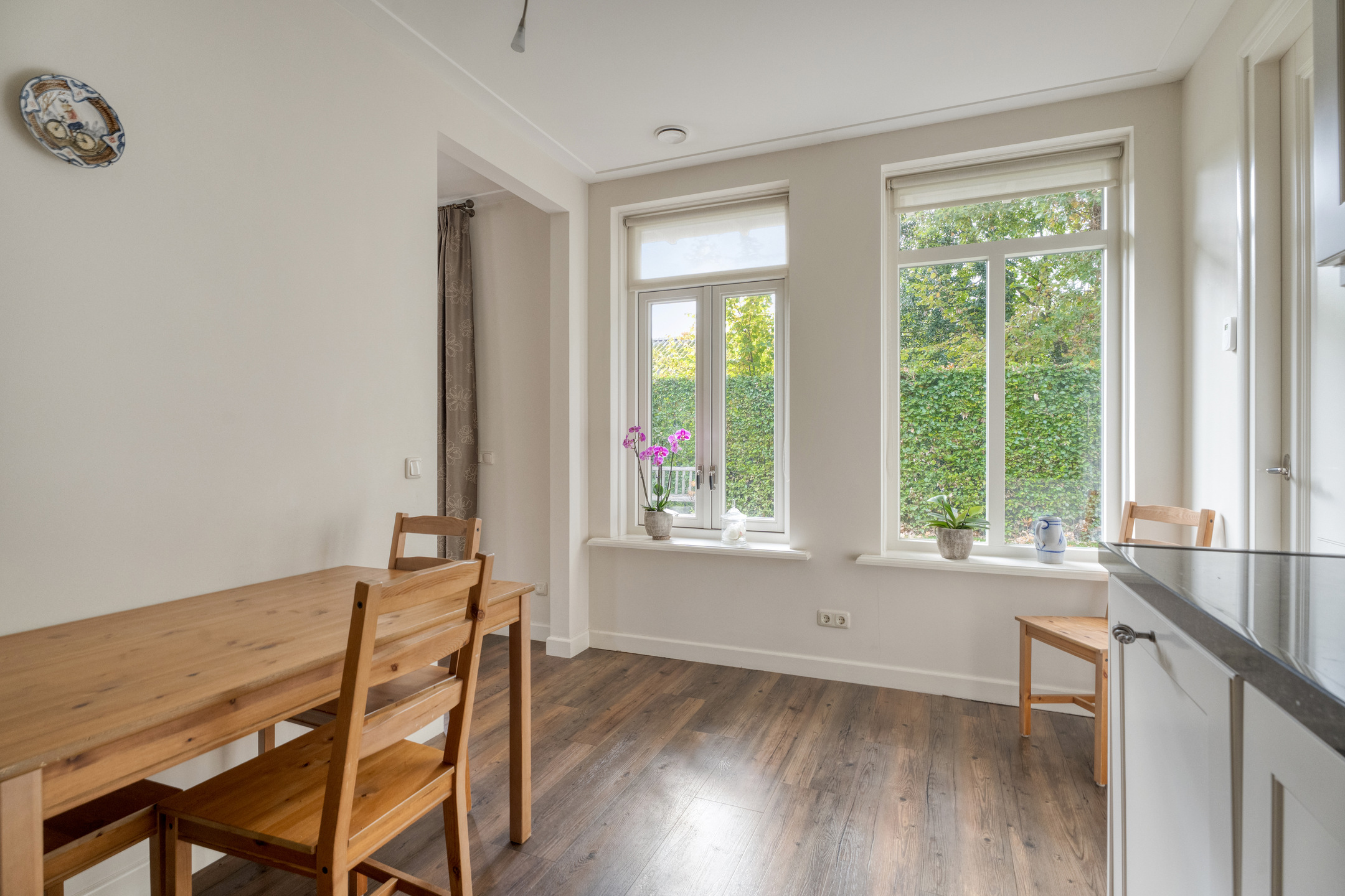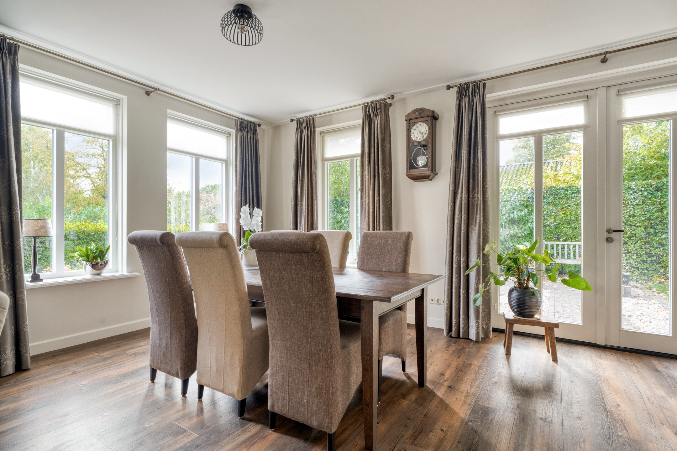 De royale L-vormige woonkamer, met gezellige gashaard, is heerlijk licht dankzij de grote raampartijen en openslaande deuren en biedt volop ruimte voor een zit- en eetgedeelte. Aan de achterzijde bevindt zich de dichte keuken met een nette keukenopstelling en voldoende werk- en kastruimte. Er is een mogelijkheid om de muur tussen de woonkamer en keuken te verwijderen, waardoor er een nog royalere open ruimte ontstaat. Via de keuken bereikt u de praktische bijkeuken met aansluitingen voor de witgoedapparatuur en achterdeur – ideaal als achterom.