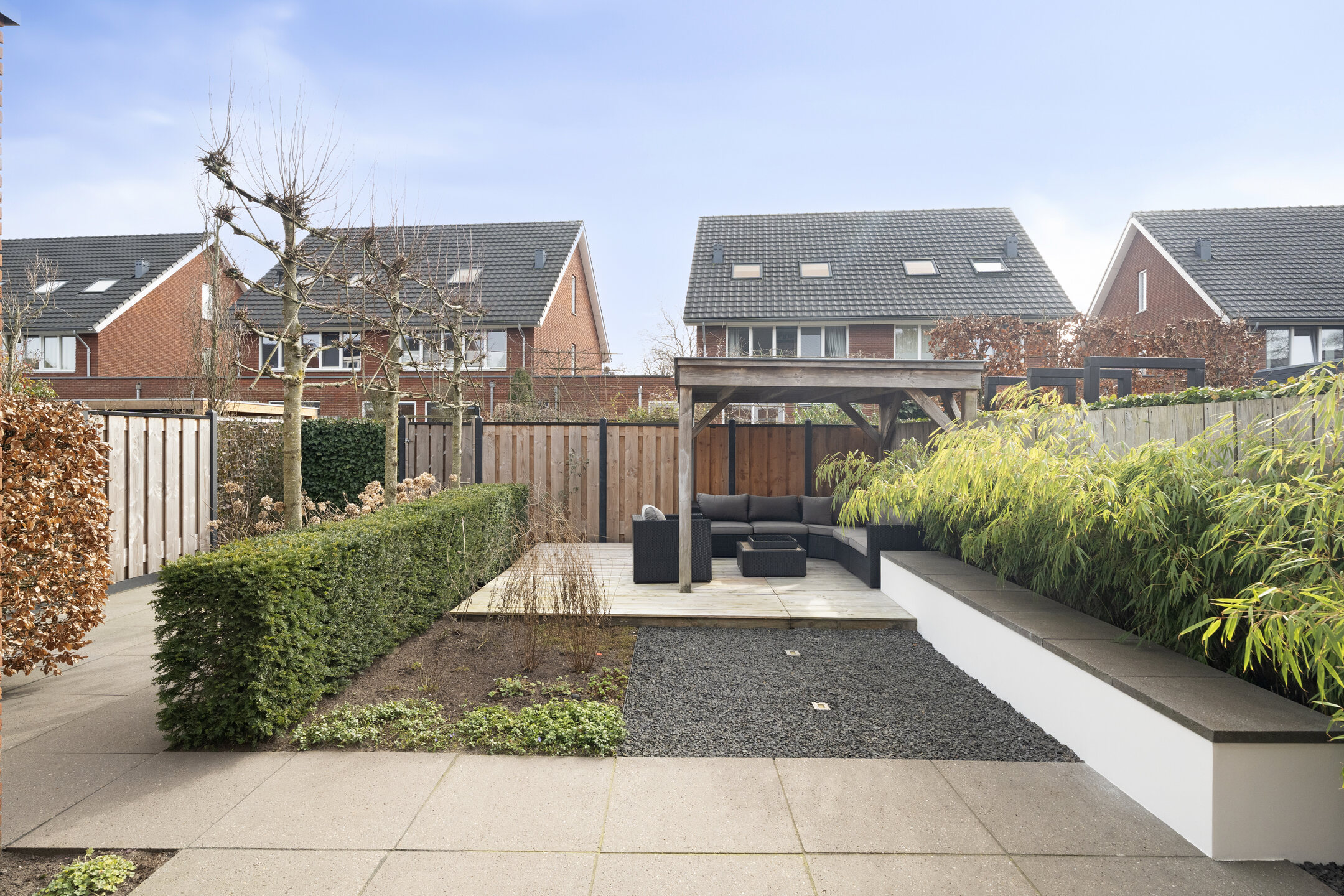 Direct achter de woning ligt een ruim terras en verderop in de tuin is een sfeervolle houten overkapping geplaatst. Dit is een heerlijke plek om met familie of vrienden buiten te zitten. De tuin is verzorgd aangelegd met een combinatie van groen, bestrating en een verhoogde plantenbak, wat zorgt voor een stijlvolle en rustige uitstraling.