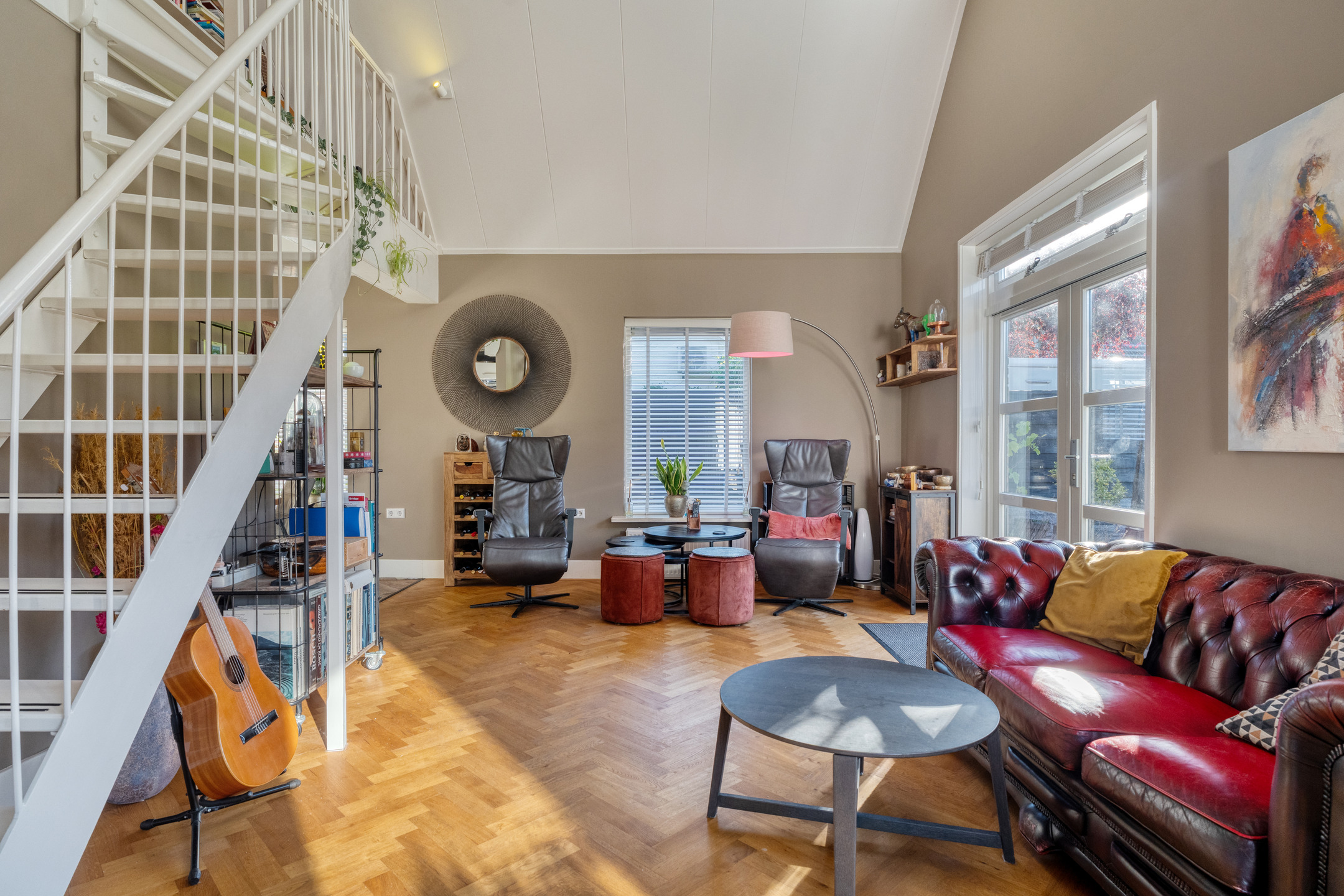 Aan de voorzijde van de woning bevindt zich de lichte woonkamer, met een plafond tot in de nok en een fraaie vide die het geheel een bijzonder ruimtelijk gevoel geeft. Grote raampartijen, waaronder dubbele tuindeuren, zorgen voor veel daglicht en verbinden binnen met buiten. De parketvloer in visgraatpatroon en de open trap geven de ruimte extra karakter.