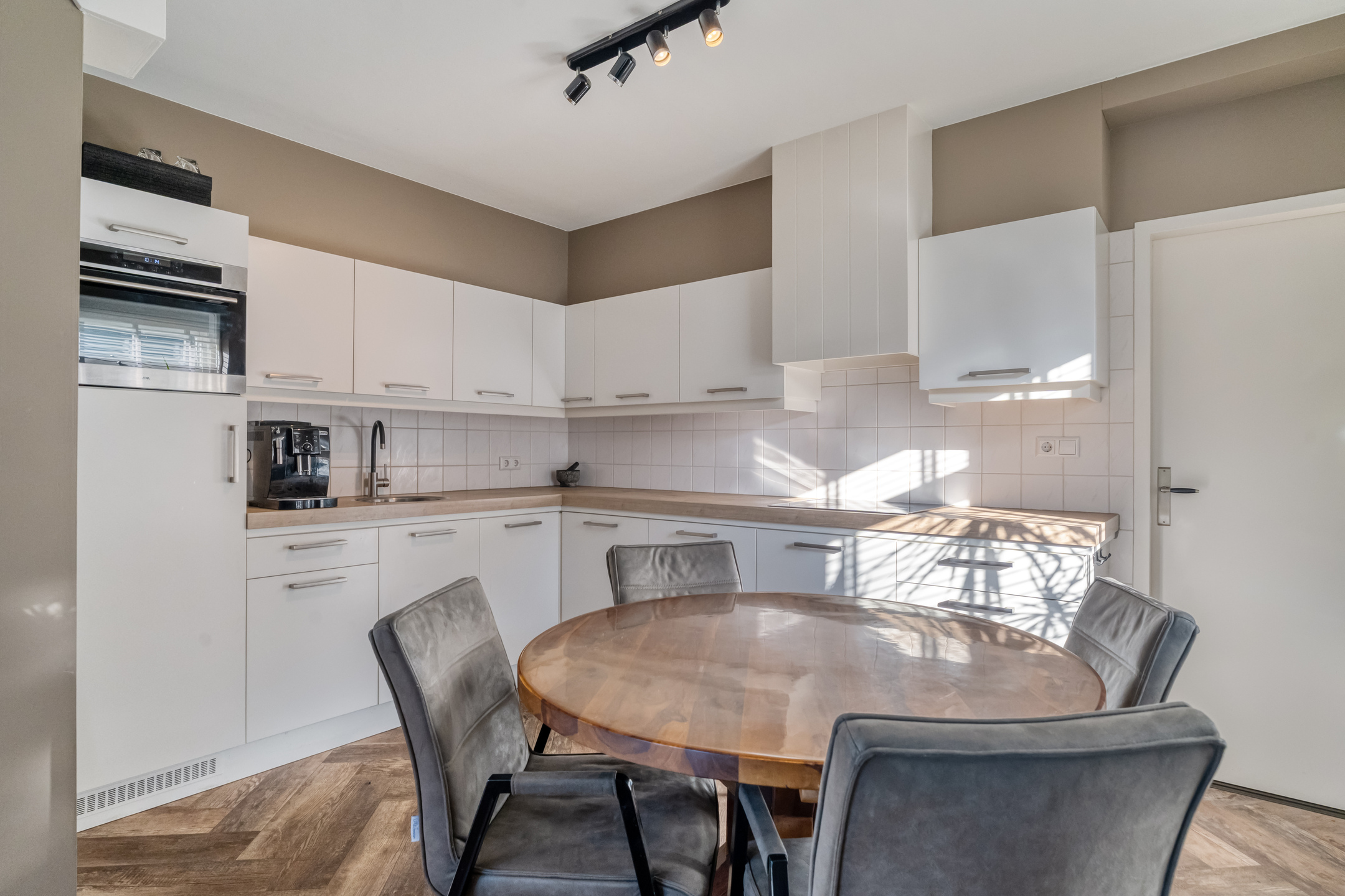 De keuken is praktisch opgesteld in een lichte hoekopstelling, met volop werkruimte, moderne apparatuur en ruimte voor een eethoek.