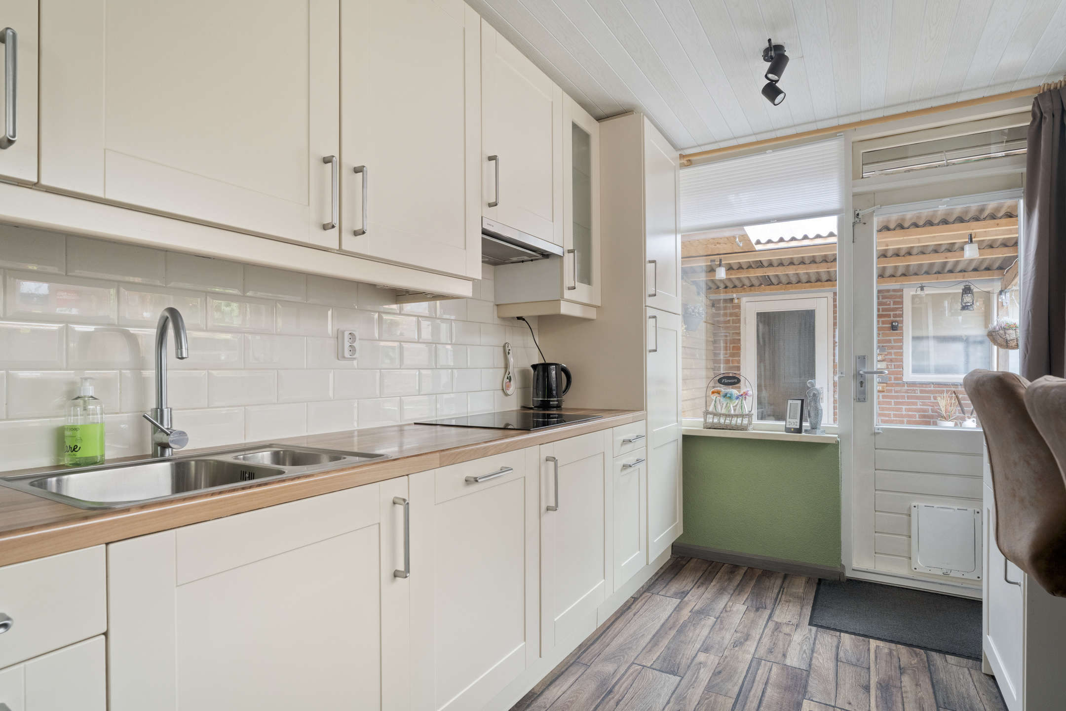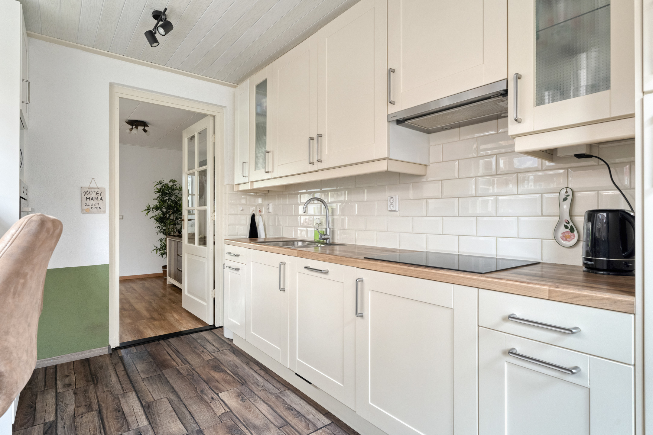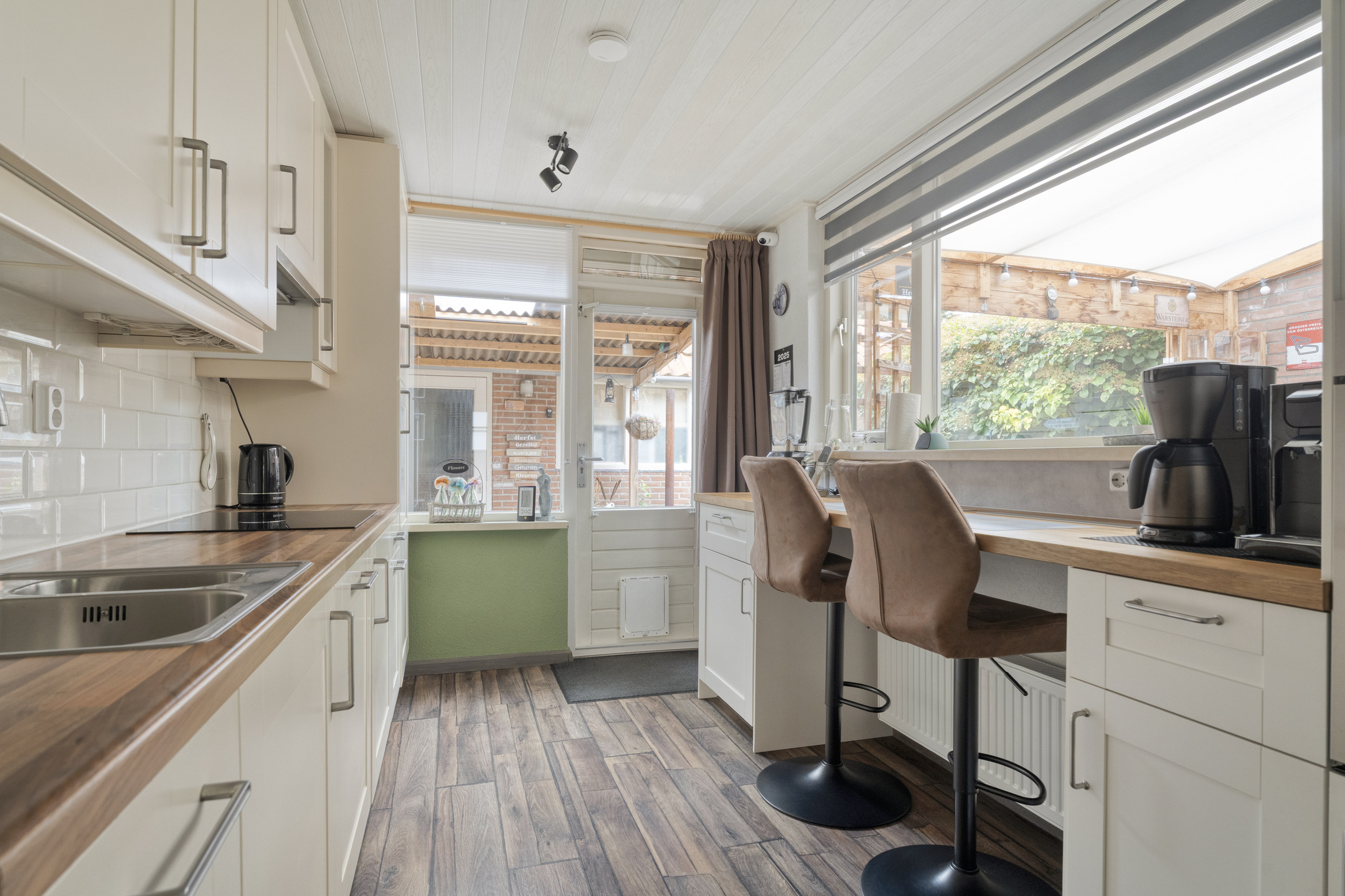 De halfopen keuken bevindt zich aan de achterzijde en is voorzien van een moderne opstelling met veel werk- en bergruimte. Dankzij het grote raam en de baropstelling heb je hier een fijn uitzicht op de tuin. Vanuit de keuken is er toegang tot de overkapping, een heerlijke plek om ook bij minder weer buiten te zitten.
