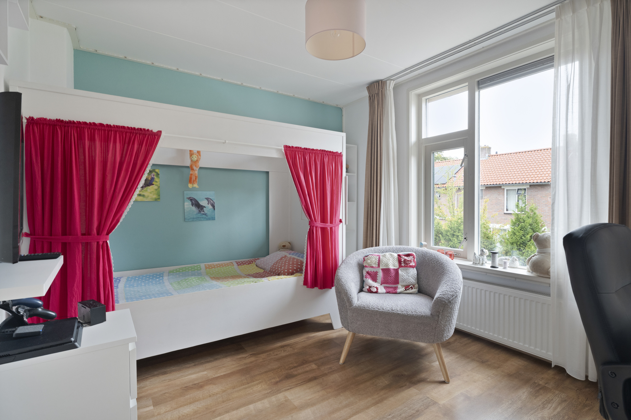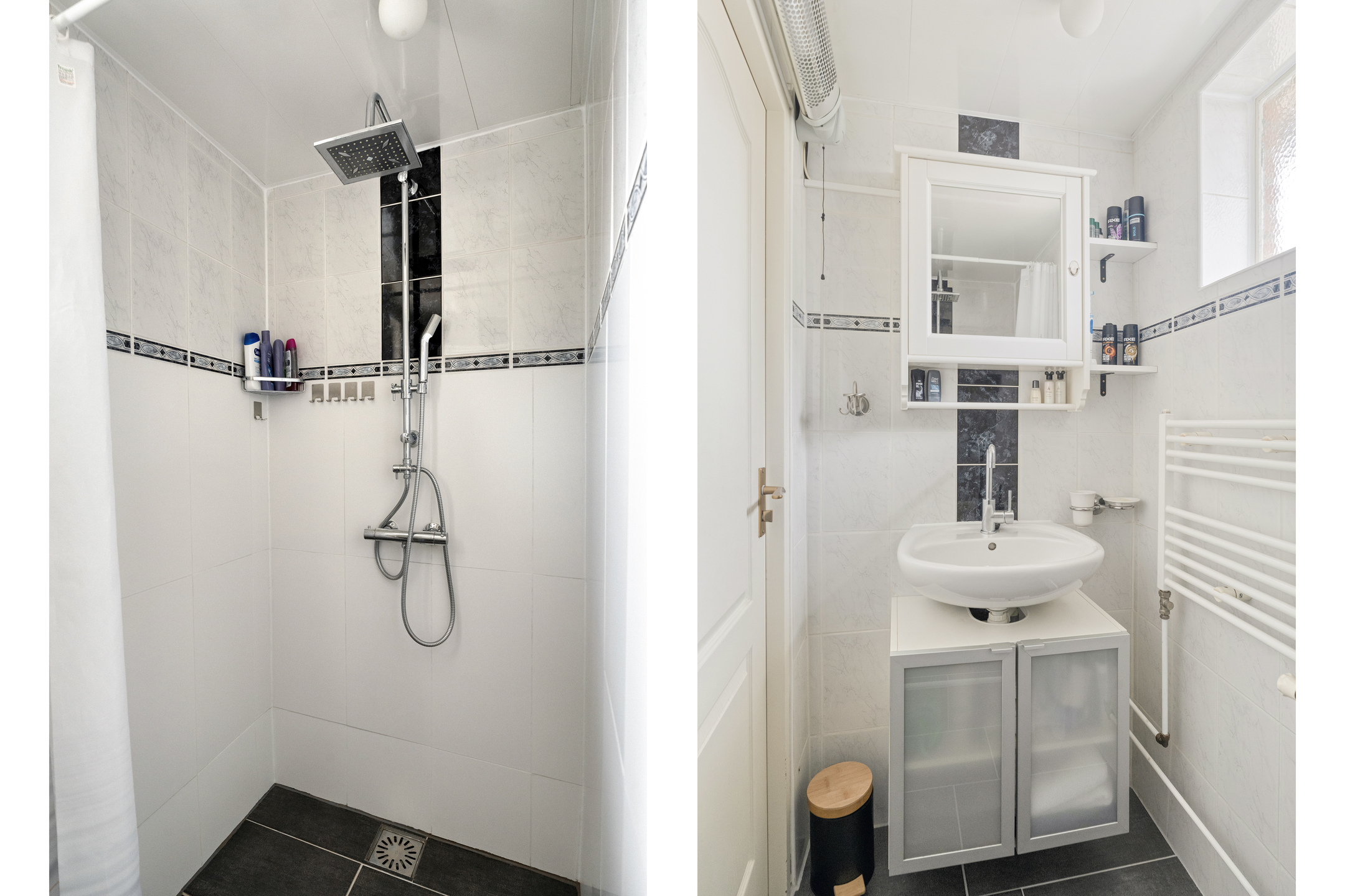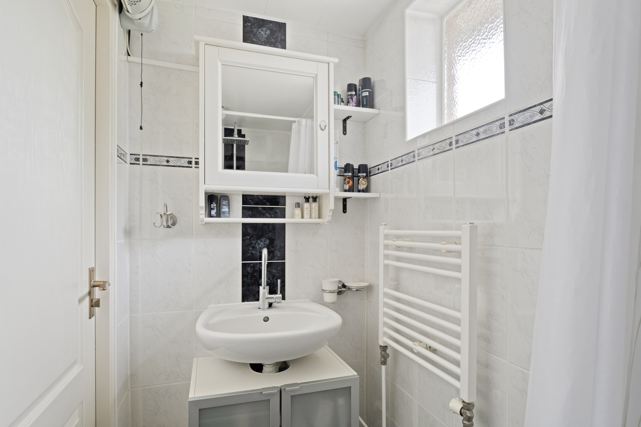 Op de eerste verdieping tref je drie nette slaapkamers aan, waarvan twee met vaste kastruimte. De kamer aan de achterzijde beschikt zelfs over een deur naar het balkon, een fijne plek voor je eerste kop koffie in de ochtendzon. De badkamer is compact maar praktisch en voorzien van een douche, wastafel en radiator.
