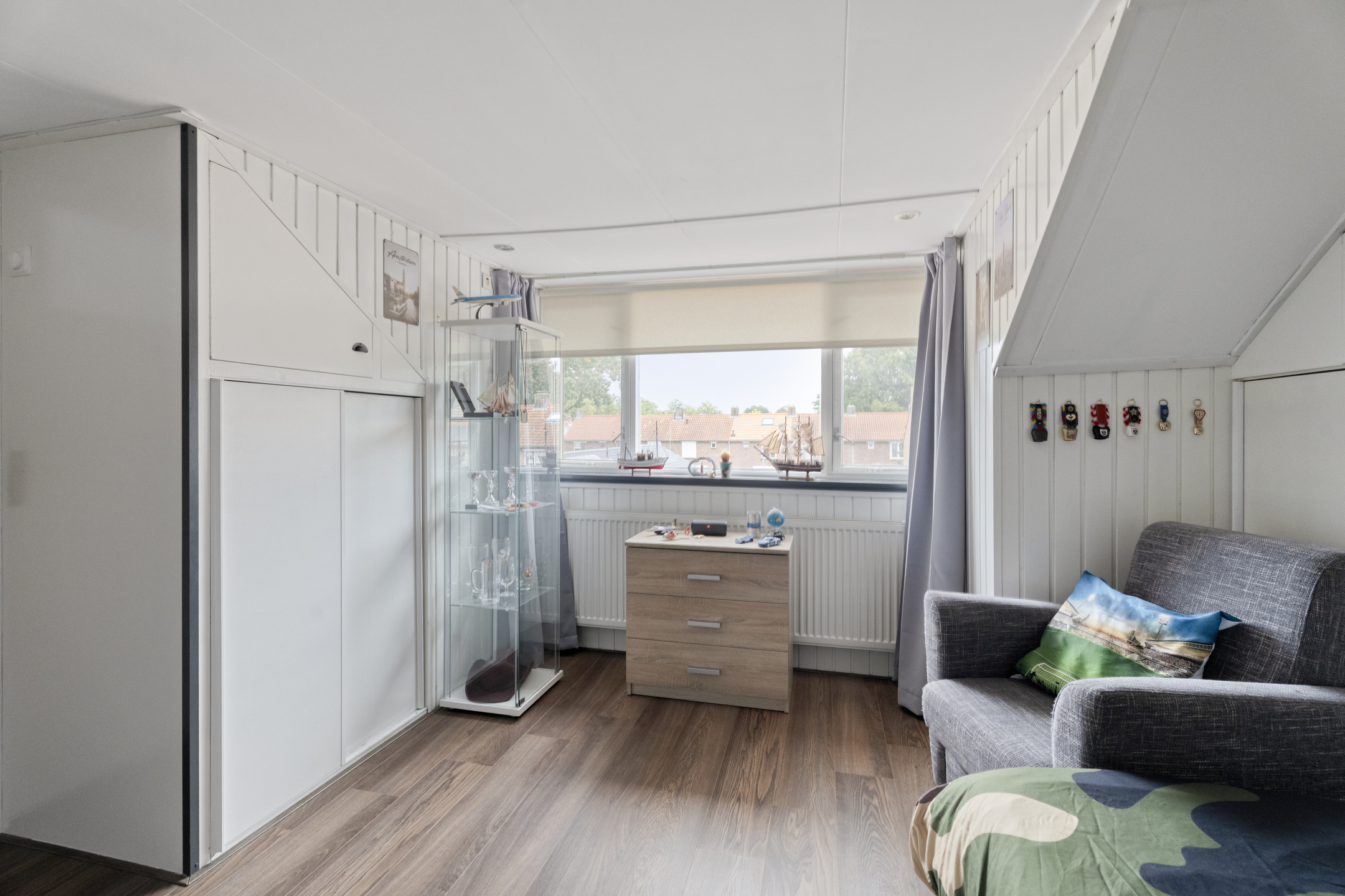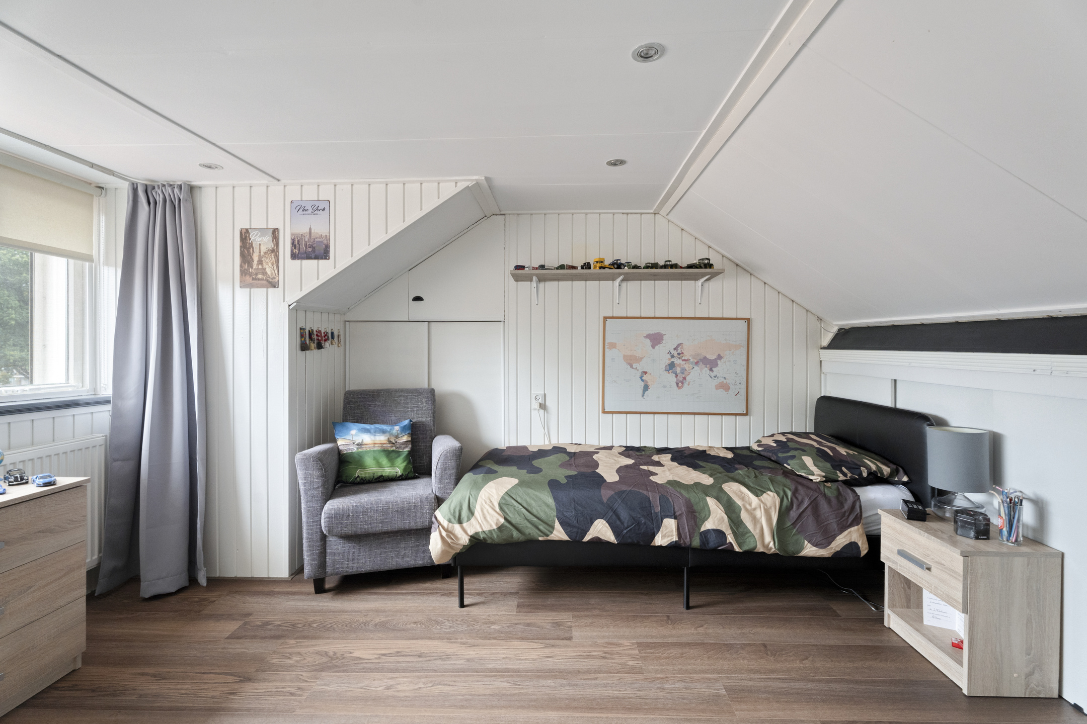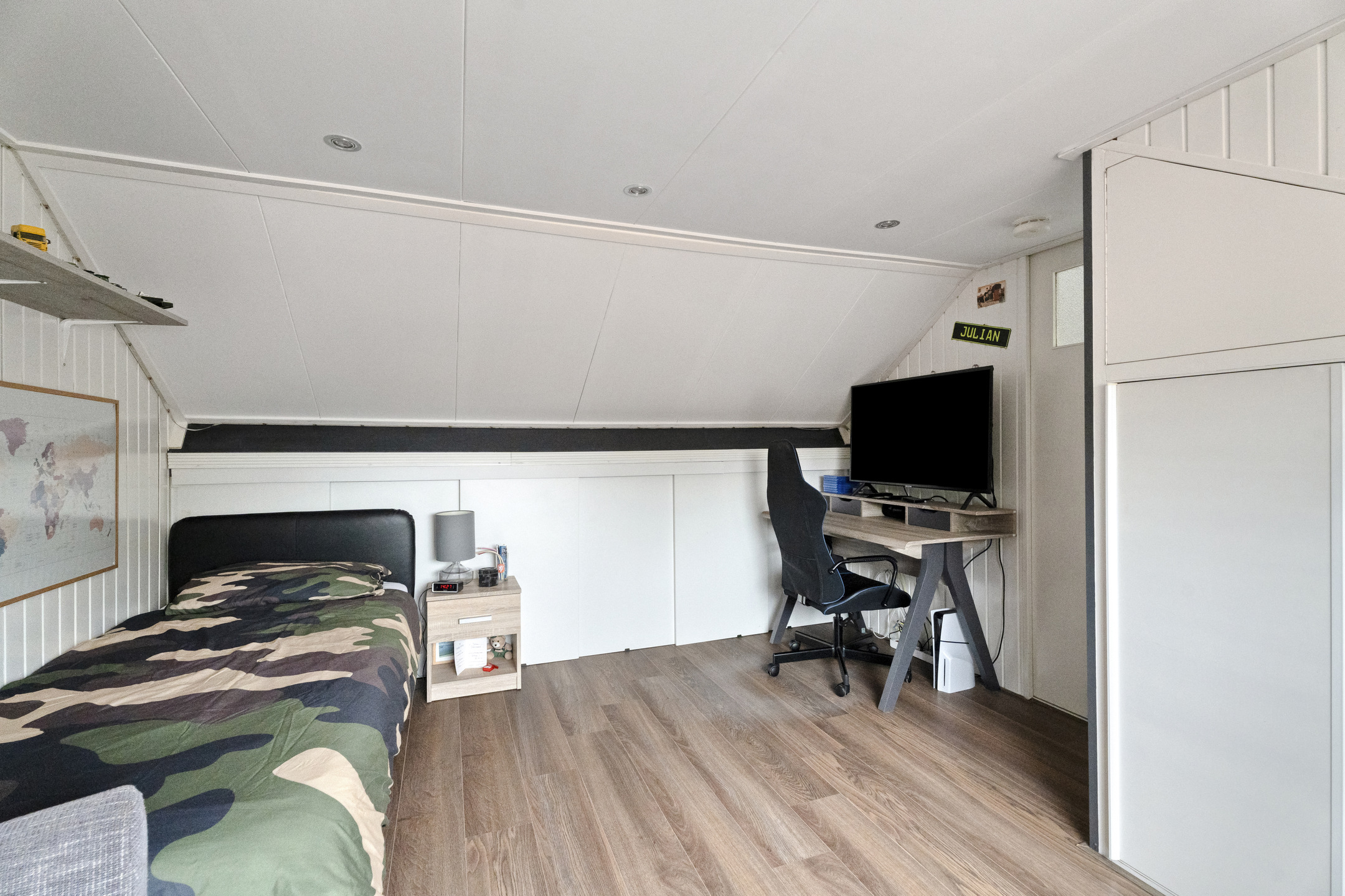 Een vaste trap leidt naar de verrassend ruime zolderverdieping, waar een vierde slaapkamer is gerealiseerd. Dankzij de dakkapel is hier volop daglicht aanwezig. Daarnaast is er op de overloop ruimte voor de wasmachine en extra bergruimte achter de knieschotten.