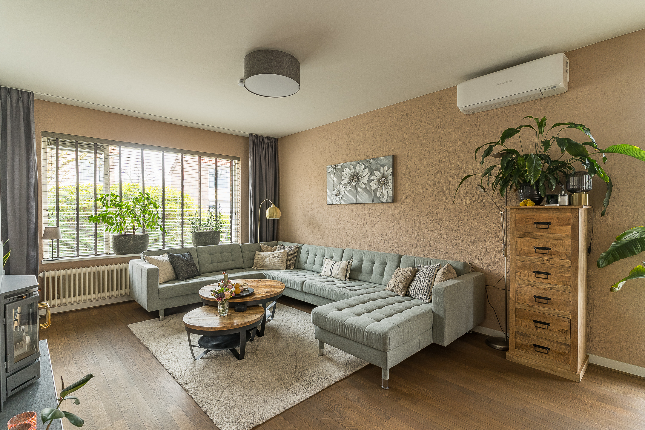 Eenmaal in de woonkamer is extra duidelijk dat het hier om een echte gezinswoning gaat. Daarnaast zal het hoogwaardige afwerkingsniveau u zeker opvallen! Dankzij de forse uitbouw is er een royale woonkamer aan de voorzijde en een forse keuken aan de achterzijde ontstaan. De L-vormige woonkamer biedt een fijn zitgedeelte aan de voorzijde waar u geniet van veel privacy. De hoge beplanting in de voortuin ontneemt het zicht naar binnen, zonder al te veel daglicht te blokkeren. Hierdoor is de woonkamer toch aangenaam licht. Als extraatje is er een openhaard bij het zitgedeelte gesitueerd.
