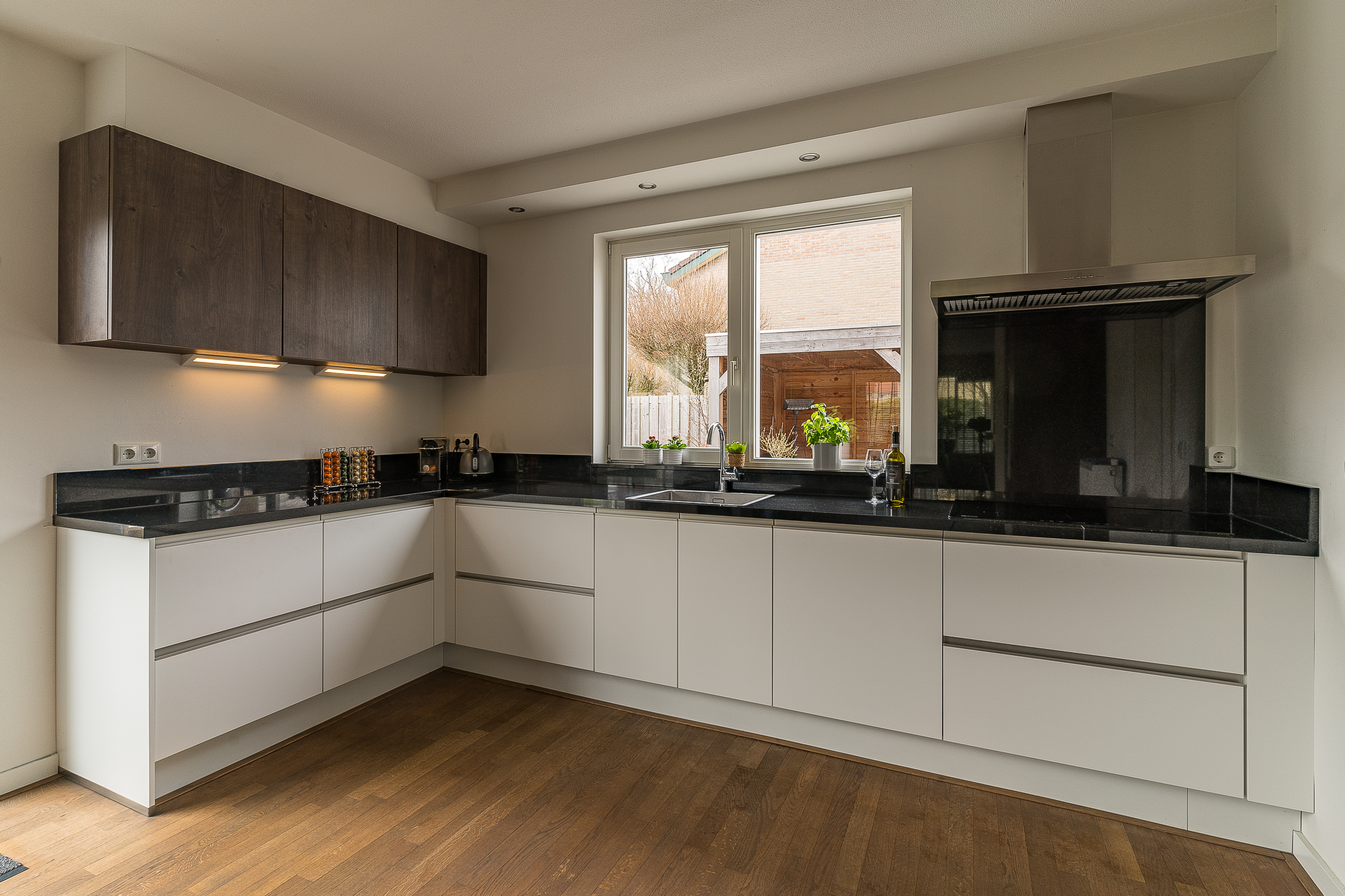 Verder is er in de woonkamer volop ruimte voor een grote eettafel waar u met het hele gezin aan kunt eten. Via dit eetgedeelte komt u in de royale keuken terecht, waar een strakke keukenopstelling uit 2020 is gesitueerd. De keukenopstelling bestaat uit een breed aanrecht in hoekvorm en twee kastenwanden. Koken doet u op inductie en in één van de kastenwanden treft u een magnetron en een oven. Vanuit de keuken komt u via een schuifpui op het terras naast de woning, waar u gezellig buiten kunt eten.