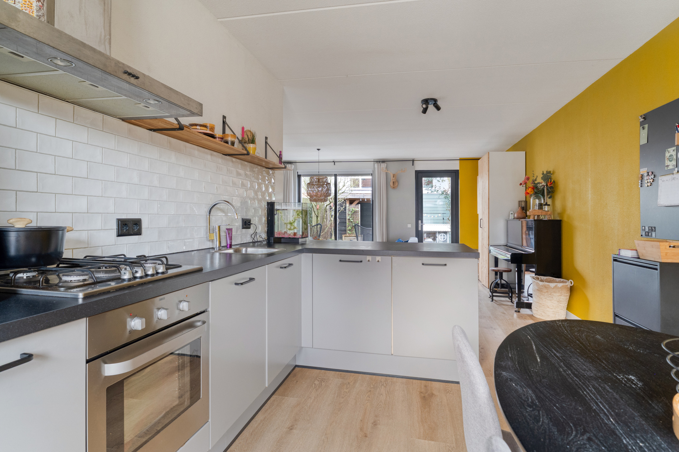 Aan de voorzijde van de woning ligt de open keuken, uitgevoerd in een L-opstelling. Er is veel werk- en bergruimte aanwezig, diverse inbouwapparatuur, strakke betegeling en plek voor een gezellige eethoek met zicht op de rustige straat.