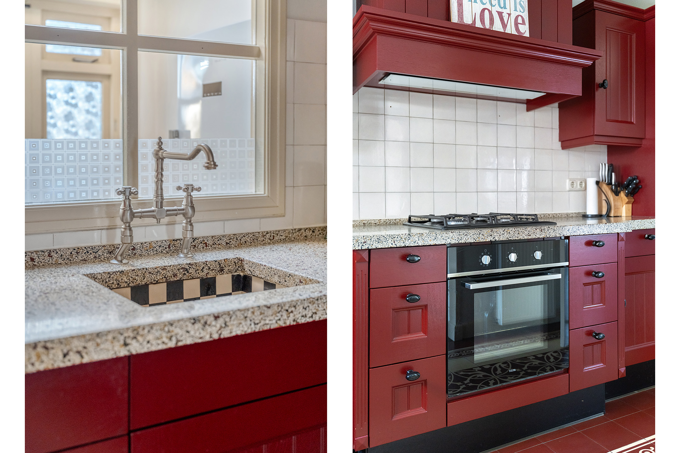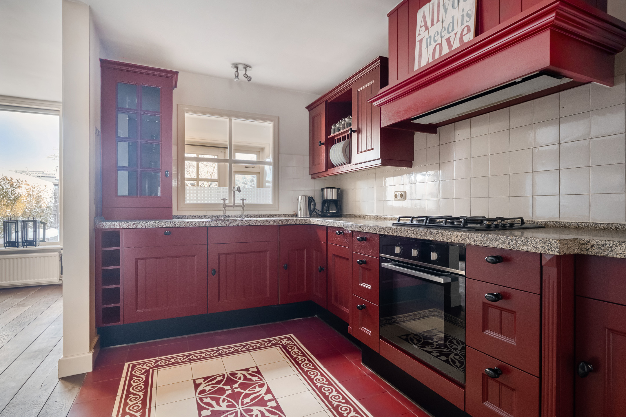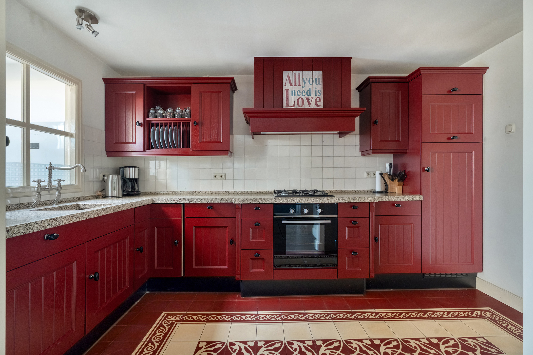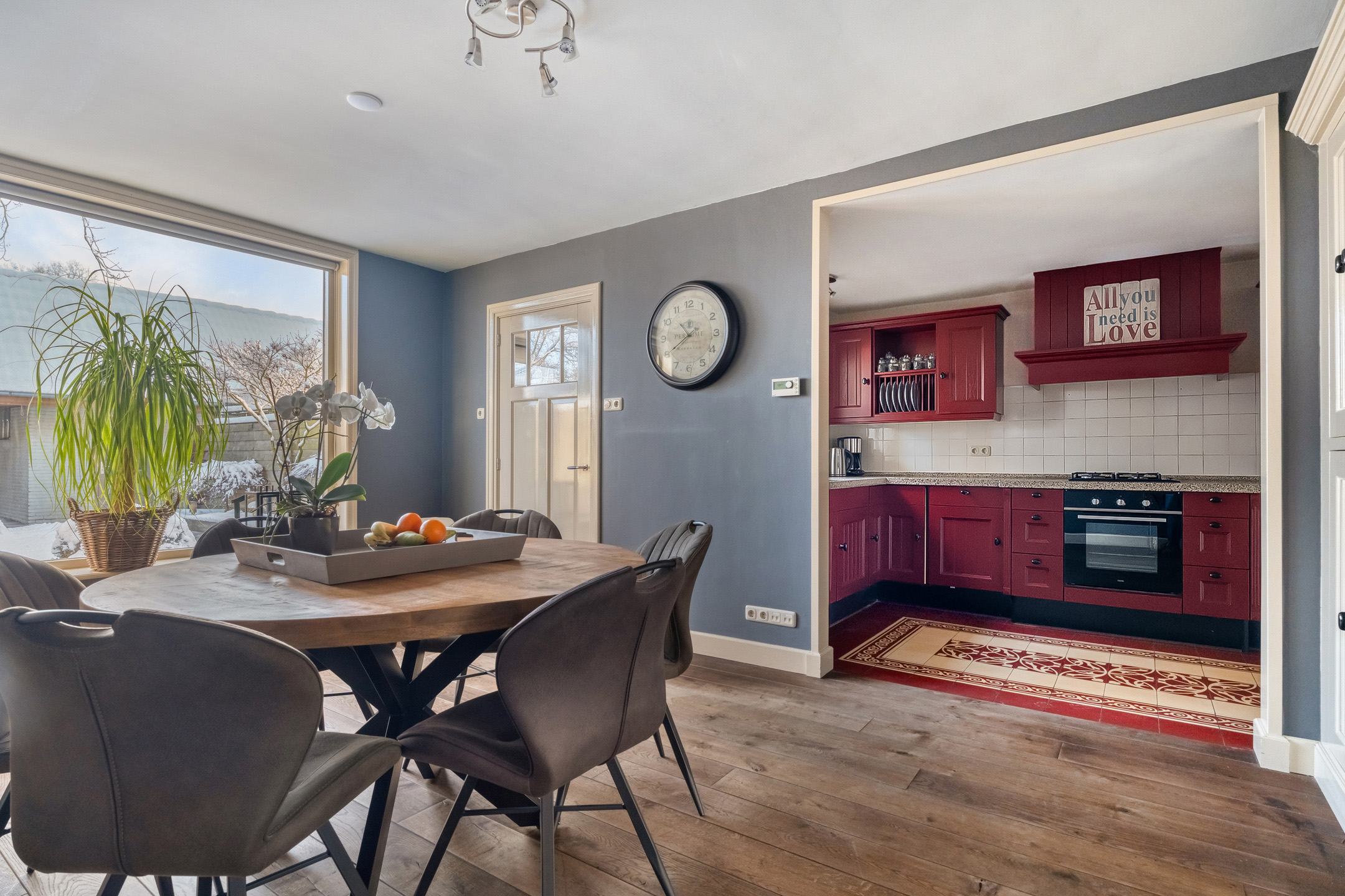 Via ensuite deuren met vaste kast bereik je het eetgedeelte aan de achterzijde. Hier is volop ruimte voor een grote eettafel, met zicht op de tuin. De landelijke leefkeuken is uitgevoerd in L-opstelling, voorzien van gaskookplaat, oven en volop werk- en bergruimte. Aangrenzend is een praktische bijkeuken met plek voor de witgoedapparatuur en extra opslag.