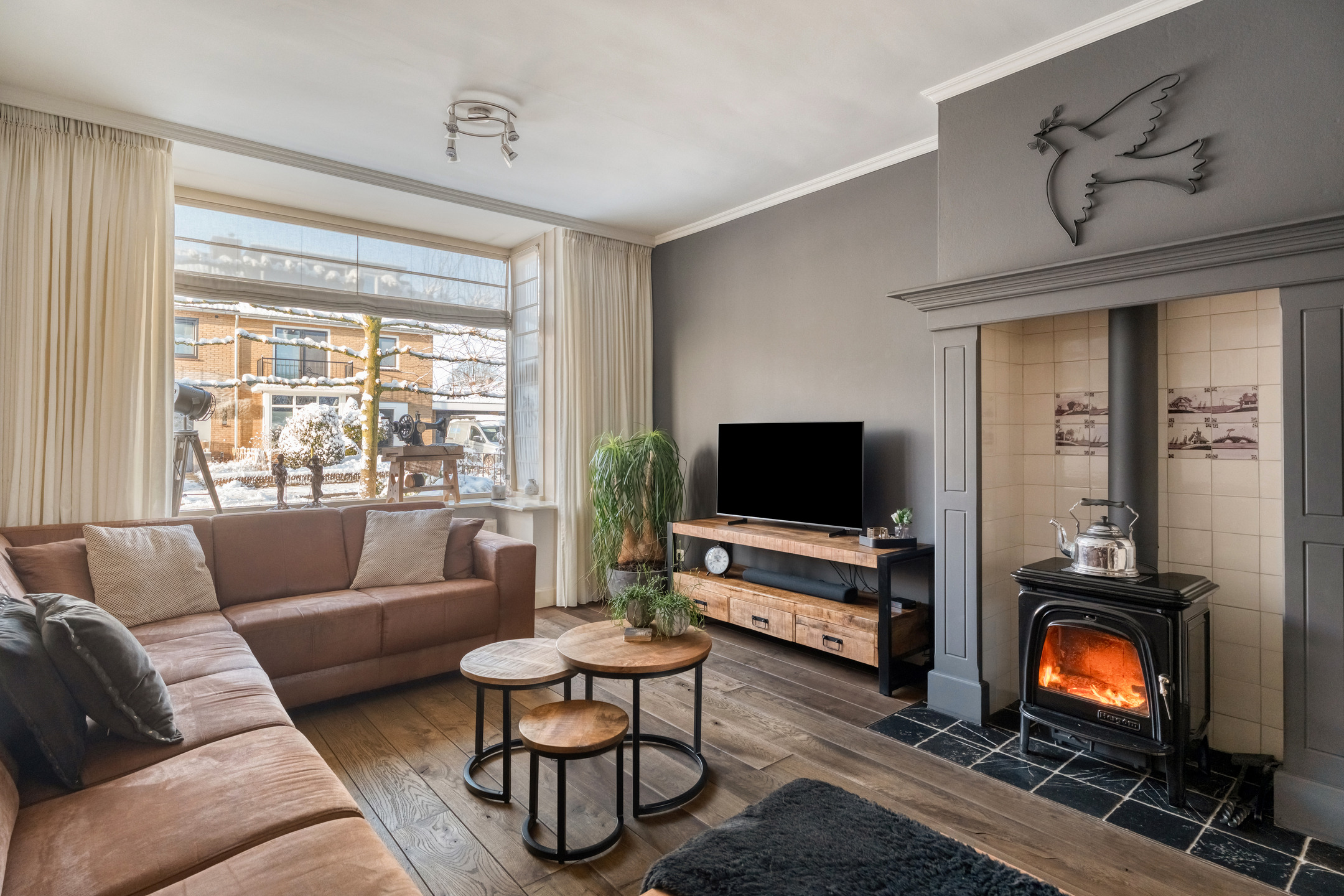 Via de verzorgde voortuin stap je binnen in een ruime hal met trapopgang, toilet, garderobe en twee handige bergkasten. De woonkamer aan de voorzijde is heerlijk licht en sfeervol ingericht met een houtkachel en een erker wat zorgt voor extra lichtinval en ruimte.