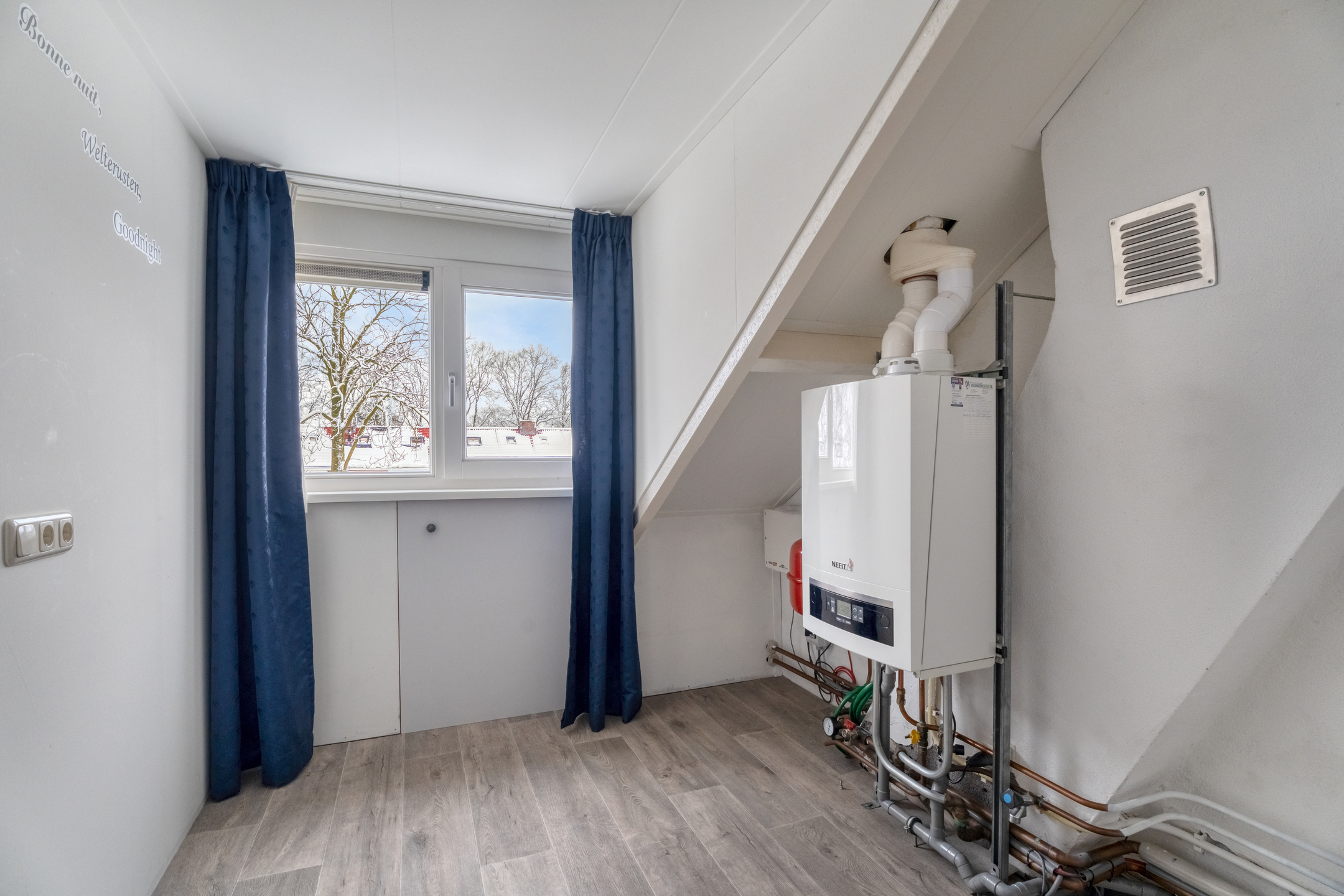 De vaste trap brengt je naar de zolderverdieping, waar een ruime vierde slaapkamer is gerealiseerd. Deze kamer beschikt over een dakkapel over de volledige breedte en knieschotten met bergruimte. Ook op de overloop zijn vaste kasten aanwezig en is er plek voor de CV-installatie.