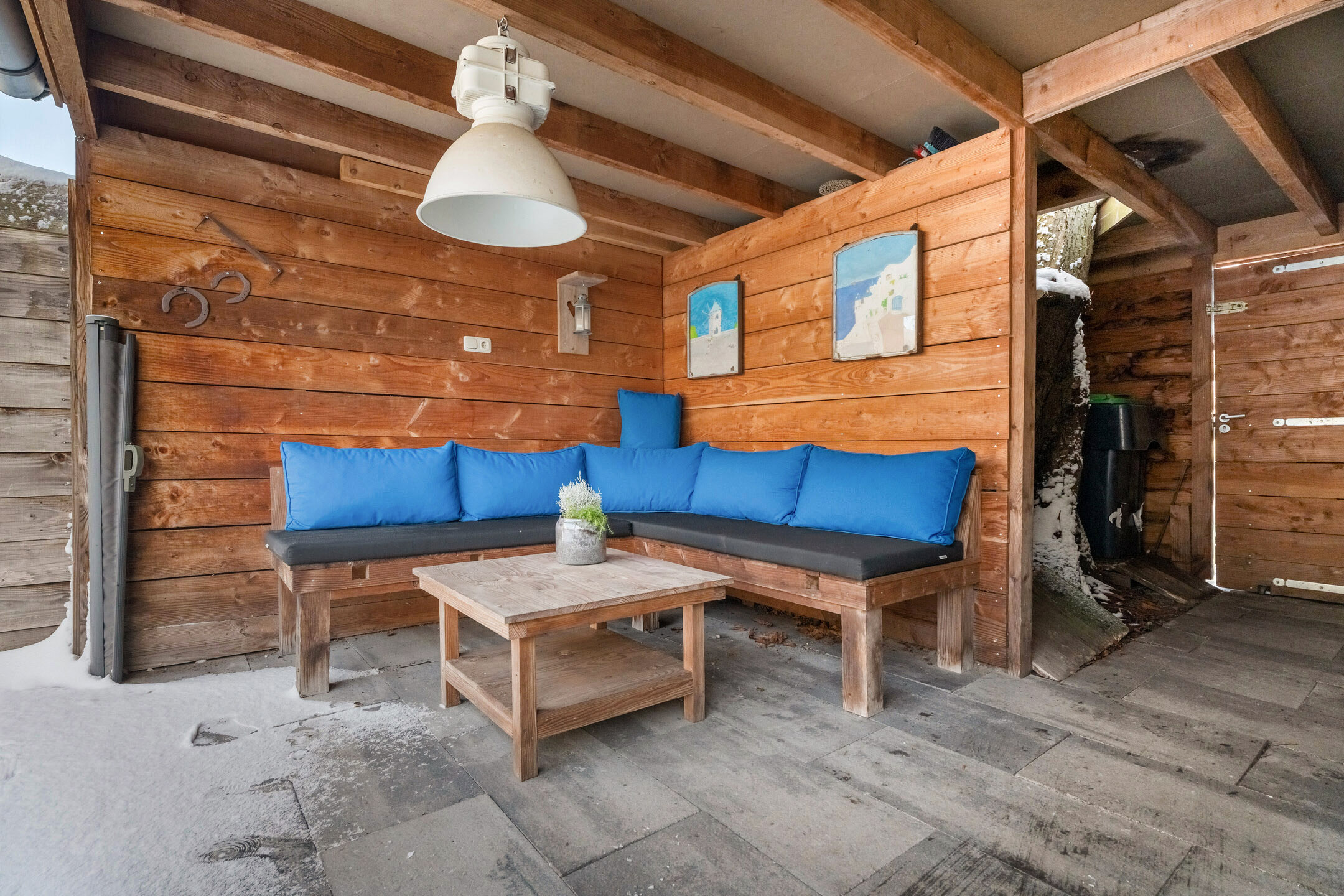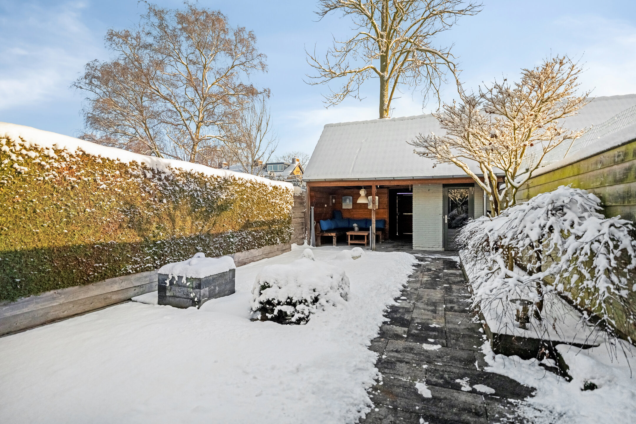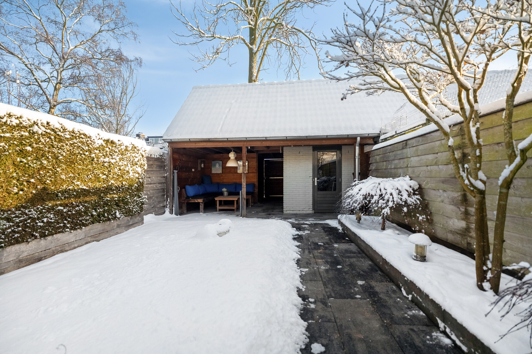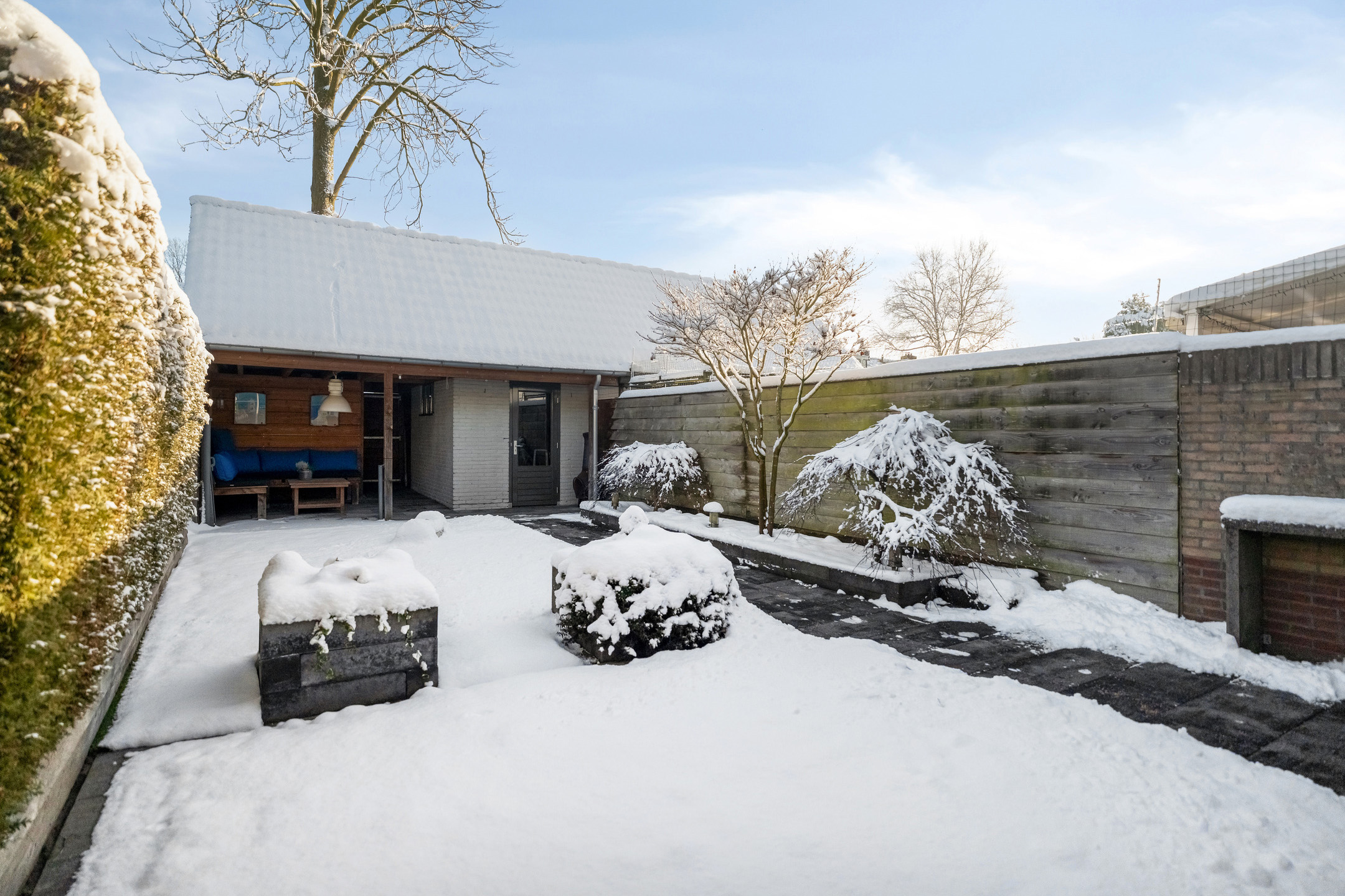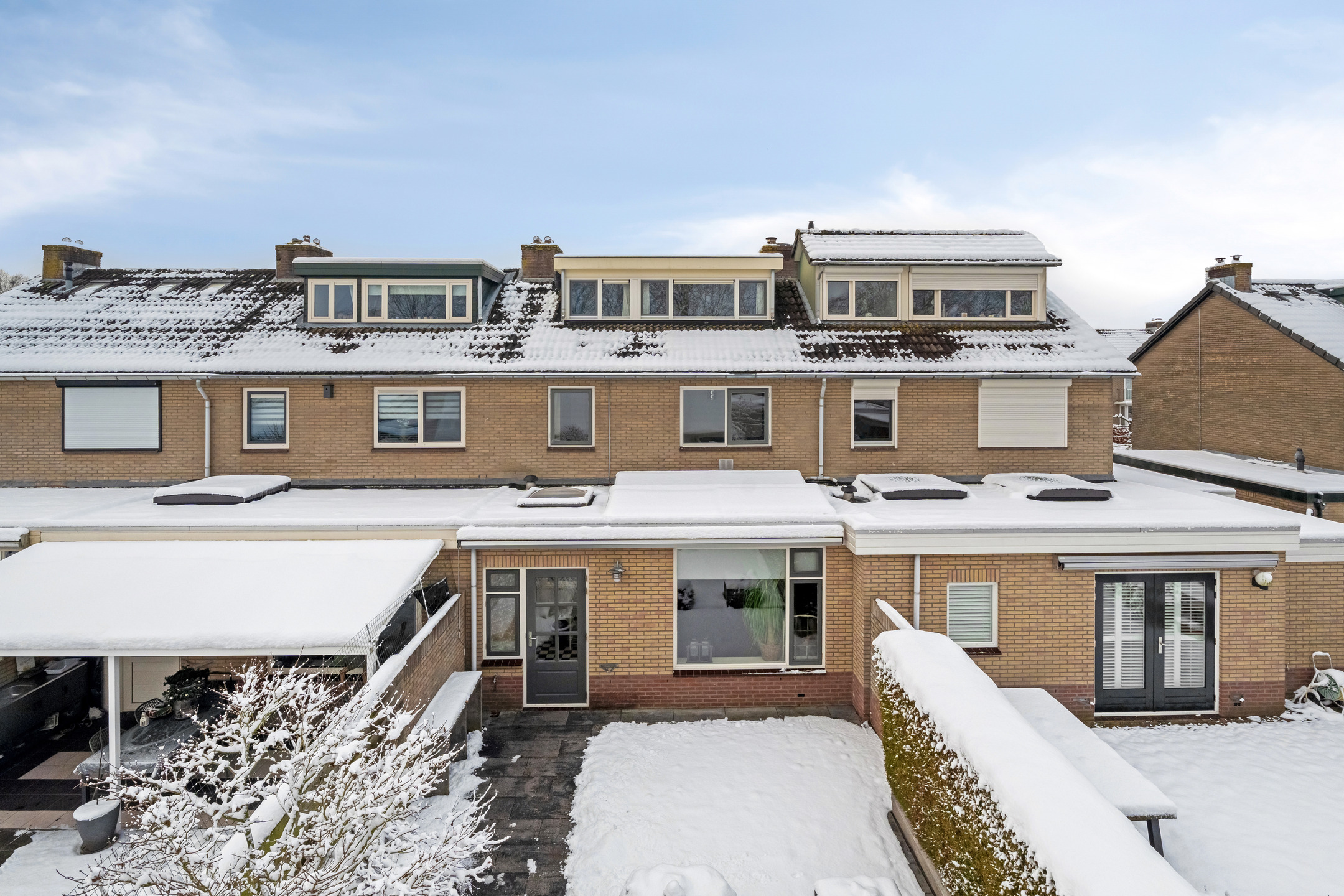 De achtertuin is keurig aangelegd en voorzien van sierbestrating, een verhoogde plantenbak en een mooi groenblijvend haag als erfafscheiding. Achterin de tuin is een berging geplaatst met daaraan vast een royale overkapping: een fijne plek om lang buiten te zitten, ook bij minder mooi weer. De tuin is achterom bereikbaar en biedt volop ruimte om te spelen of te ontspannen.
