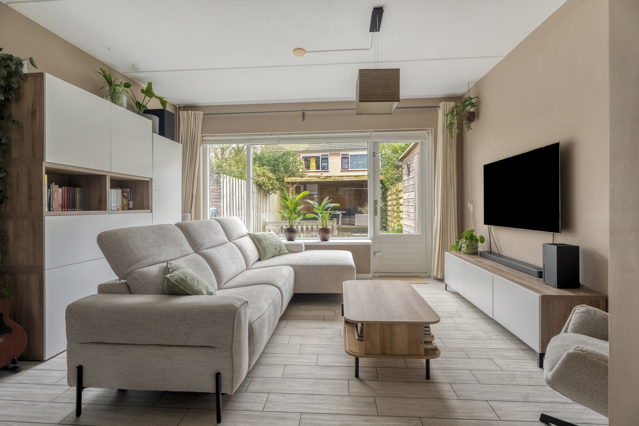 Wat in de woonkamer direct opvalt, is de lengte van de ruimte en het prettige daglicht van zowel de voor- als achterzijde. Aan de achterzijde richt je eenvoudig een gezellig zitgedeelte in, terwijl er aan de voorzijde volop ruimte is voor een royale eettafel.