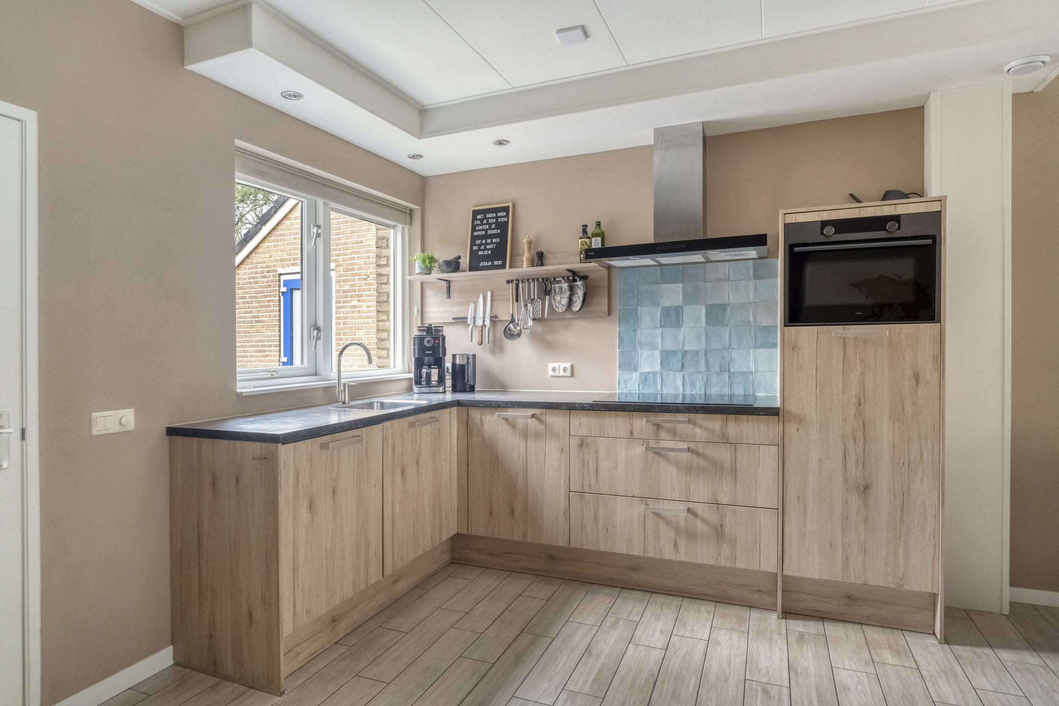 De keuken is in hoekopstelling geplaatst en uitgevoerd in een warme houttint met een donker werkblad. De combinatie met de lichte tegelvloer en de frisse wandafwerking zorgt voor een eigentijdse uitstraling. Vanuit de keuken heb je zicht op de straat en via de woonkamer stap je zo de achtertuin in.