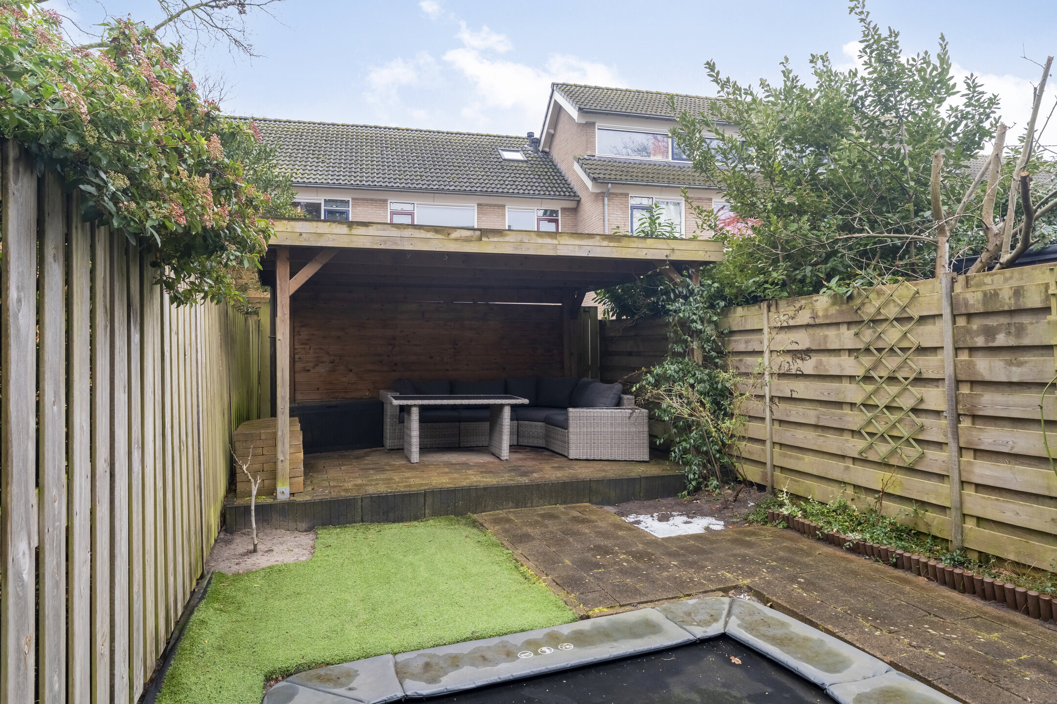 De achtertuin is onderhoudsvriendelijk aangelegd en voorzien van een terras direct achter de woning. Achterin staat een veranda van circa 7 vierkante meter. Dankzij de ligging kun je hier al snel in het voorjaar van de zon genieten.