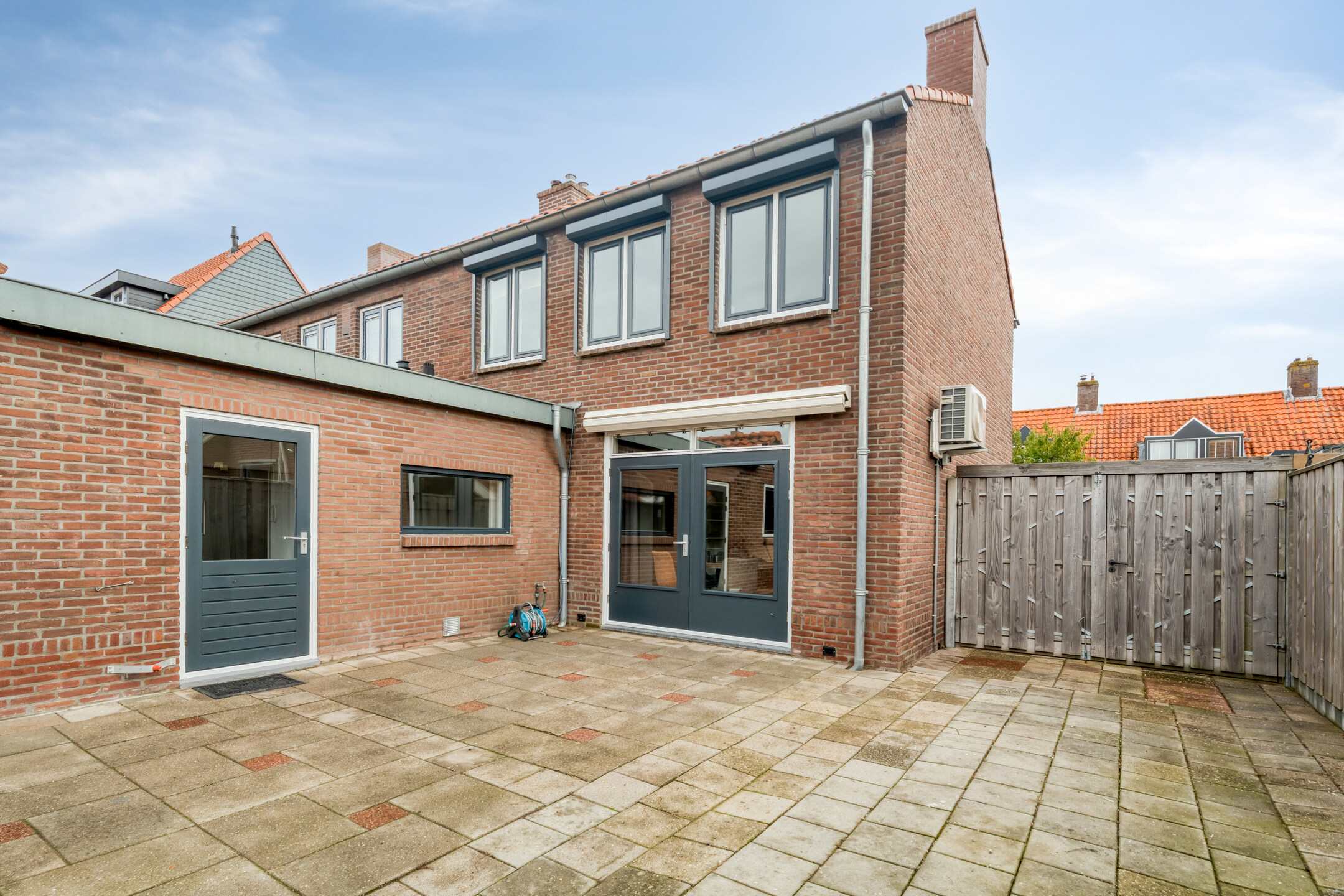 De achtertuin is grotendeels bestraat en daardoor onderhoudsvriendelijk. Er is een ruime houten schuur aanwezig, evenals een overkapping waar je beschut kunt zitten. Via het achterpad is er een handige achterom aanwezig.