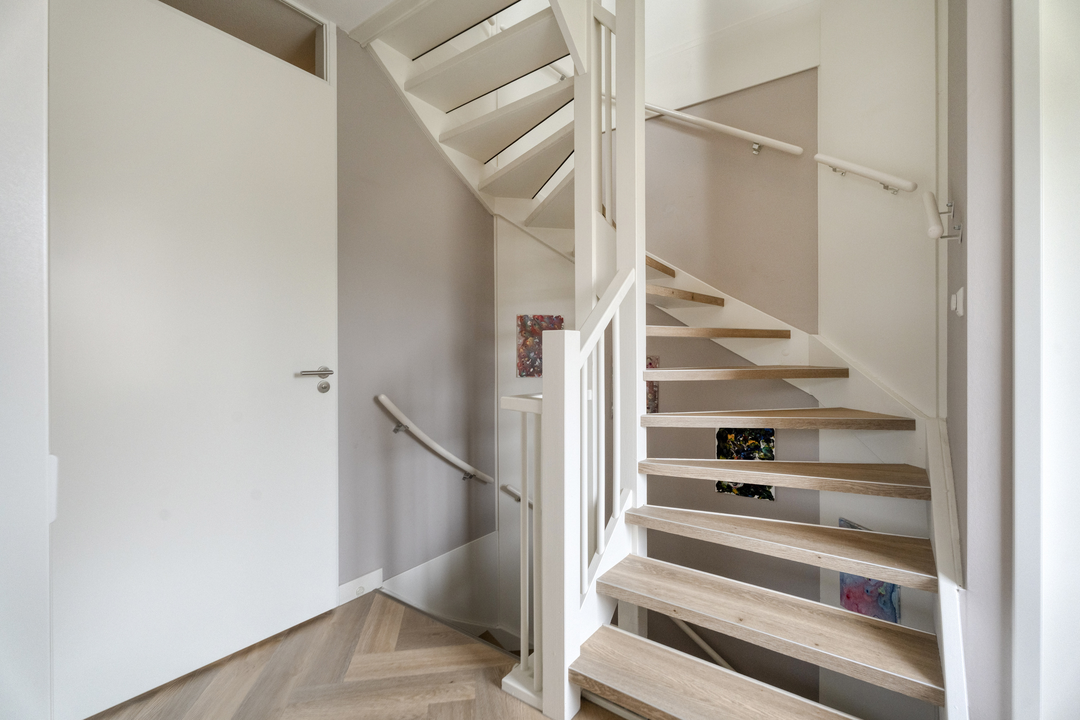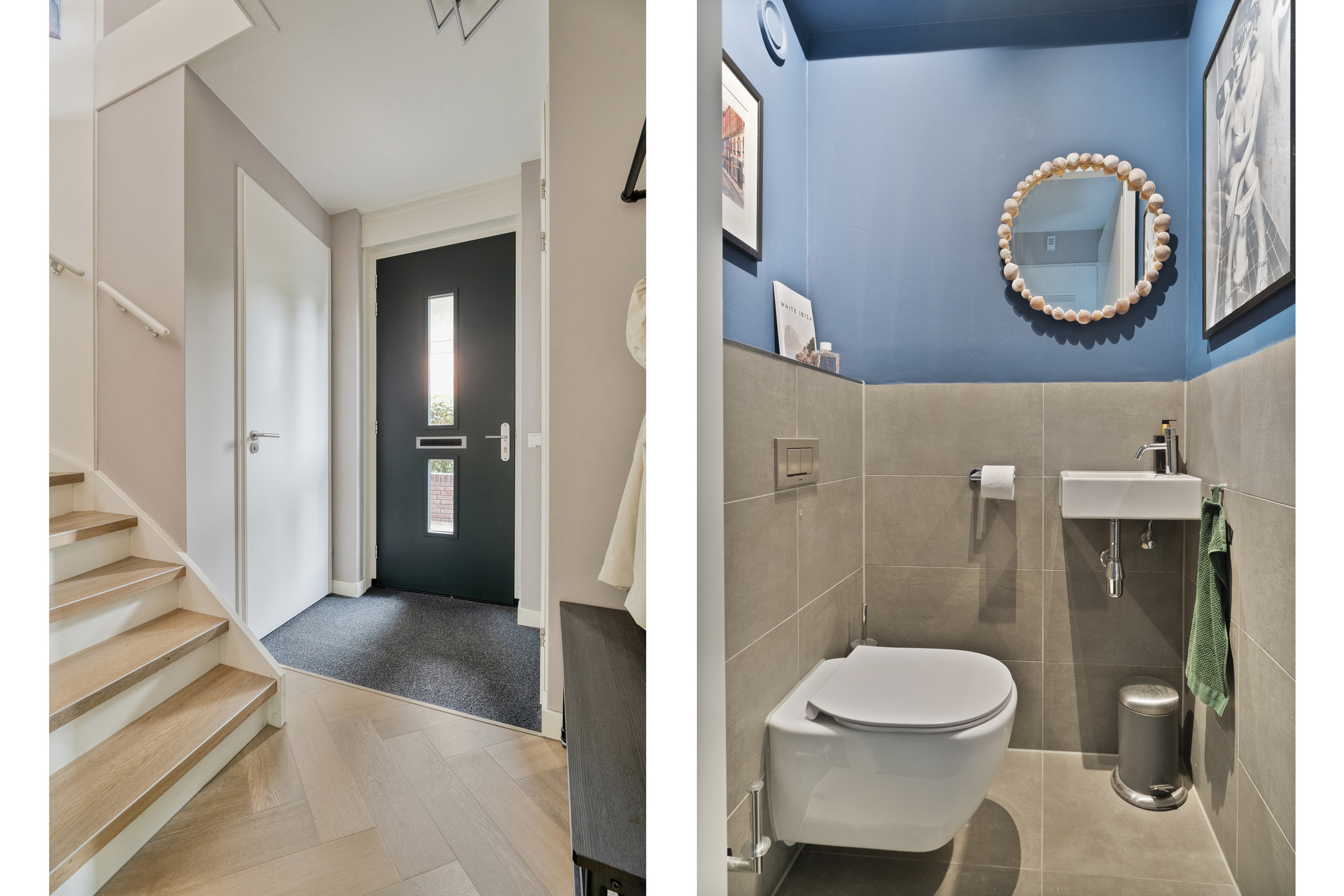 Via de brede oprit met plek voor meerdere auto’s en de overdekte entree kom je binnen in een ruime hal met toilet, trapopgang en meterkast. Wat direct opvalt, is het hoge afwerkingsniveau: een visgraat PVC-vloer, strakke wandafwerking en stijlvolle details.