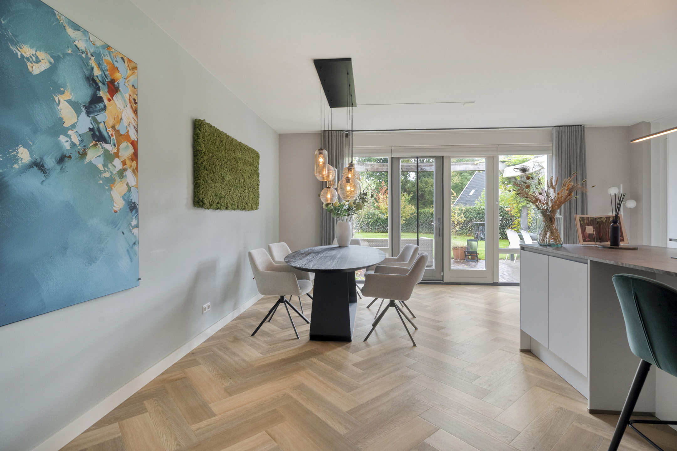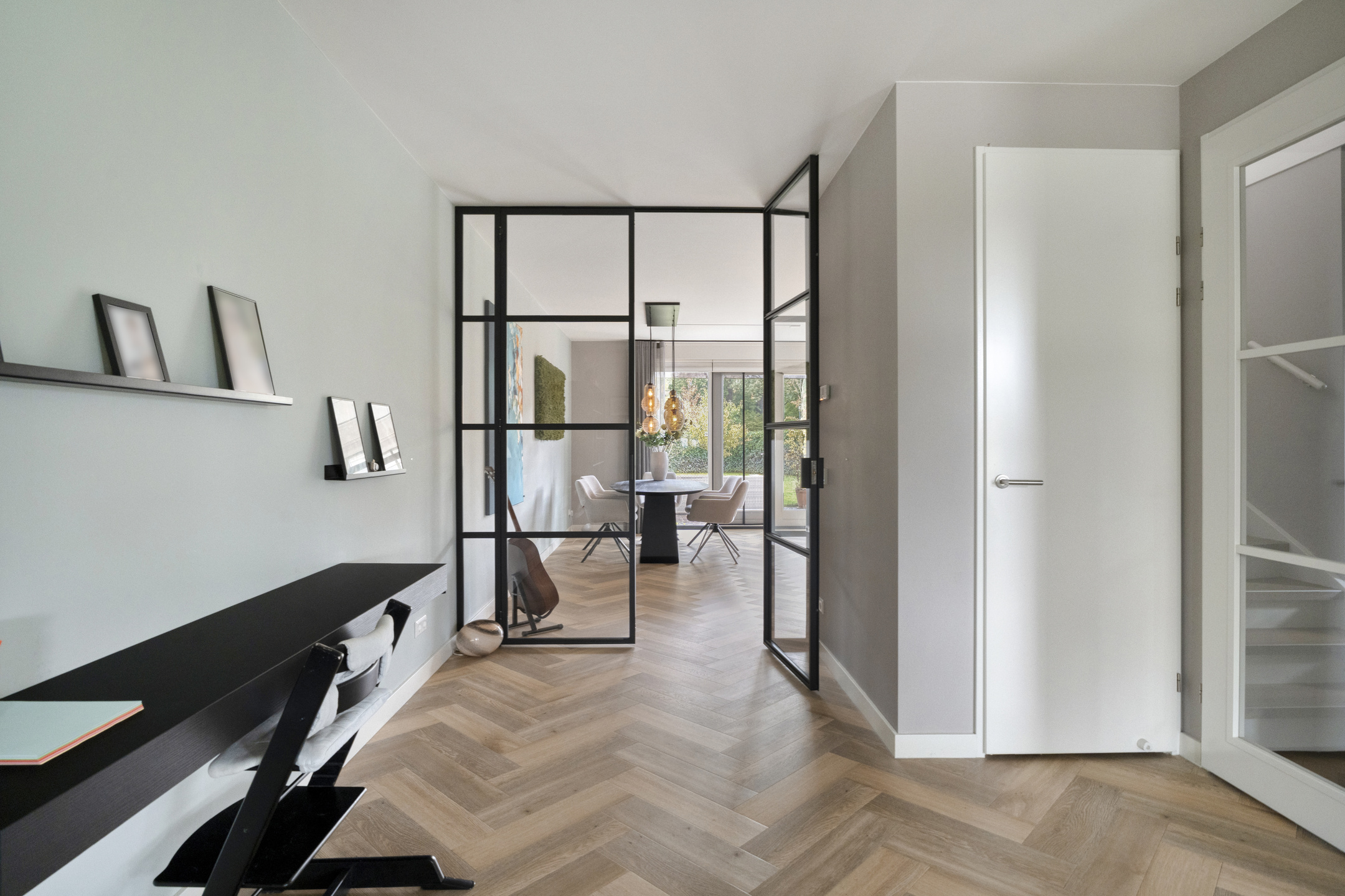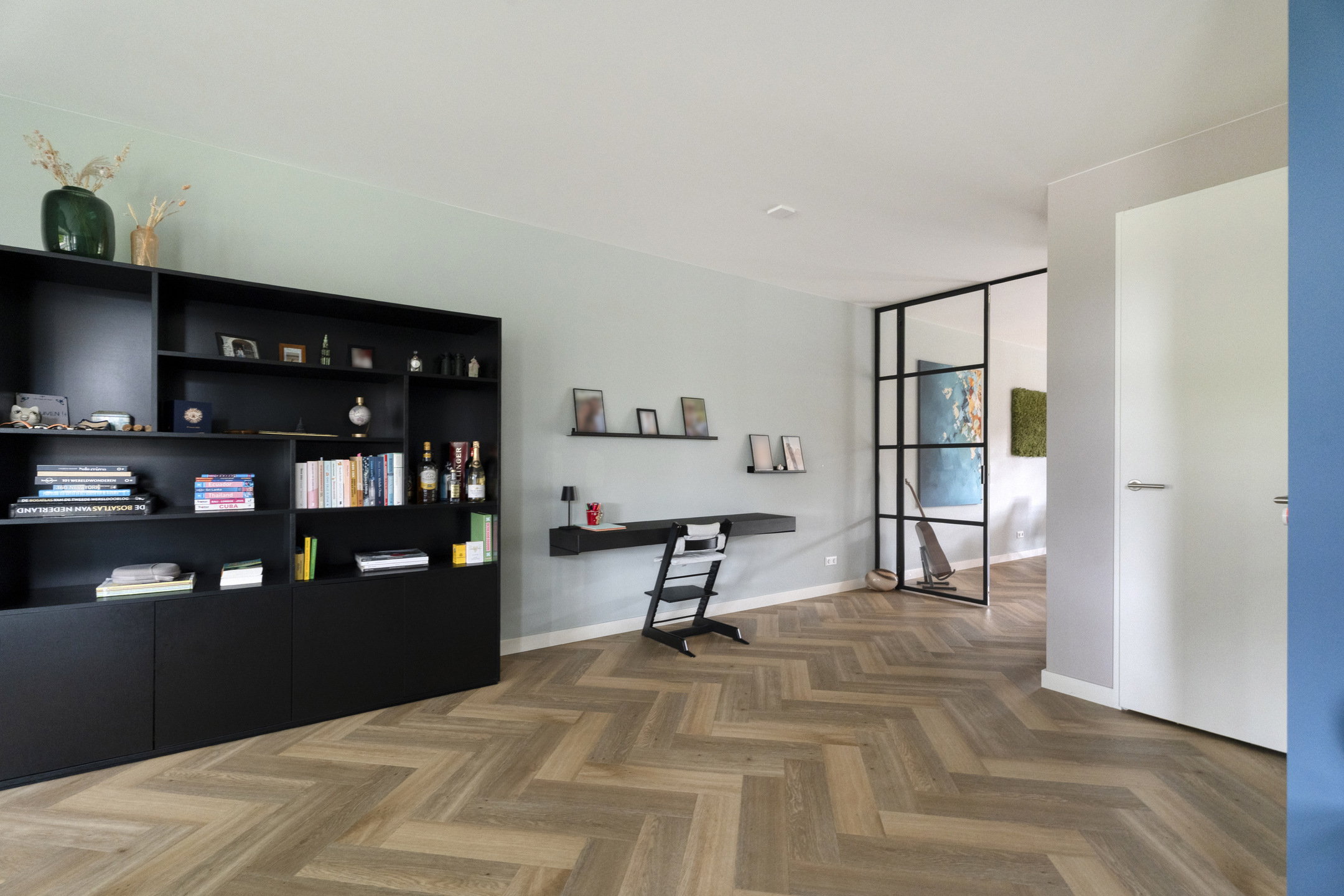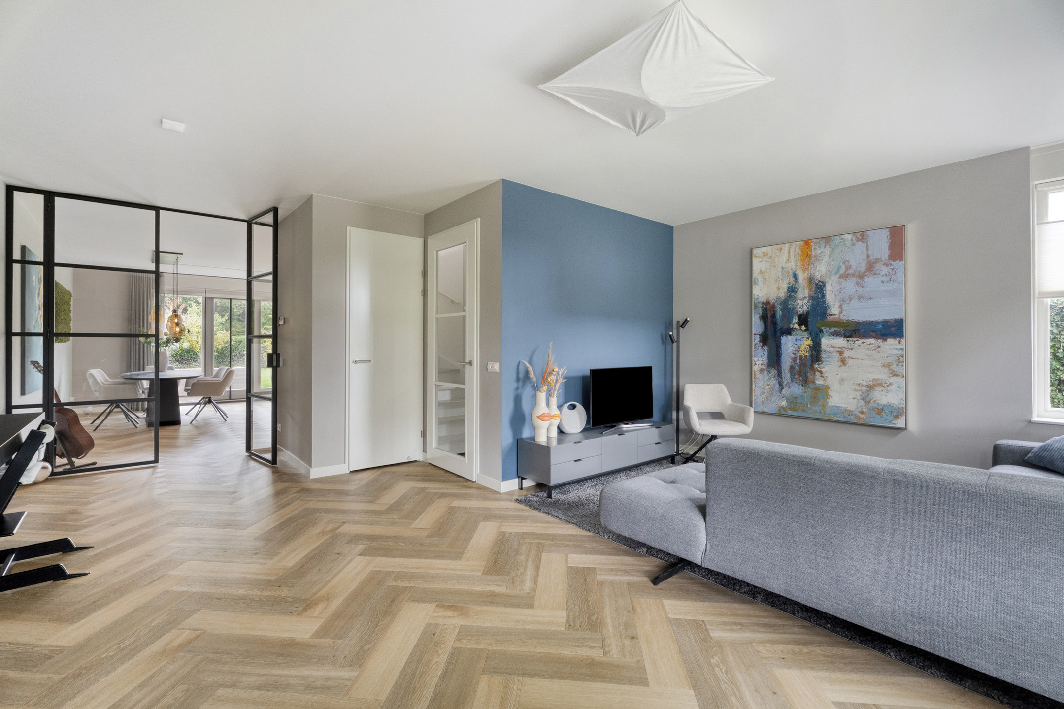 De woonkamer is heerlijk licht en biedt volop ruimte voor een royaal zitgedeelte. De verbinding met de leefkeuken aan de achterzijde wordt versterkt door de glazen taatsdeuren, die zowel licht als sfeer doorlaten.