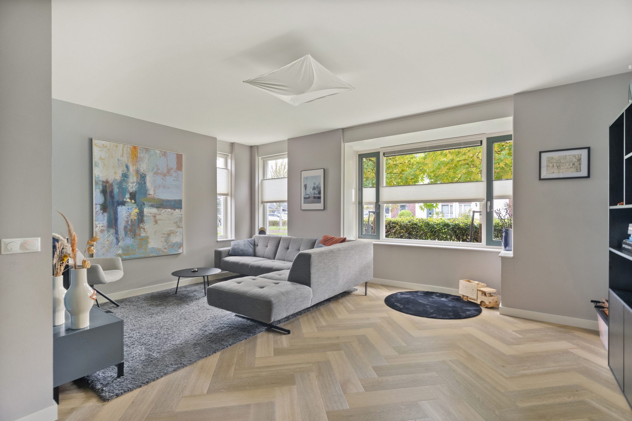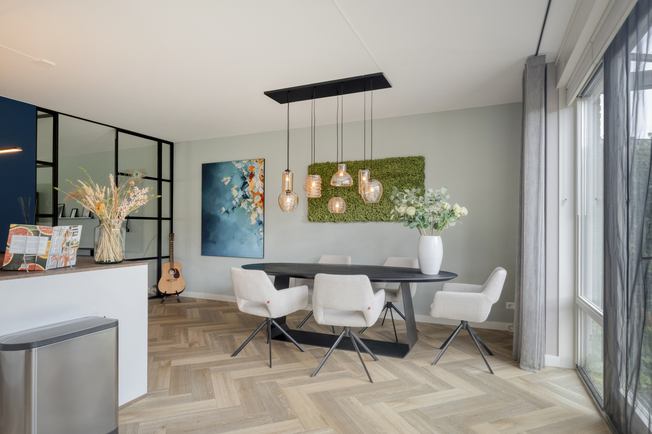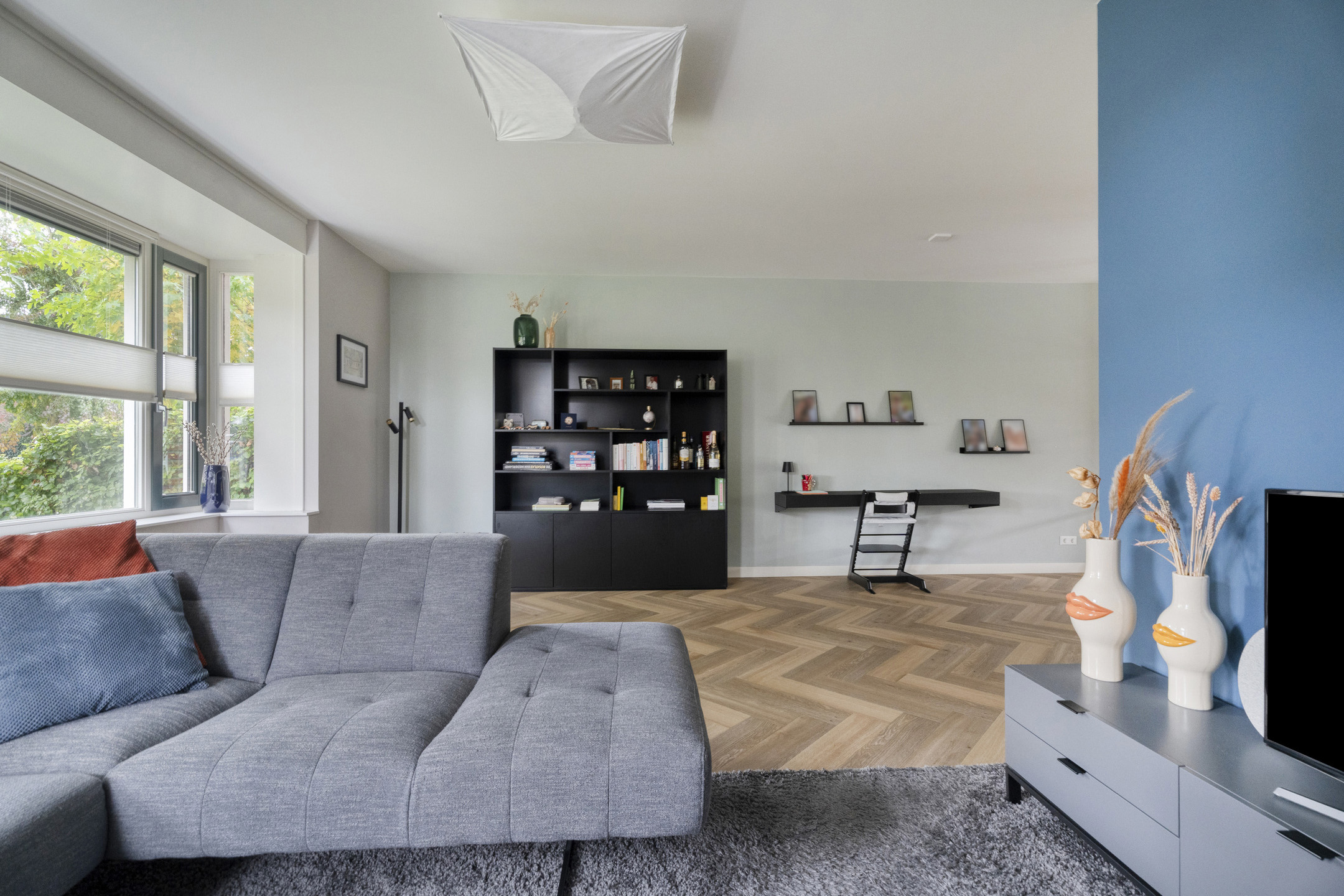 De woonkamer is heerlijk licht en biedt volop ruimte voor een royaal zitgedeelte. De verbinding met de leefkeuken aan de achterzijde wordt versterkt door de glazen taatsdeuren, die zowel licht als sfeer doorlaten.