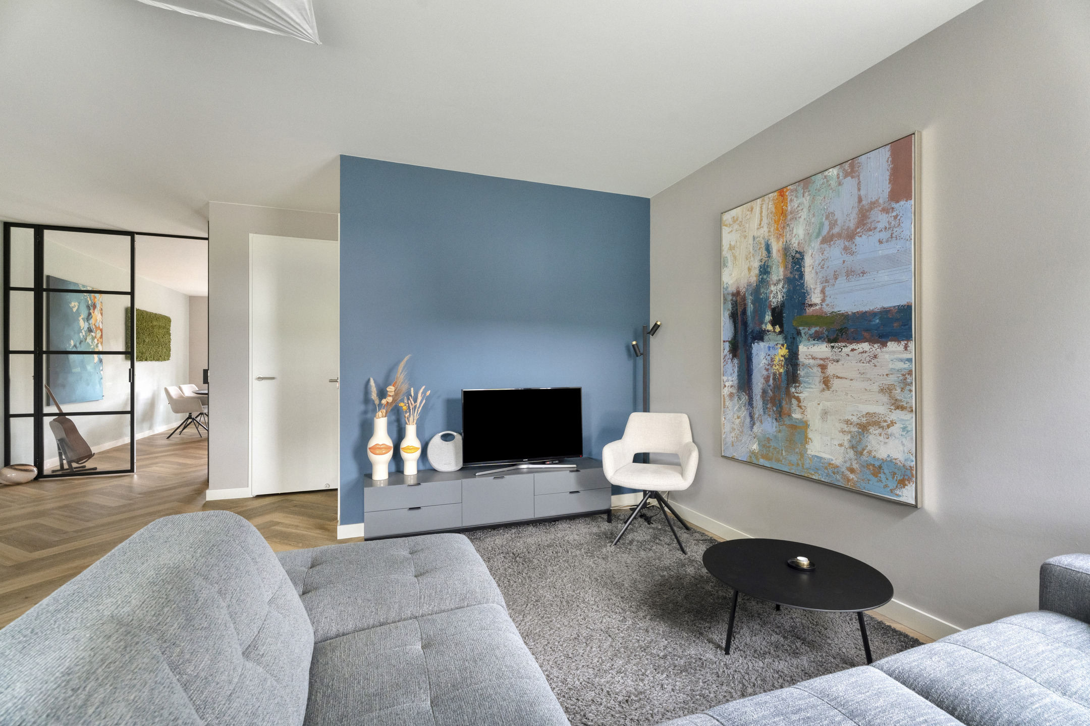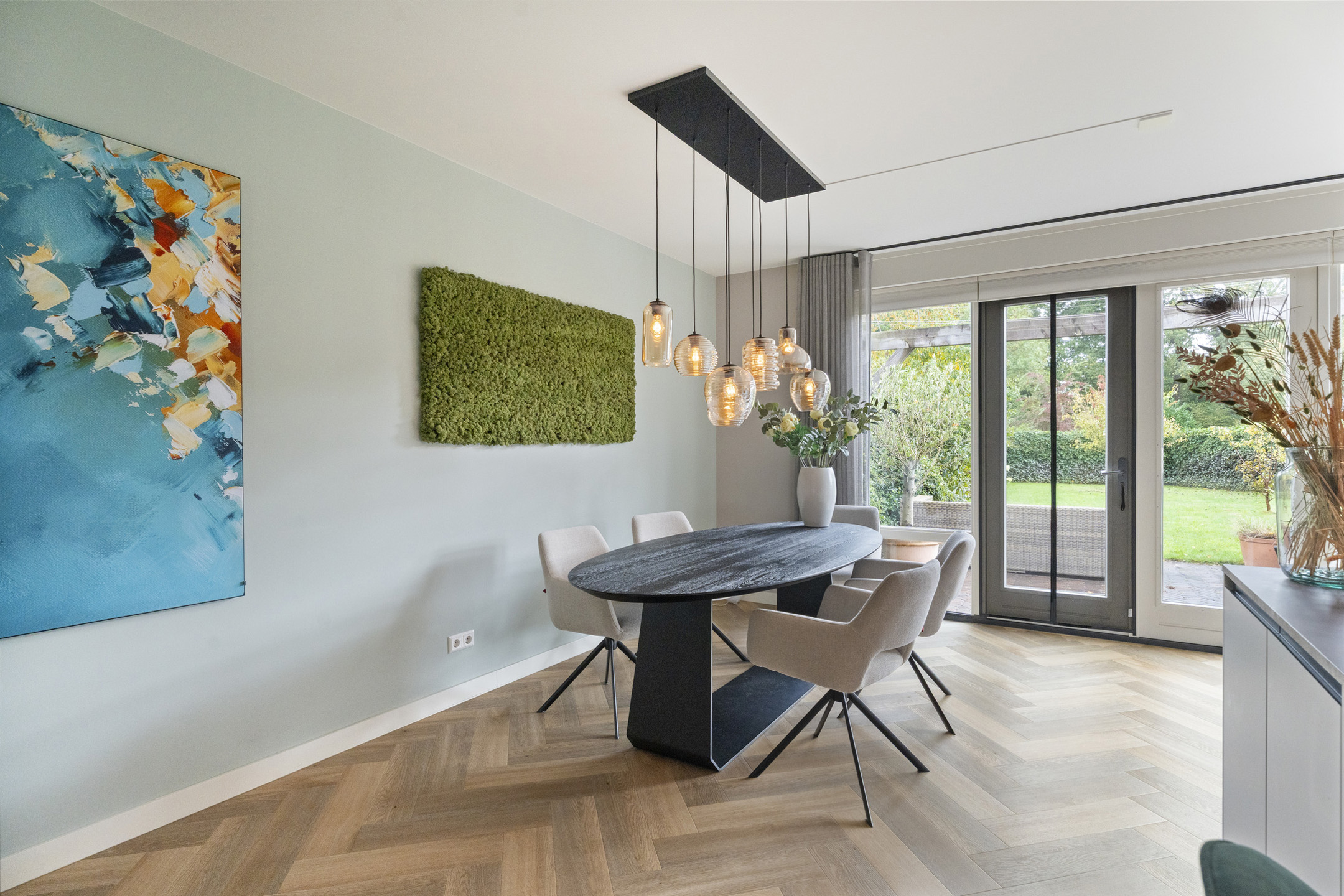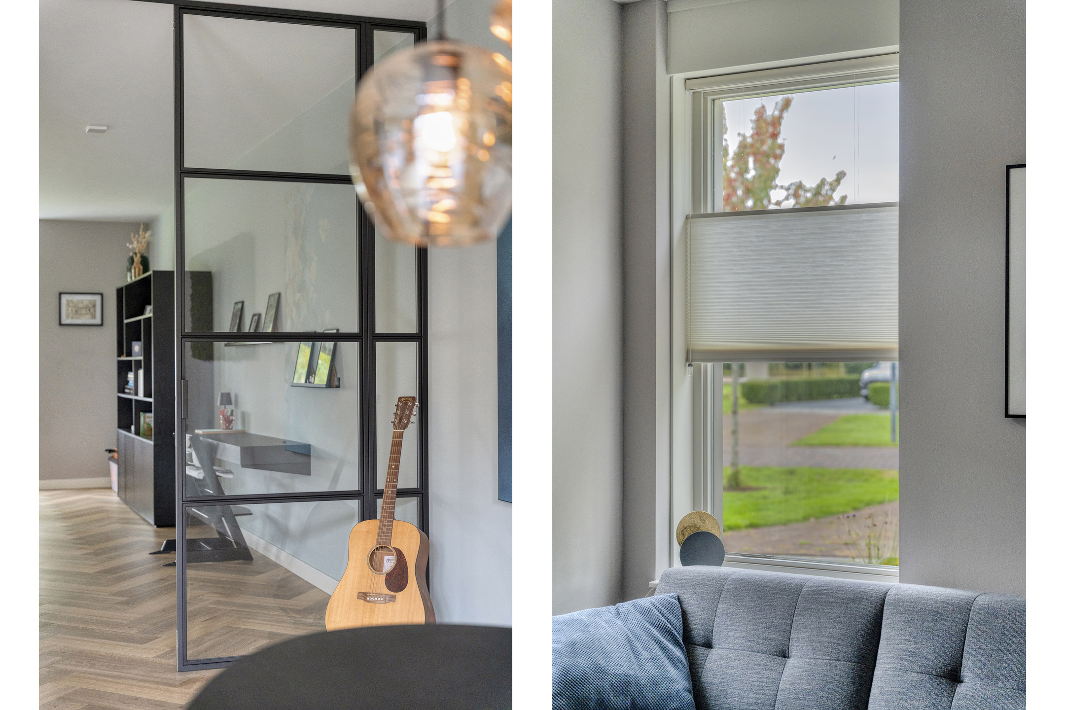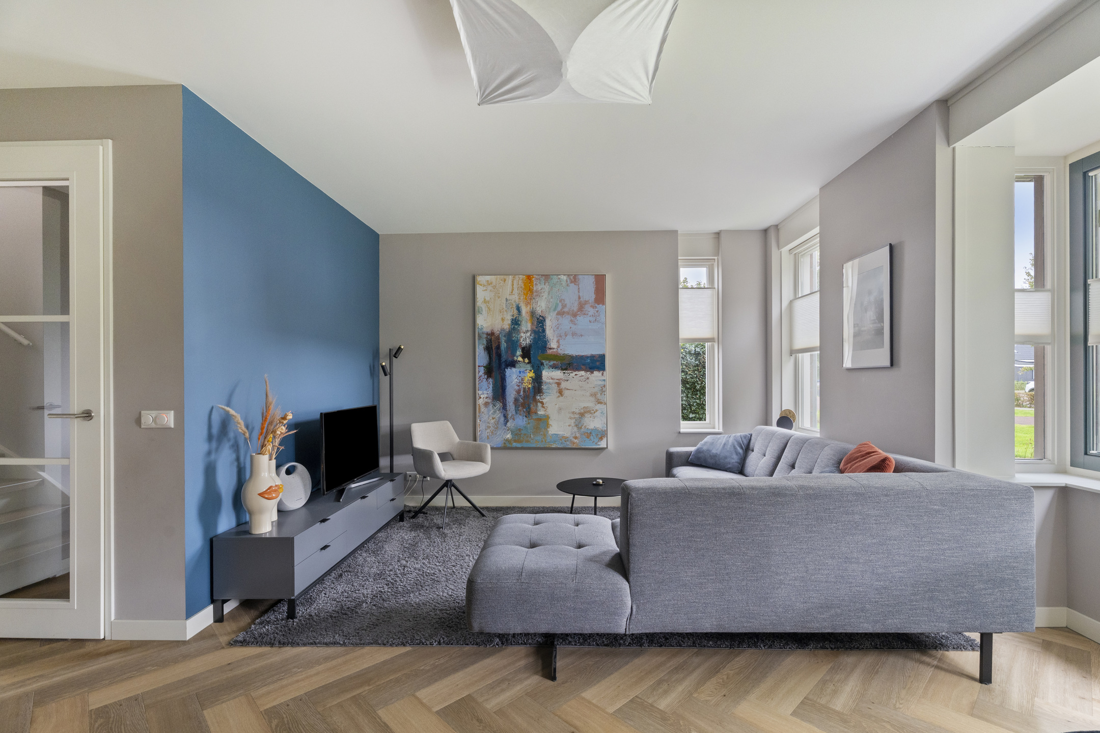 De woonkamer is heerlijk licht en biedt volop ruimte voor een royaal zitgedeelte. De verbinding met de leefkeuken aan de achterzijde wordt versterkt door de glazen taatsdeuren, die zowel licht als sfeer doorlaten.