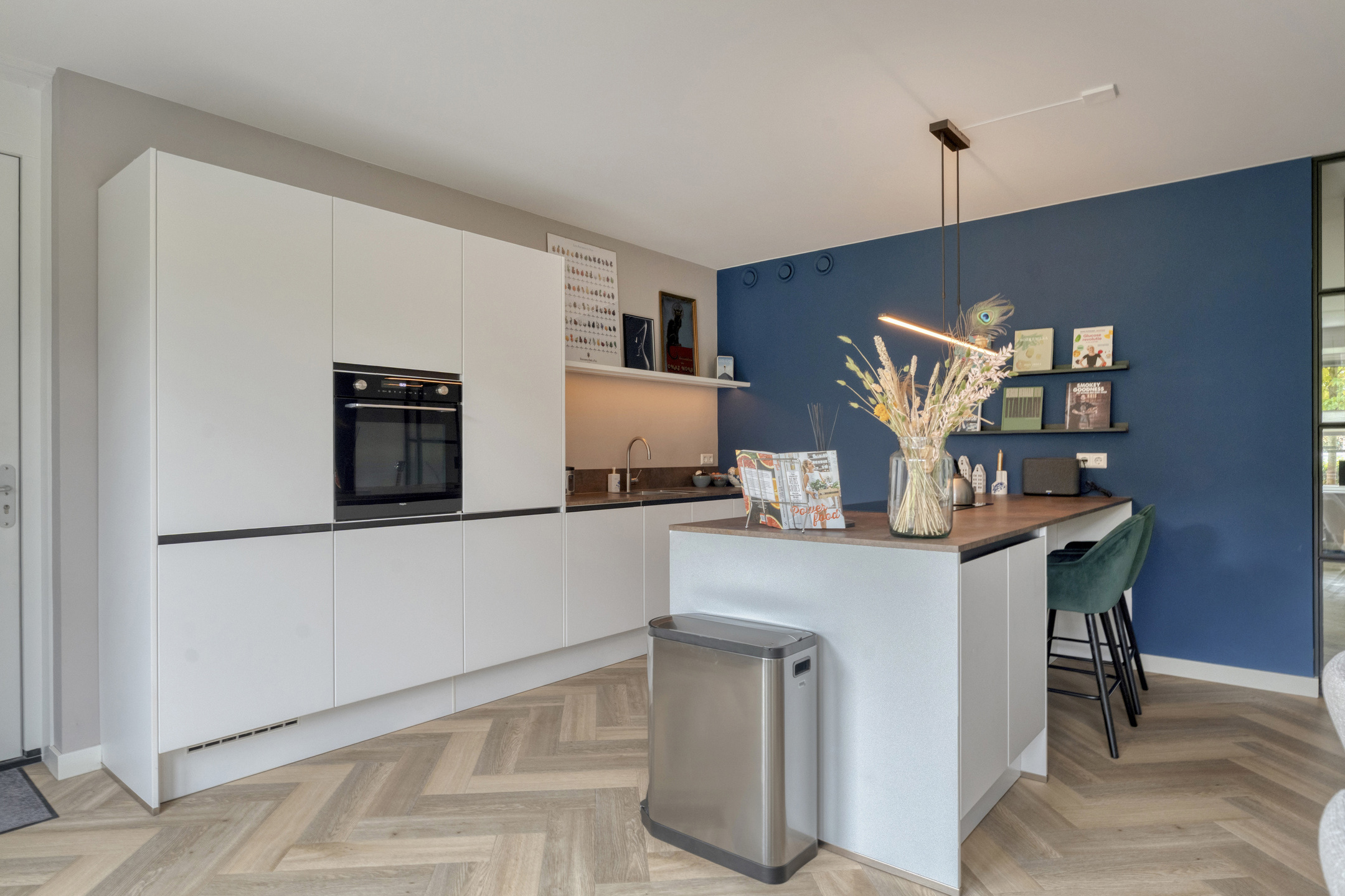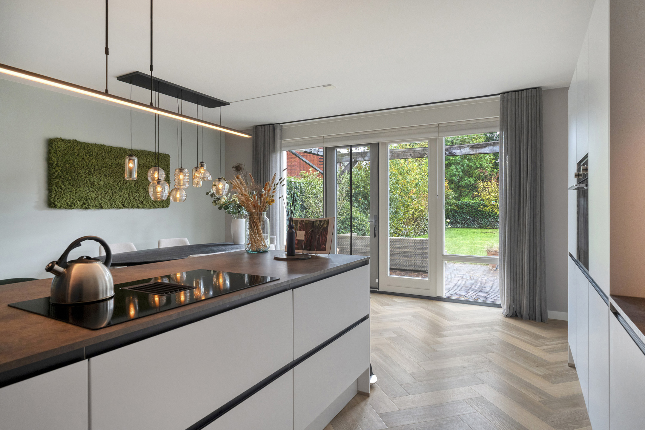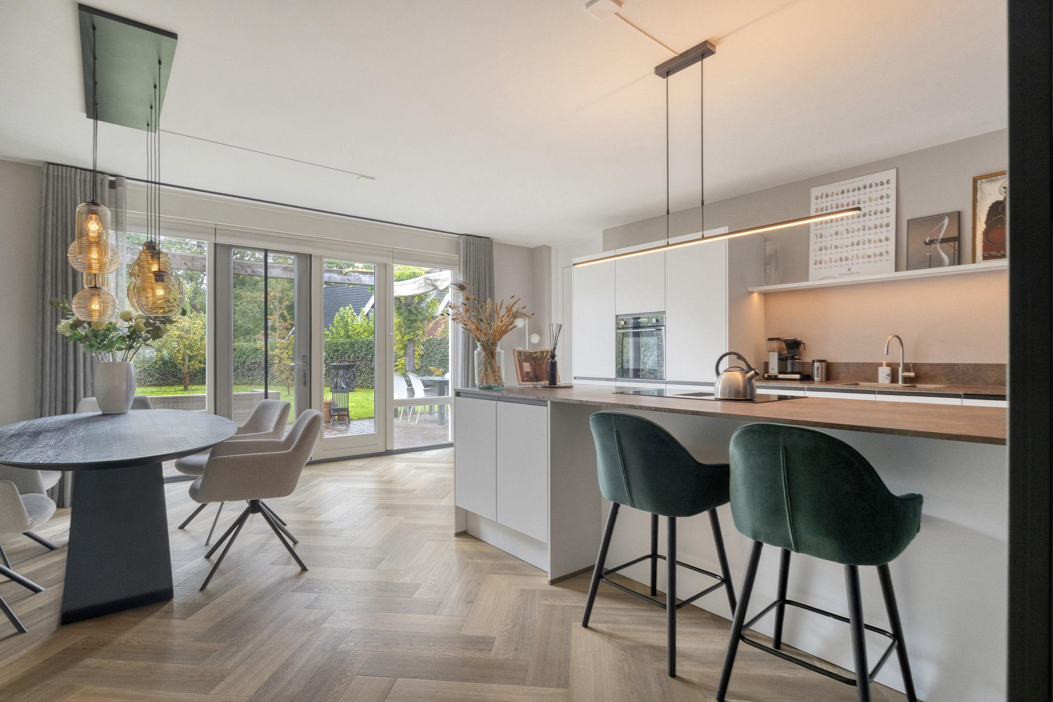 De leefkeuken is een echte blikvanger. De moderne keukenopstelling is voorzien van hoogwaardige inbouwapparatuur, een strak kookeiland en een bar waar je gezellig aan kunt zitten. Dankzij de dubbele openslaande deuren staat de keuken in directe verbinding met het terras en de tuin, ideaal voor zomeravonden of voor een kop koffie in de ochtendzon.