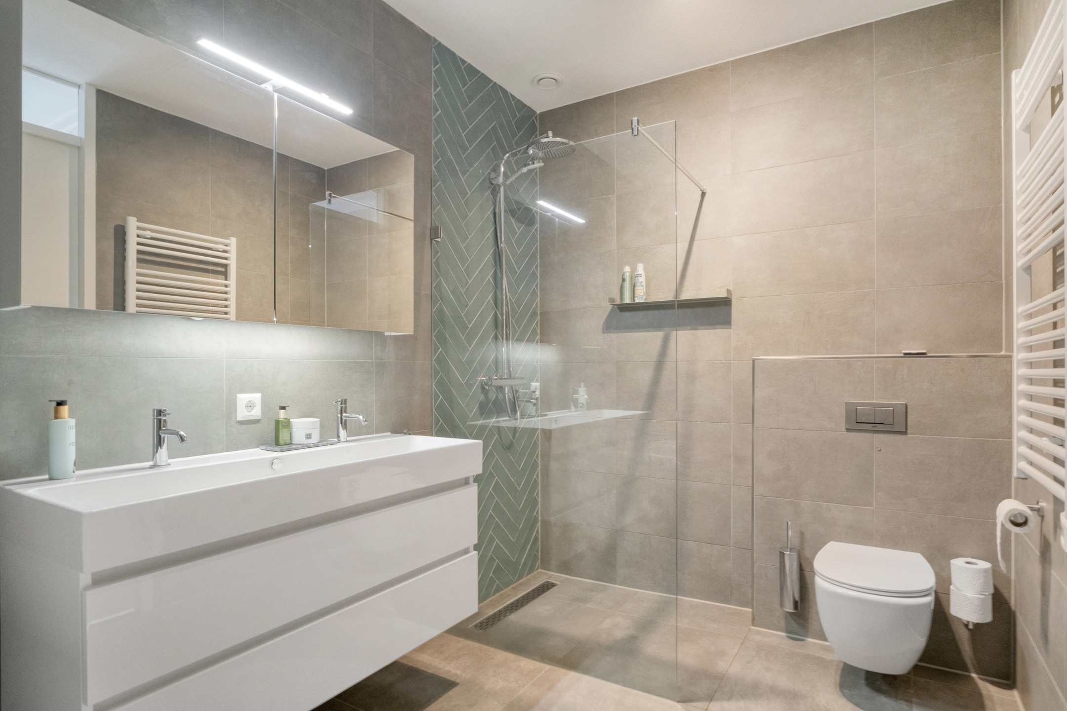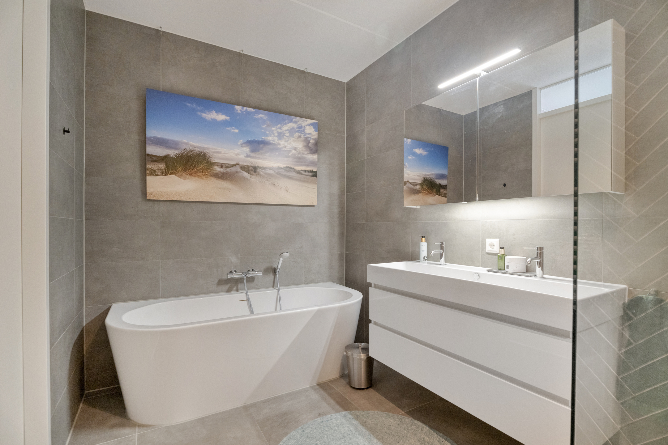 De badkamer is modern en stijlvol ingericht met een vrijstaand ligbad, ruime inloopdouche, dubbele wastafel en een tweede toilet.