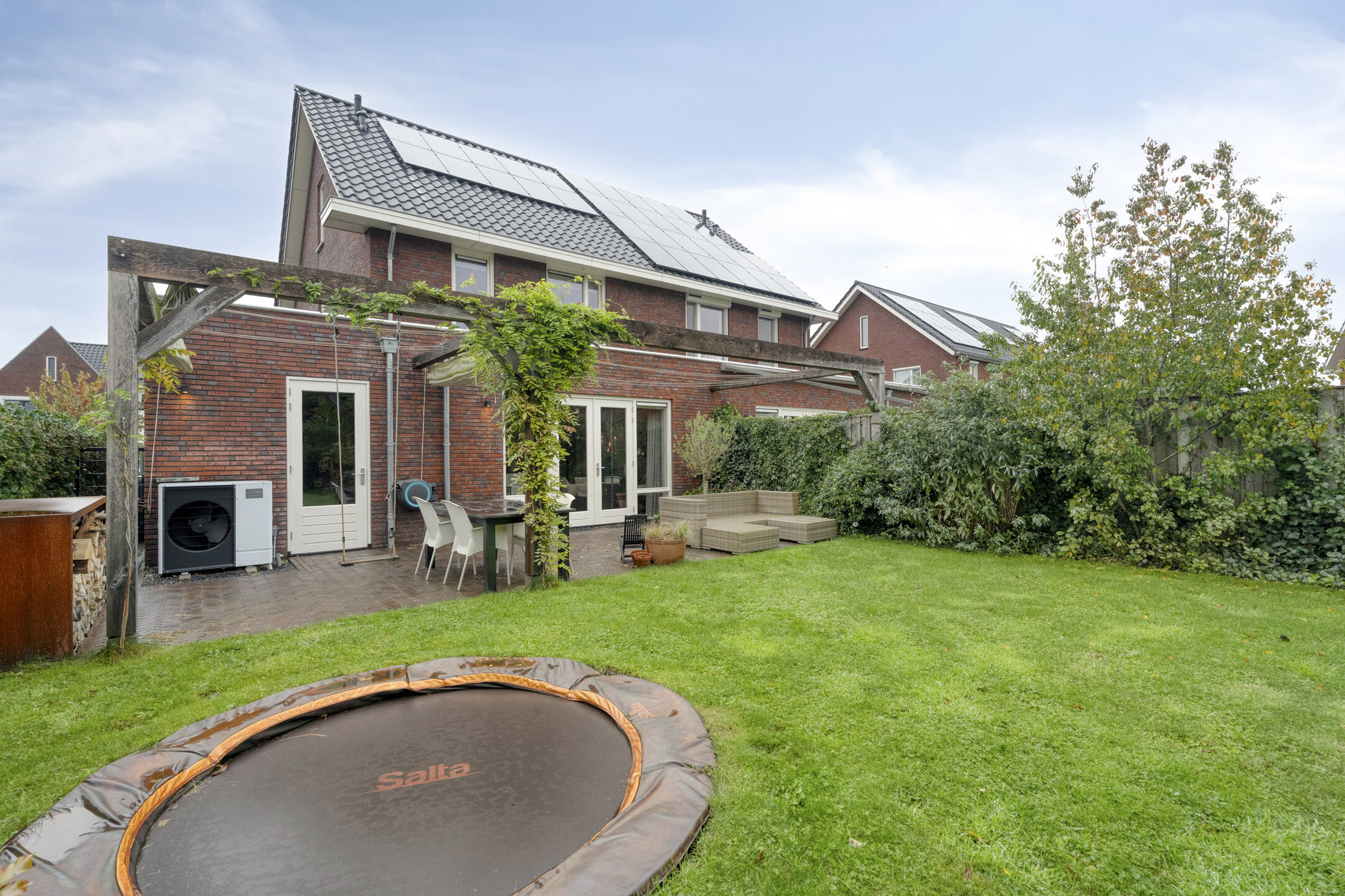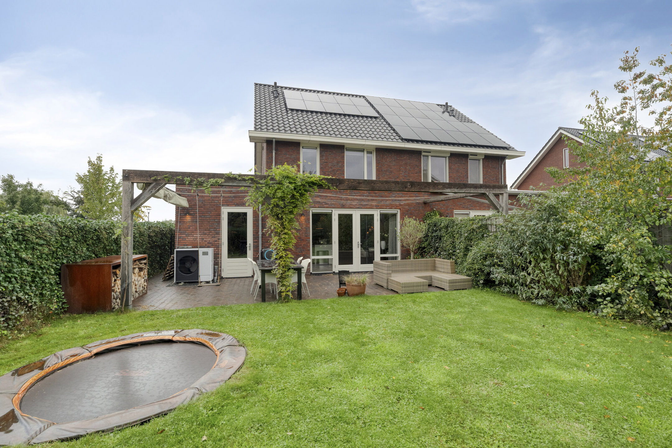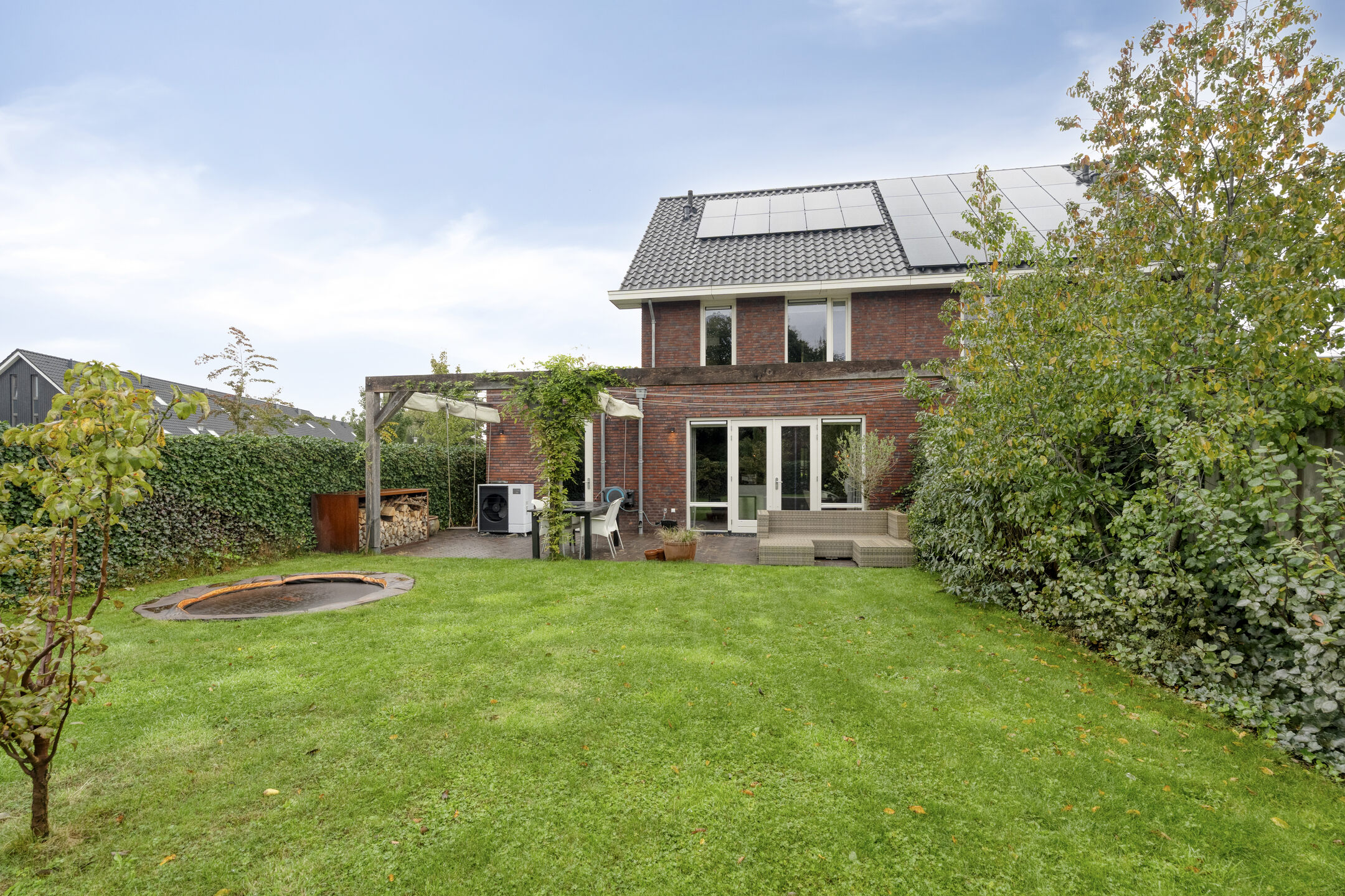 De achtertuin is breed, zonnig en met zorg aangelegd. Direct aan de woning ligt een royaal terras met pergola, perfect voor een buitenlunch of borrel. Daarachter ligt een groen gazon met fruitbomen, een trampoline en speelse hoekjes, heerlijk voor kinderen én volwassenen. De ligging biedt volop rust en privacy, terwijl je toch de gezelligheid van de wijk ervaart. Kortom, een heerlijke plek met ontzettend veel privacy!