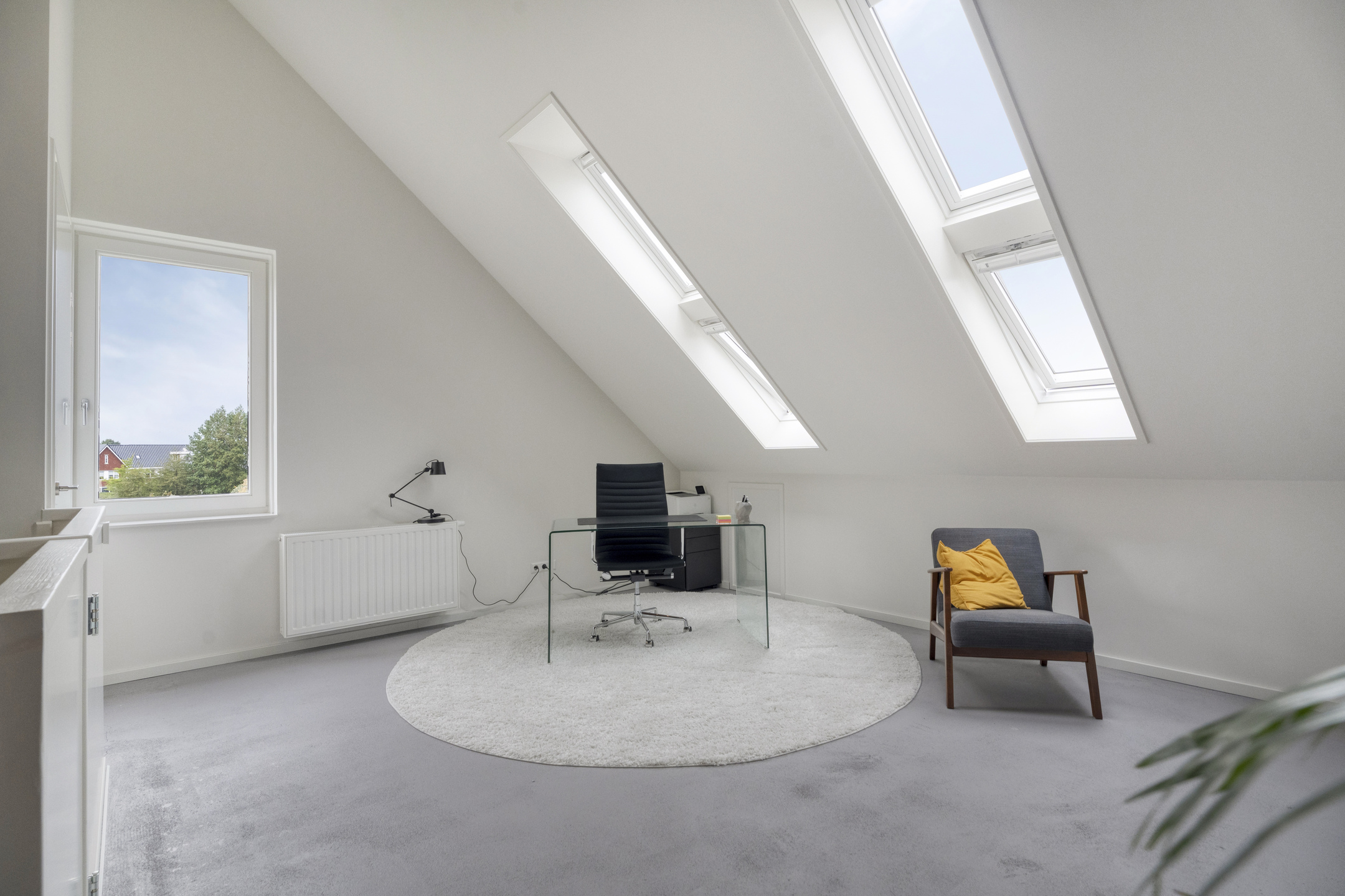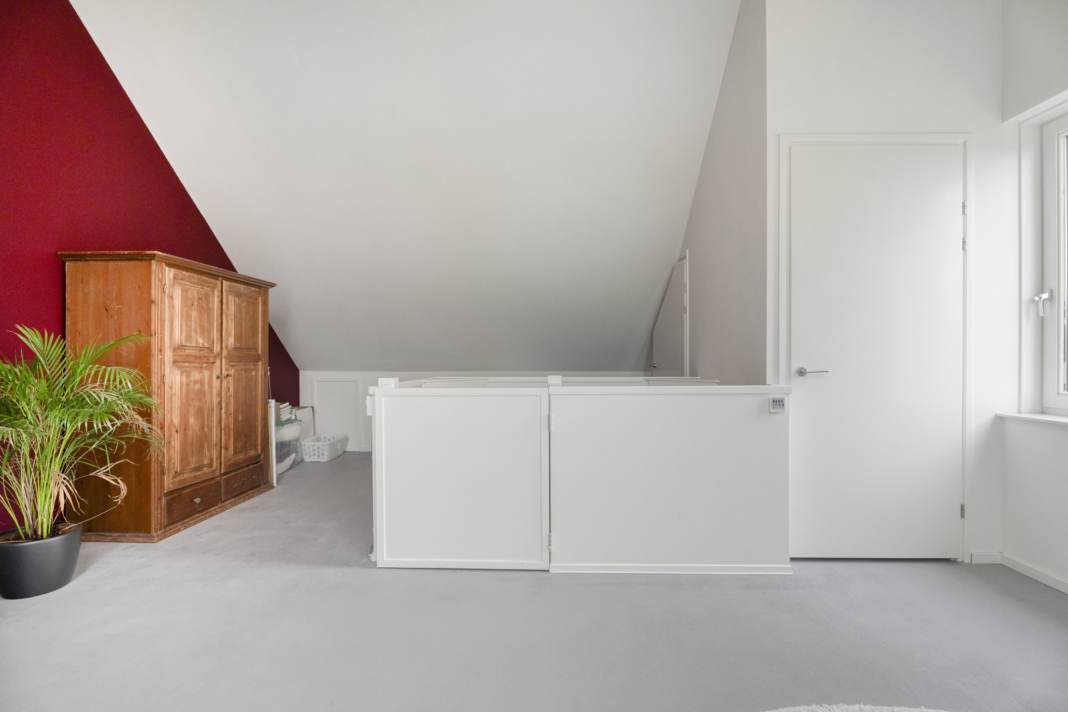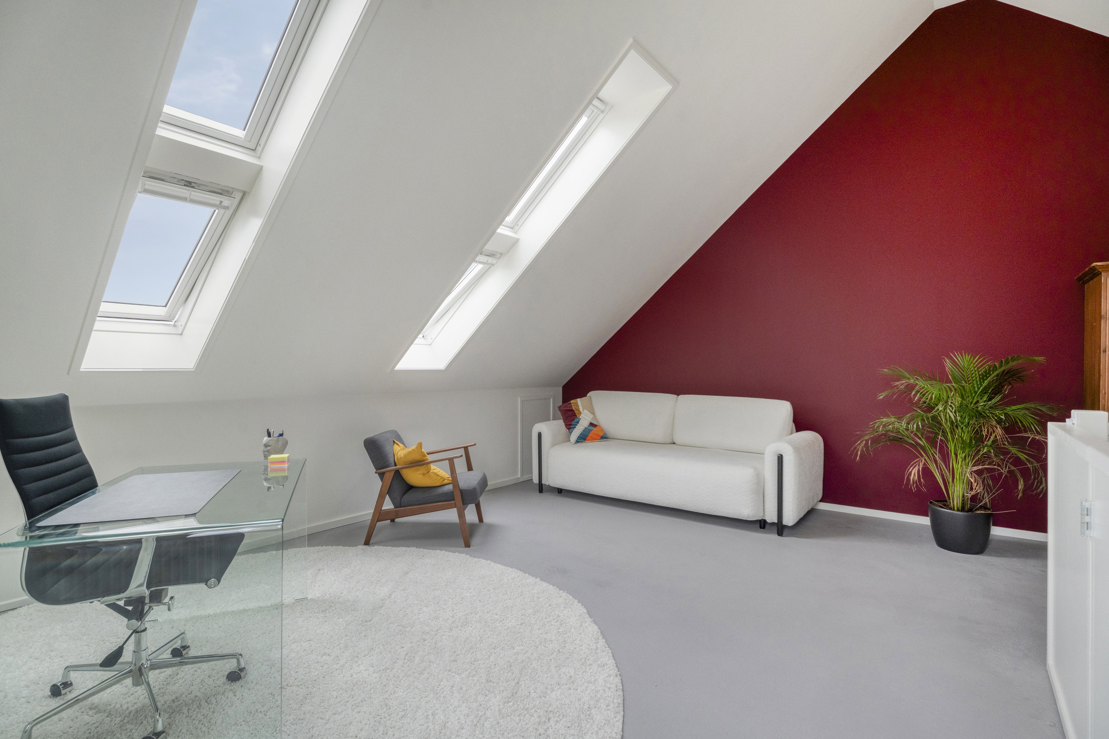 Op zolder tref je een verassend ruimte aan met een nokhoogte van maar liefst 4 meter. Dankzij de dakramen en zeer strakke afwerking is dit een lichte en aangename ruimte die uitstekend dienst kan doen als kantoor, atelier of slaapkamer. In de afsluitbare kast vind je de opstelling van de wasmachine en technische installaties.