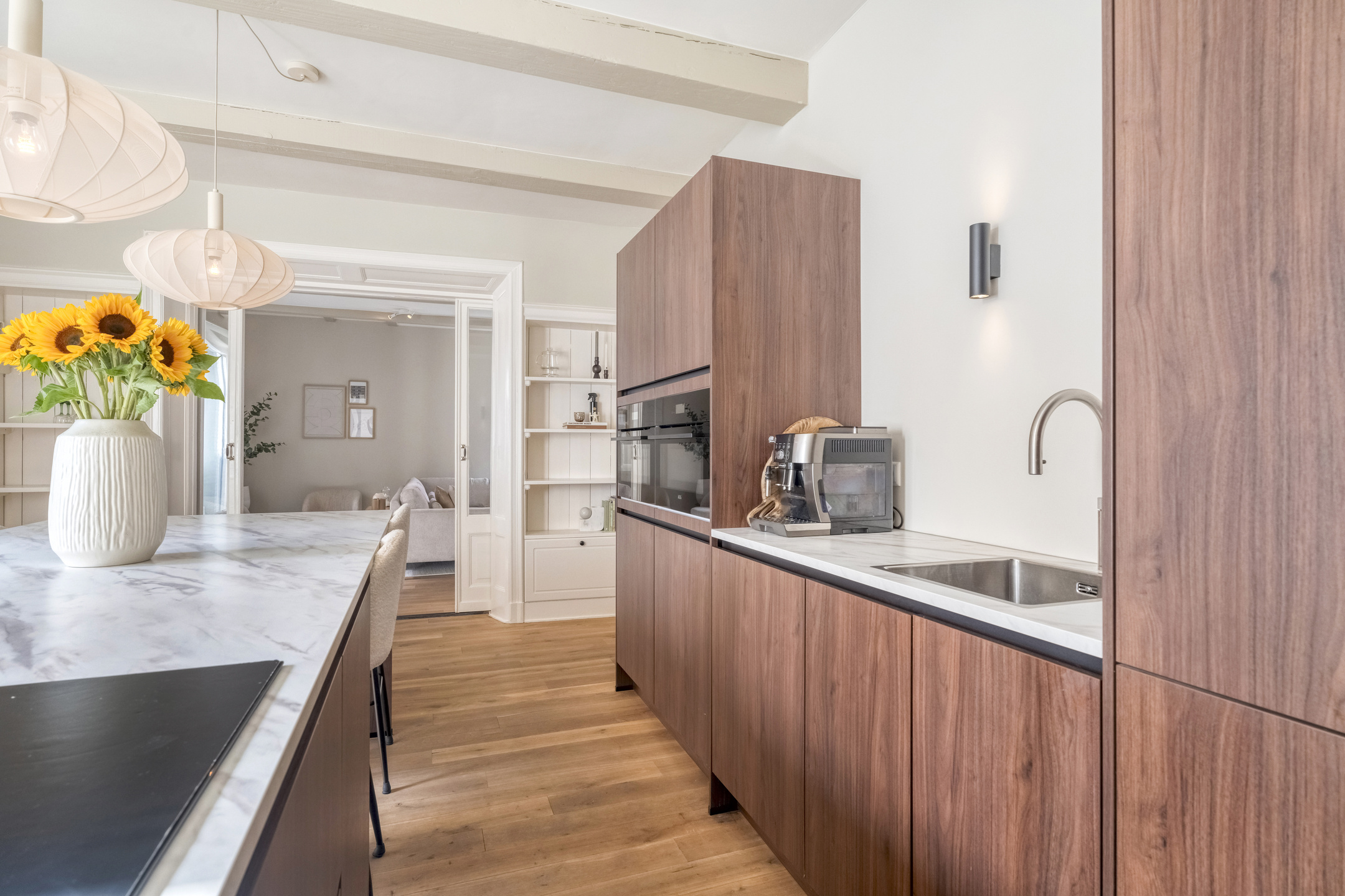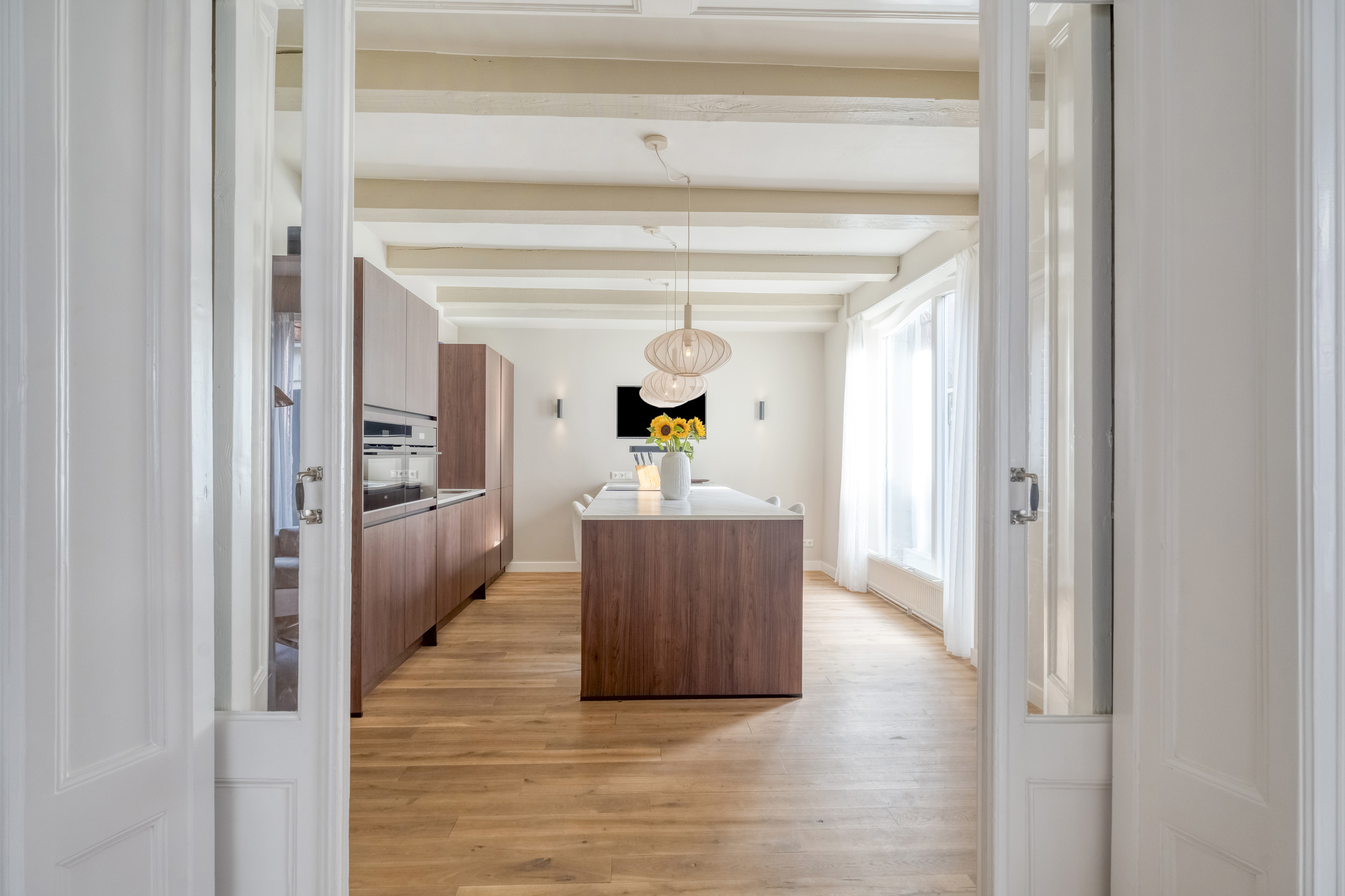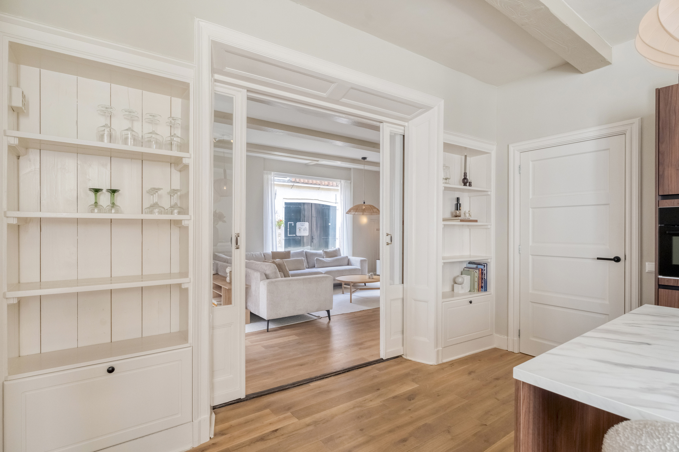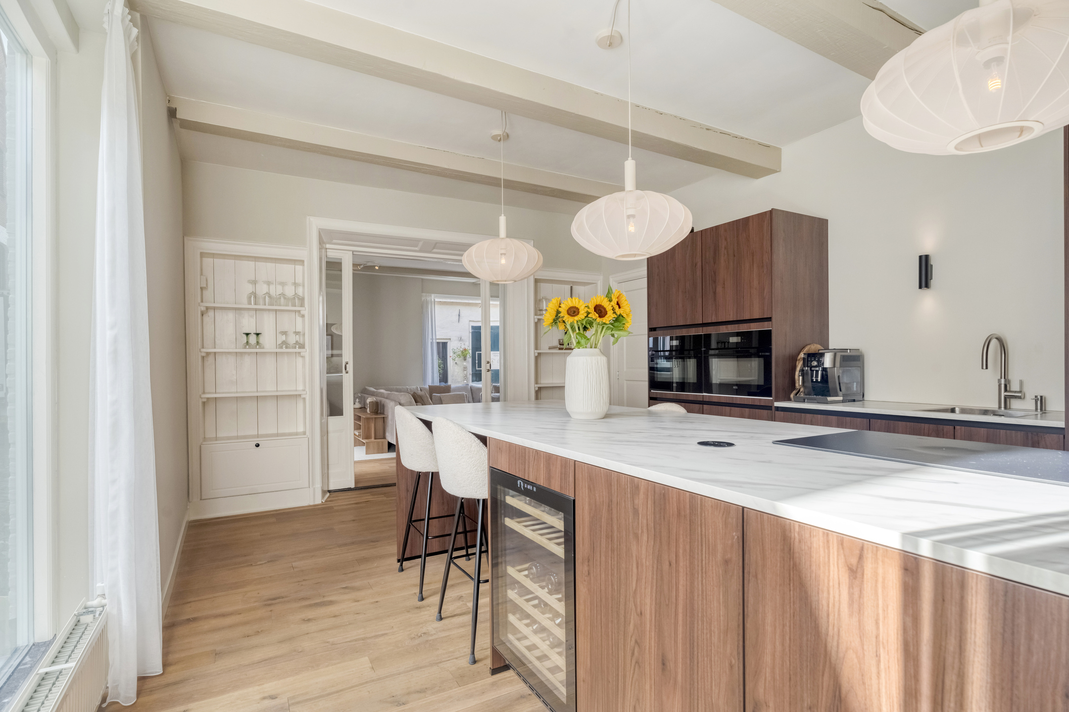 Via de voordeur stapt u een royale hal binnen, waar meteen de sfeer van het pand voelbaar is: hoge plafonds, paneeldeuren en een authentieke trapopgang. Deze hal geeft toegang tot het toilet en tot de in 2024 geplaatste keuken. Deze keuken bevindt zich aan de achterzijde en is ruim opgezet. Het beschikt over een vaatwasser, Quooker, XXL koel- en vrieskast, een Bora kookplaat, wijnklimaatkast en een dubbele combi-oven. Verder sluit de keuken dankzij de combinatie van de strakke lijnen met warme kleuren perfect aan bij het karakter van de woning.