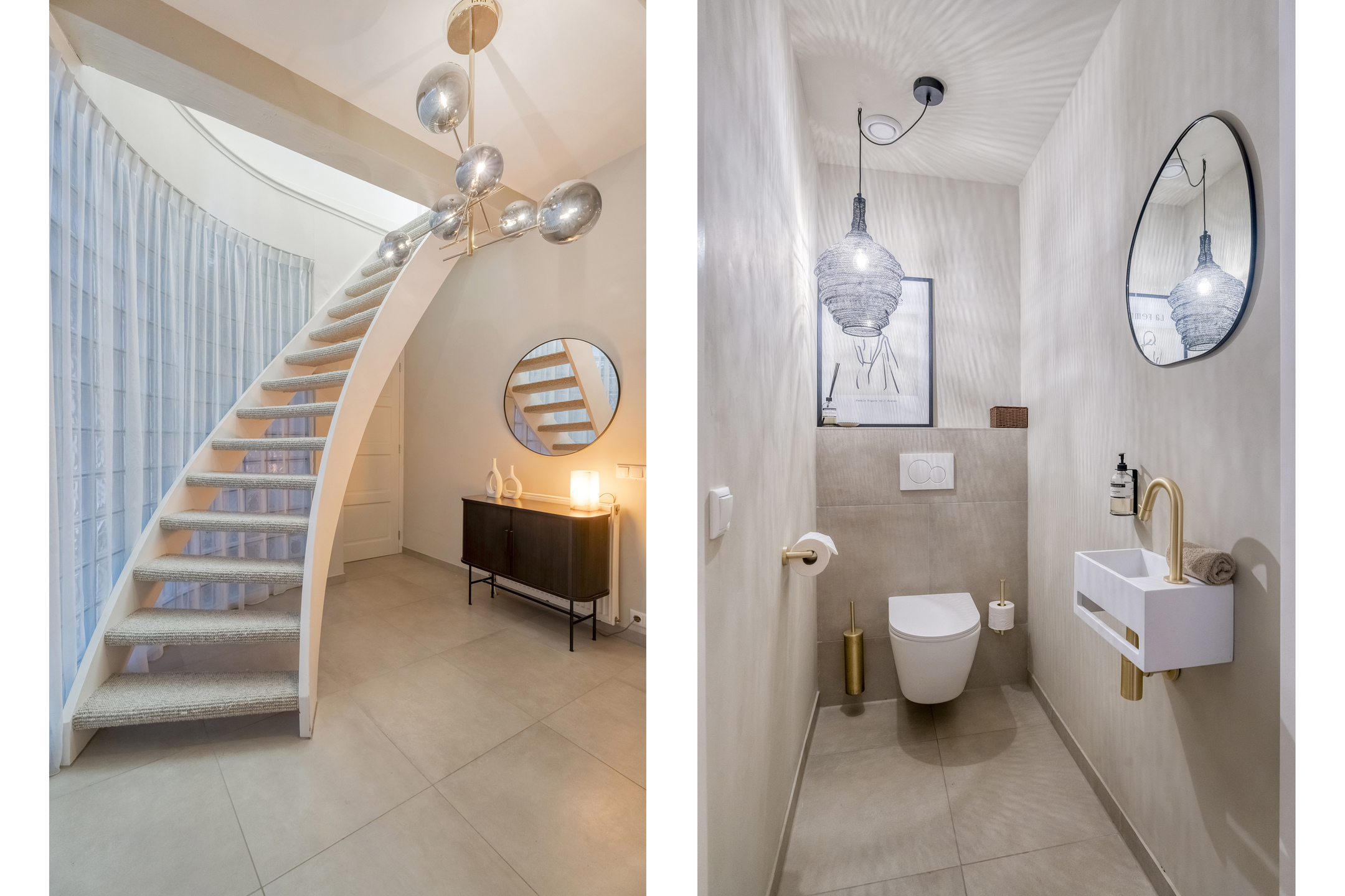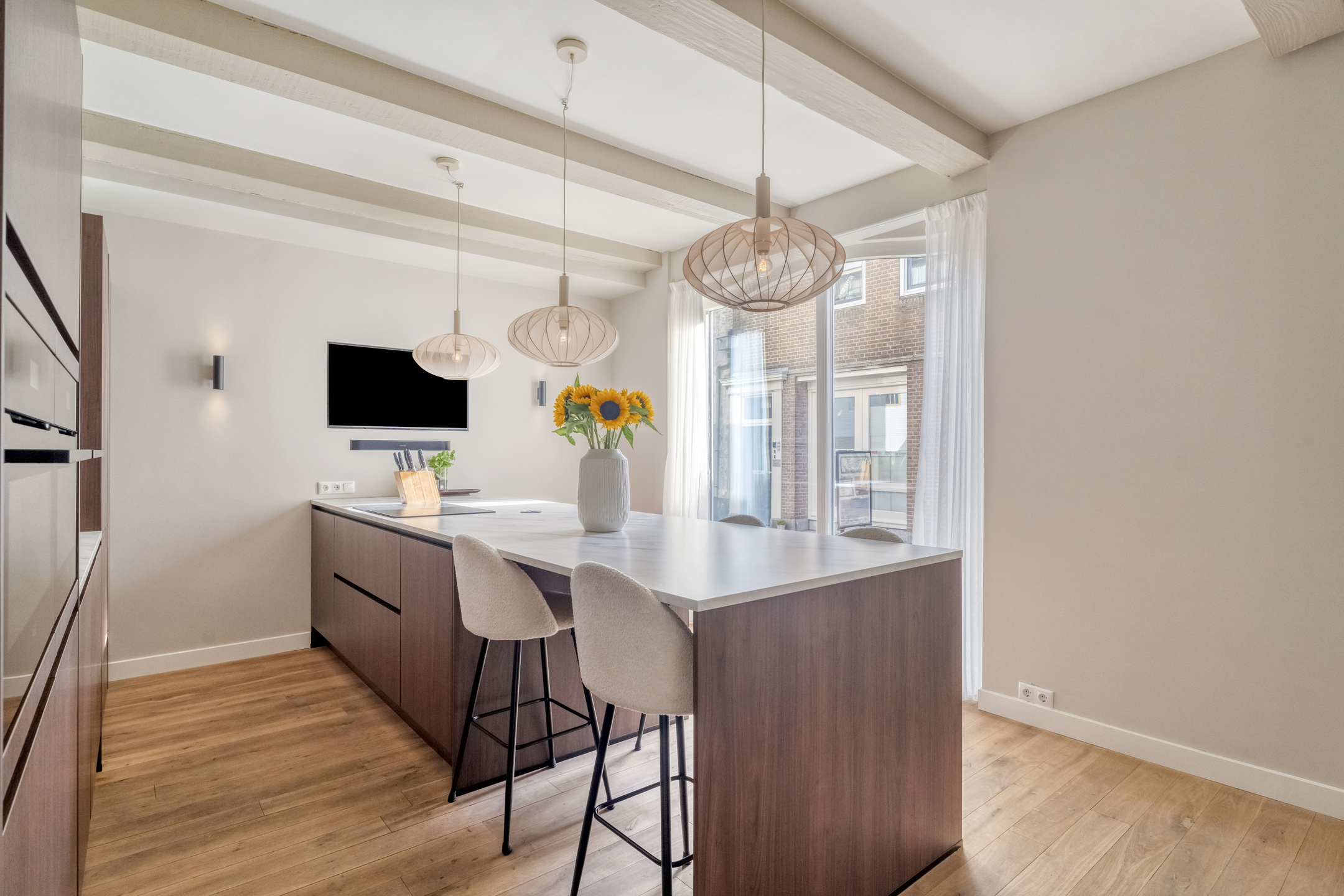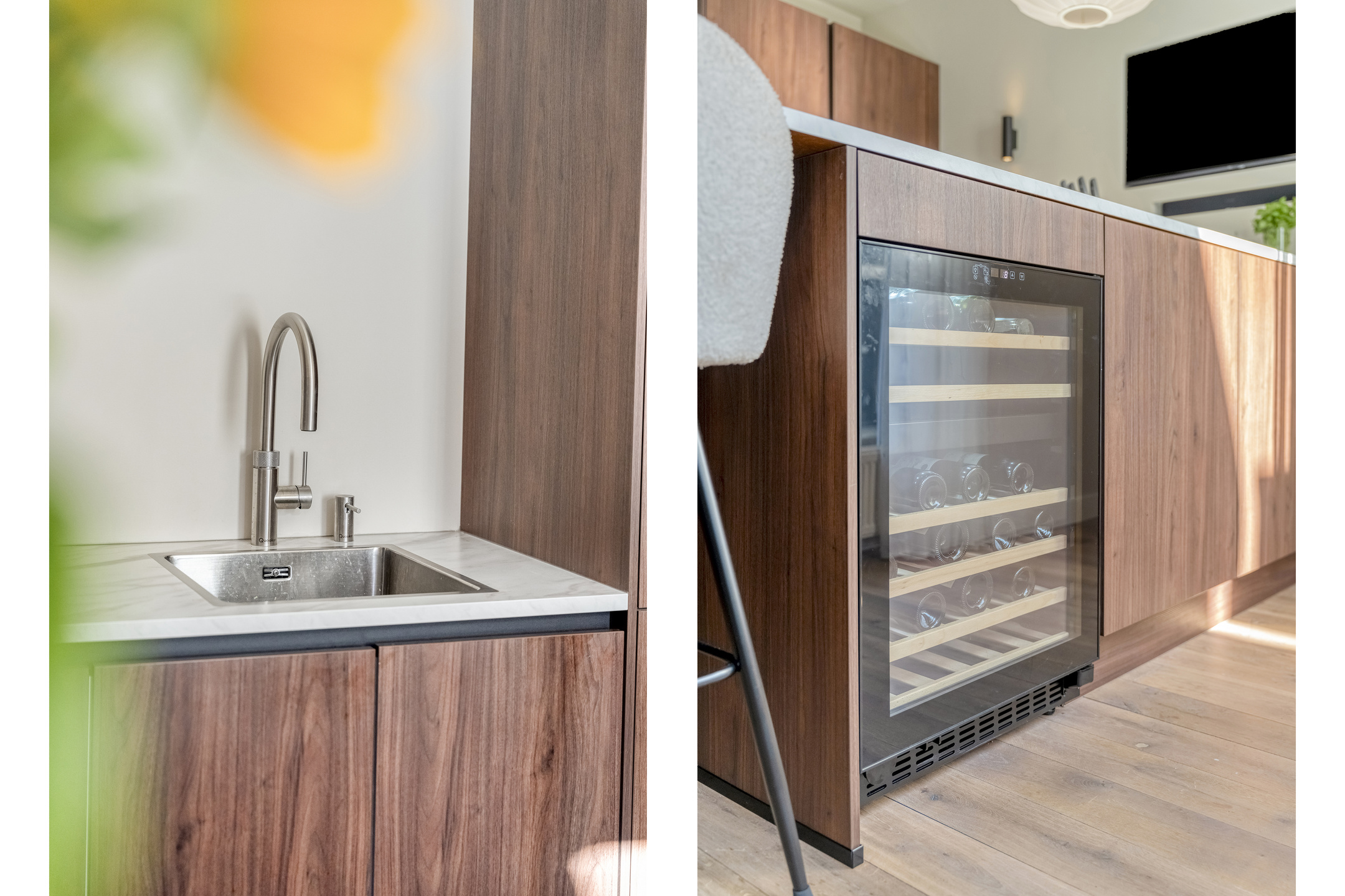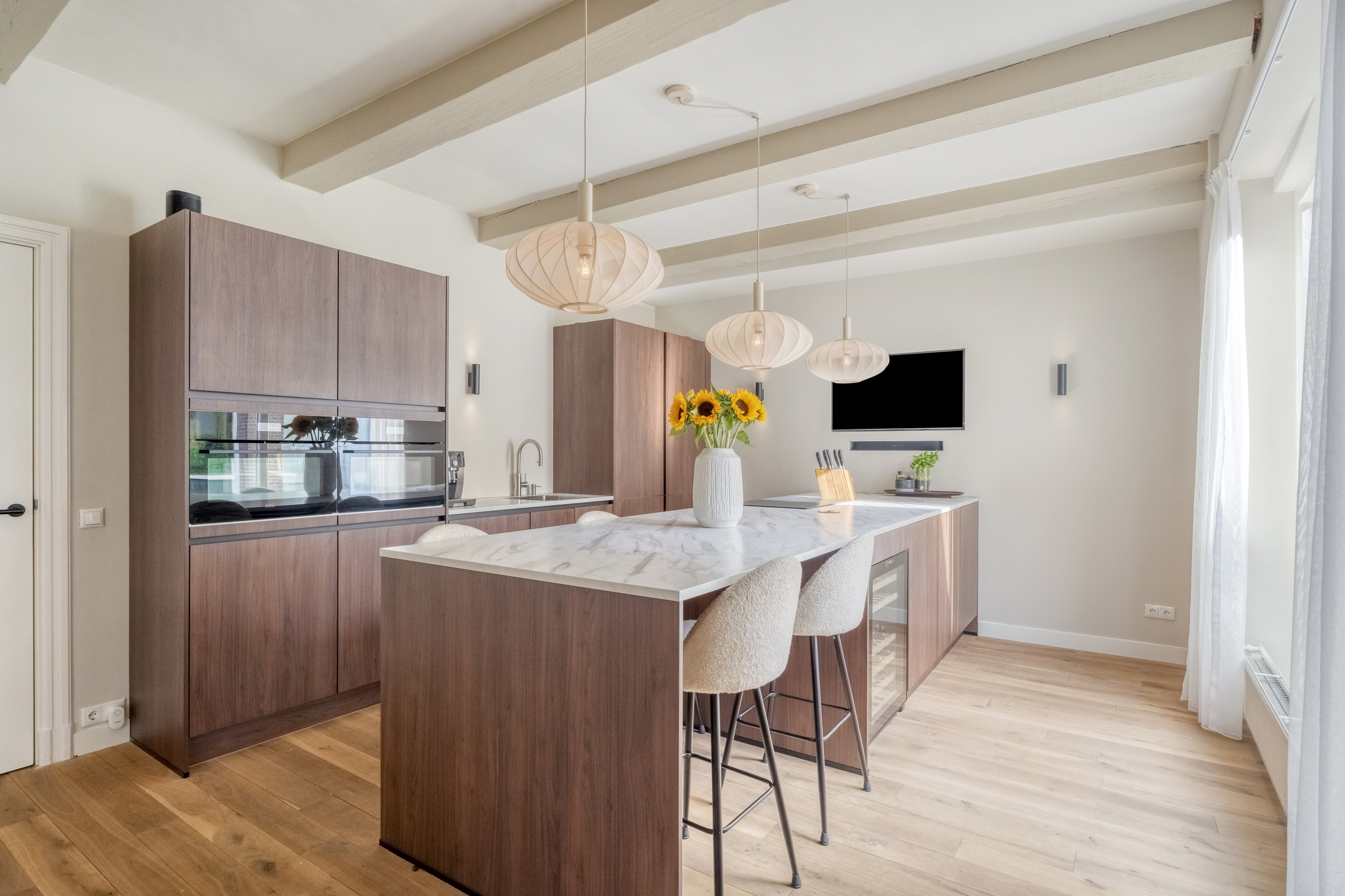 Via de voordeur stapt u een royale hal binnen, waar meteen de sfeer van het pand voelbaar is: hoge plafonds, paneeldeuren en een authentieke trapopgang. Deze hal geeft toegang tot het toilet en tot de in 2024 geplaatste keuken. Deze keuken bevindt zich aan de achterzijde en is ruim opgezet. Het beschikt over een vaatwasser, Quooker, XXL koel- en vrieskast, een Bora kookplaat, wijnklimaatkast en een dubbele combi-oven. Verder sluit de keuken dankzij de combinatie van de strakke lijnen met warme kleuren perfect aan bij het karakter van de woning.