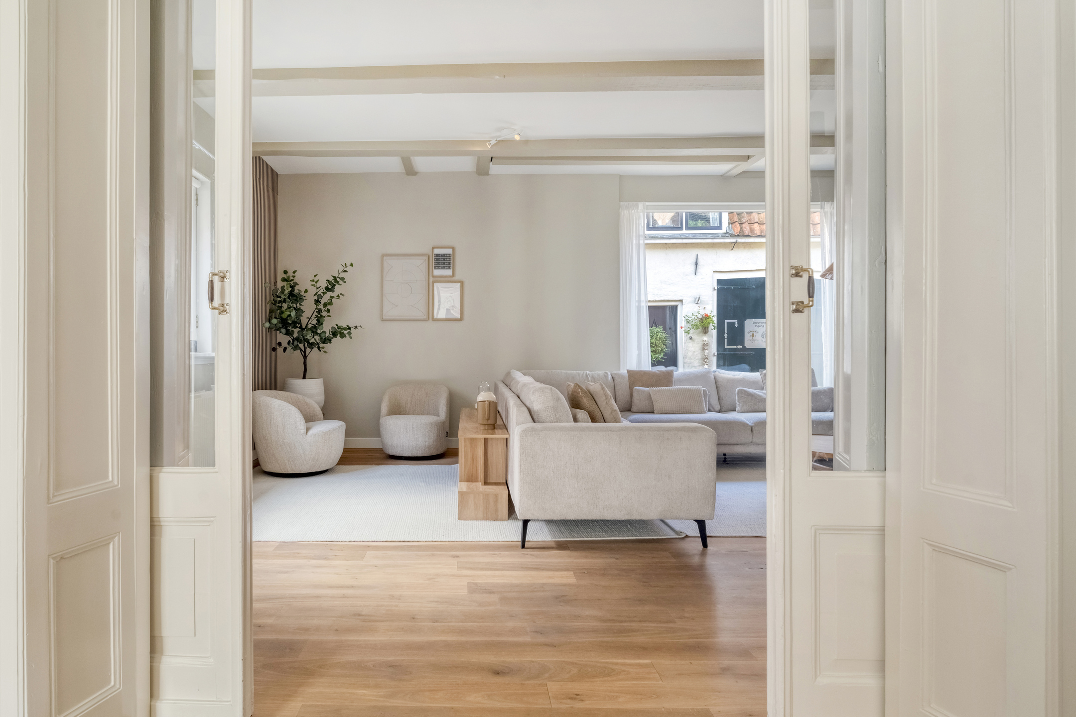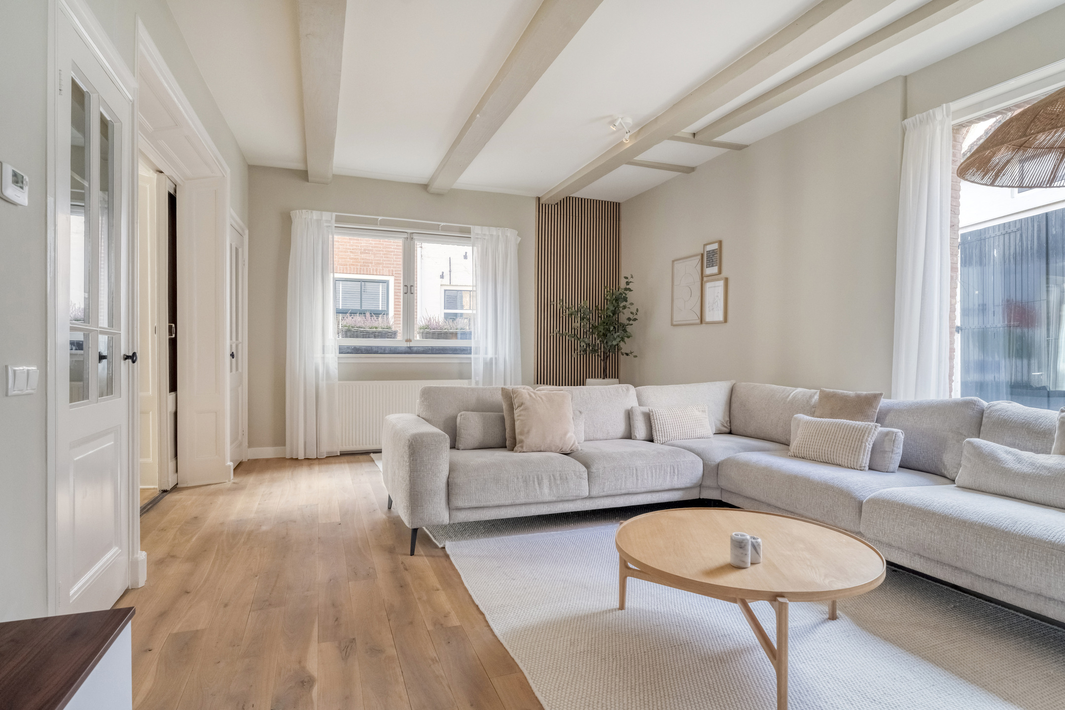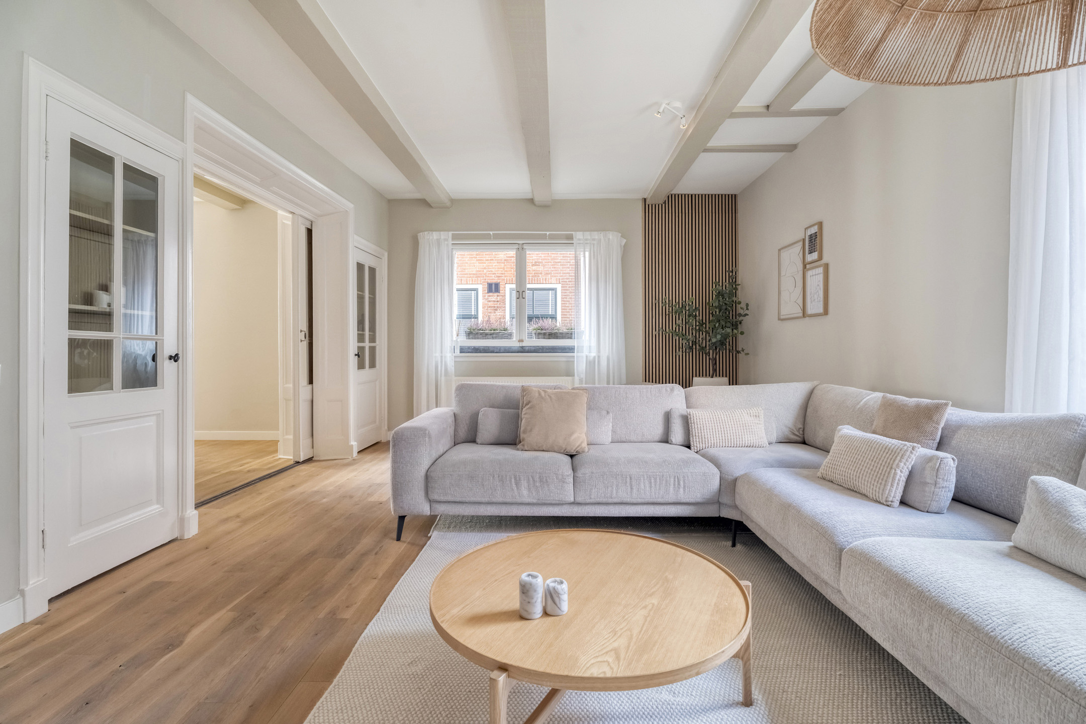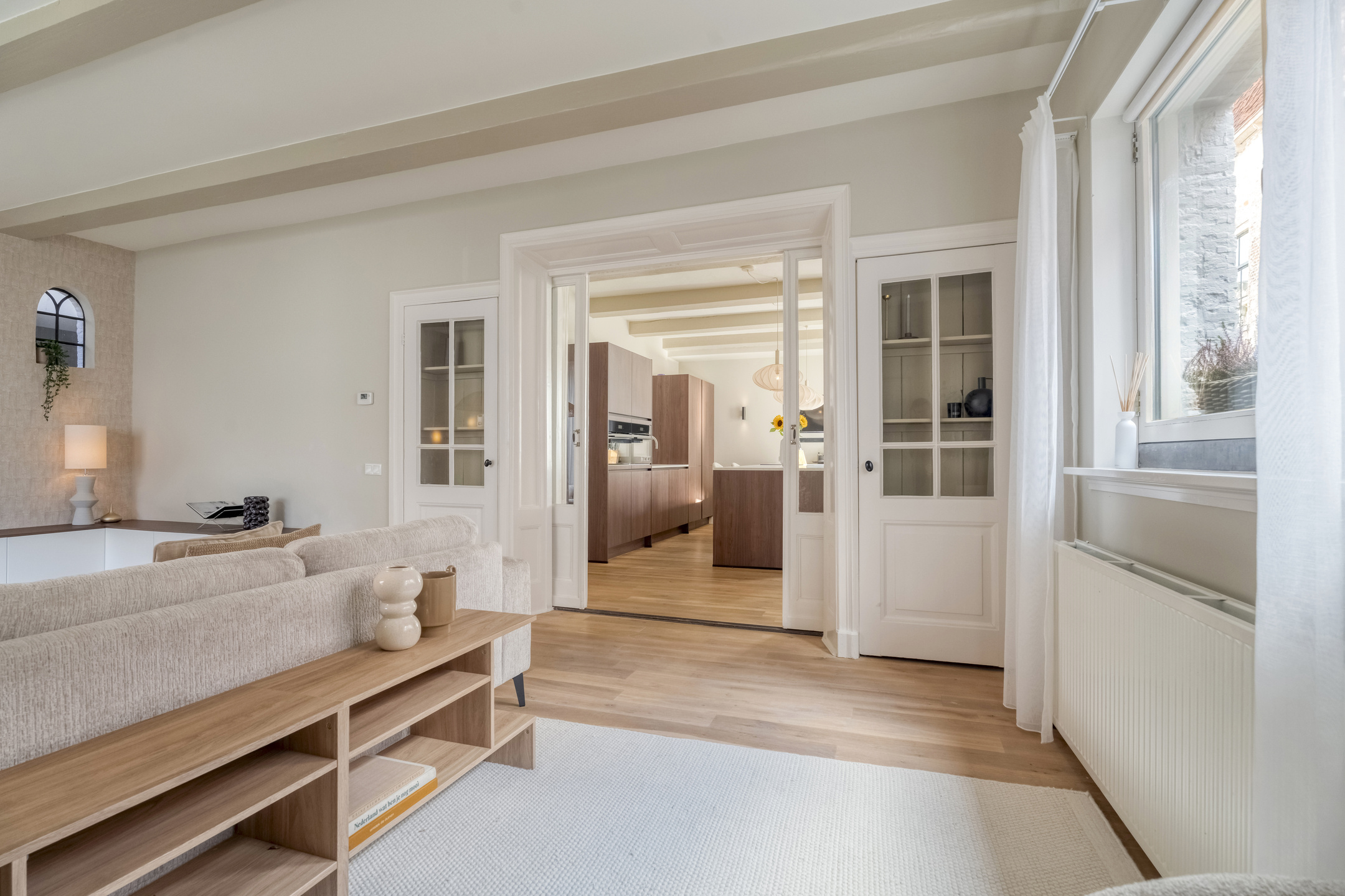 Middels de ensuite deuren is de sfeervolle woonkamer te bereiken. Deze is aan de voorzijde gelegen en voorzien van originele balkenplafonds en grote ramen die zorgen voor een prettige lichtinval.