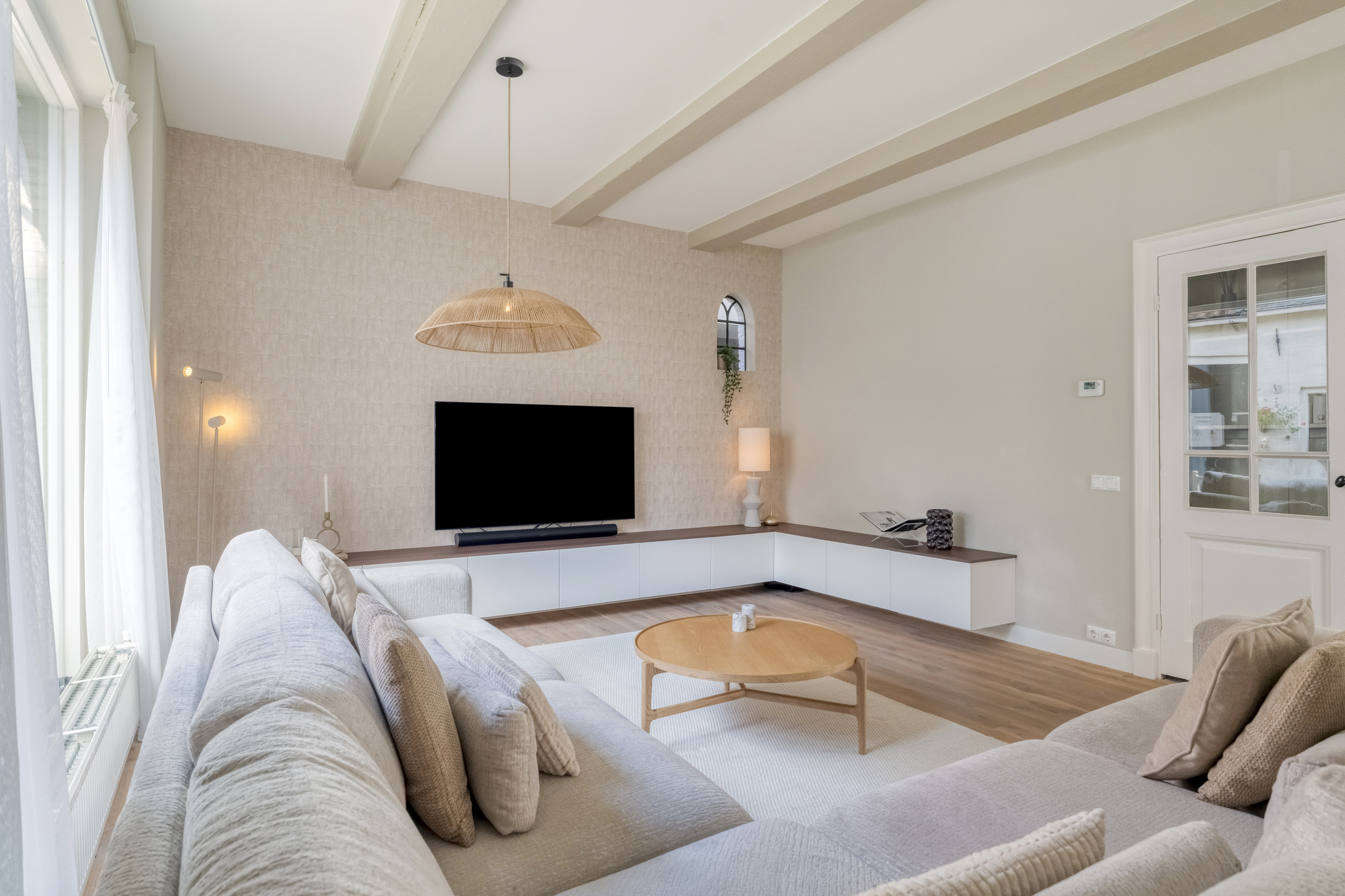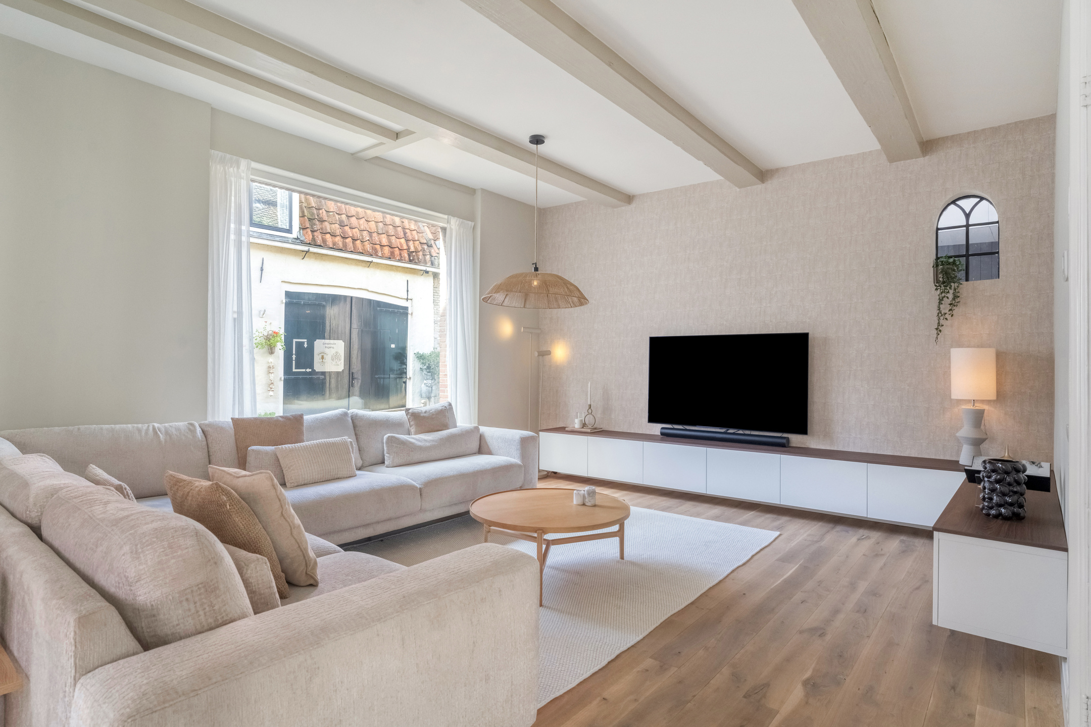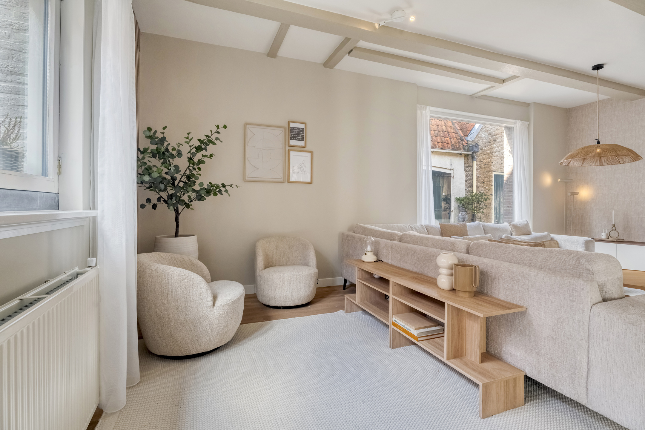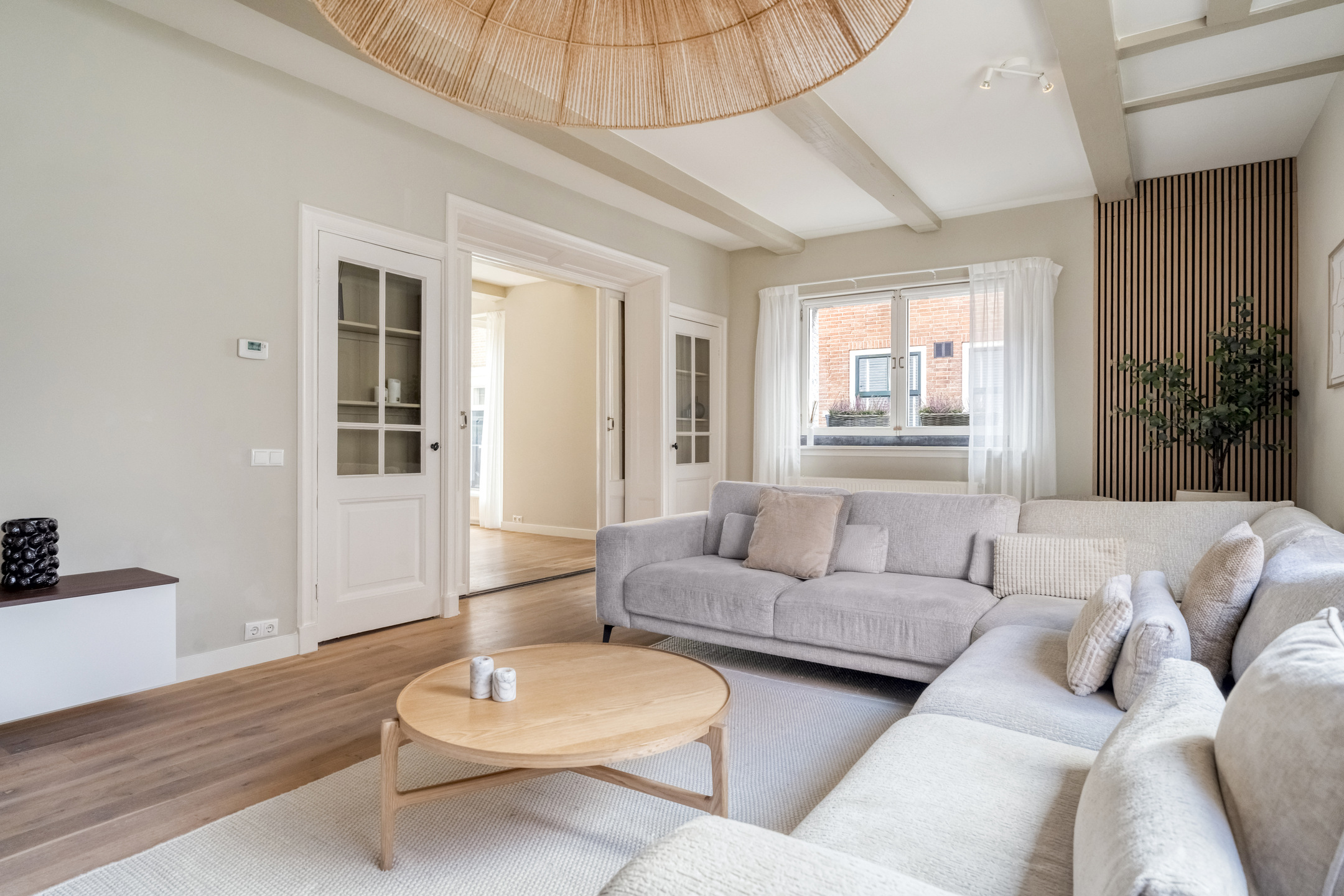Middels de ensuite deuren is de sfeervolle woonkamer te bereiken. Deze is aan de voorzijde gelegen en voorzien van originele balkenplafonds en grote ramen die zorgen voor een prettige lichtinval.