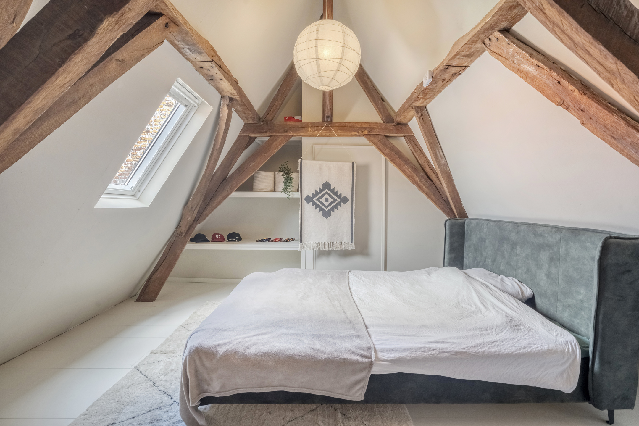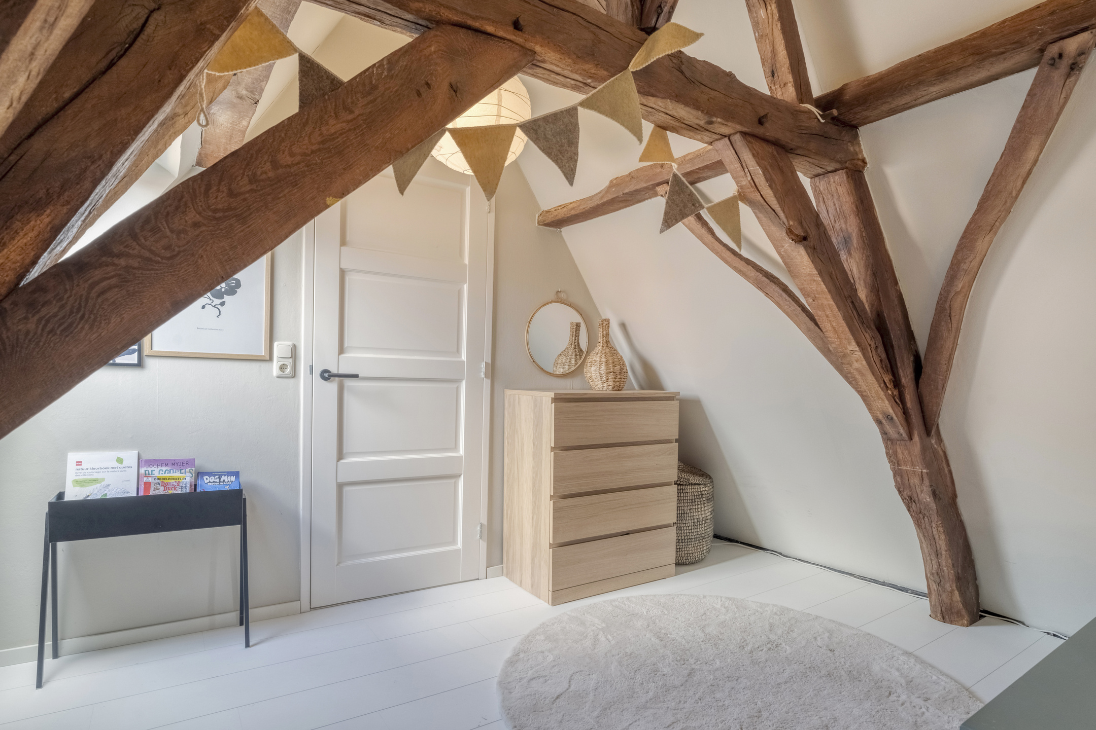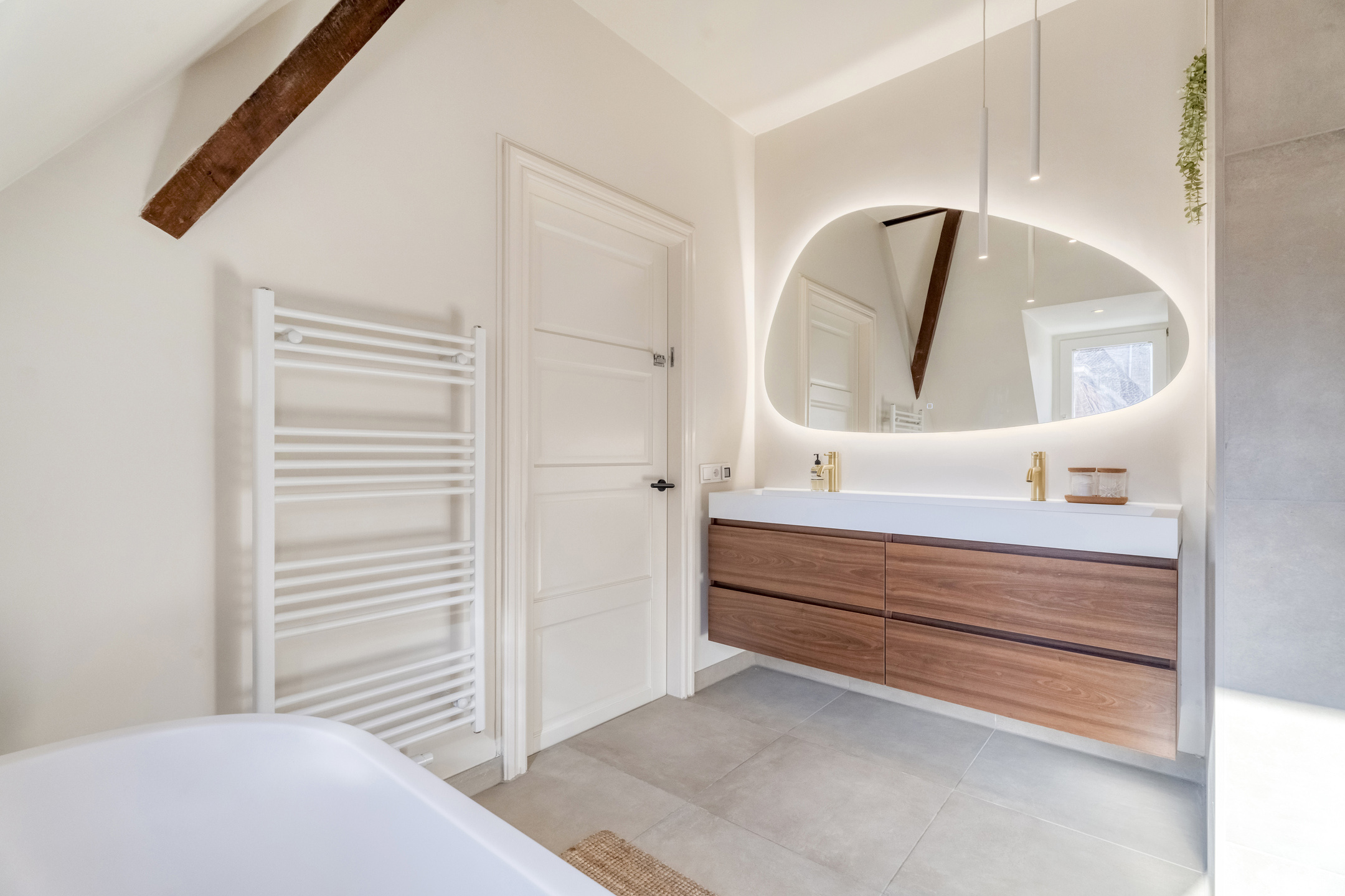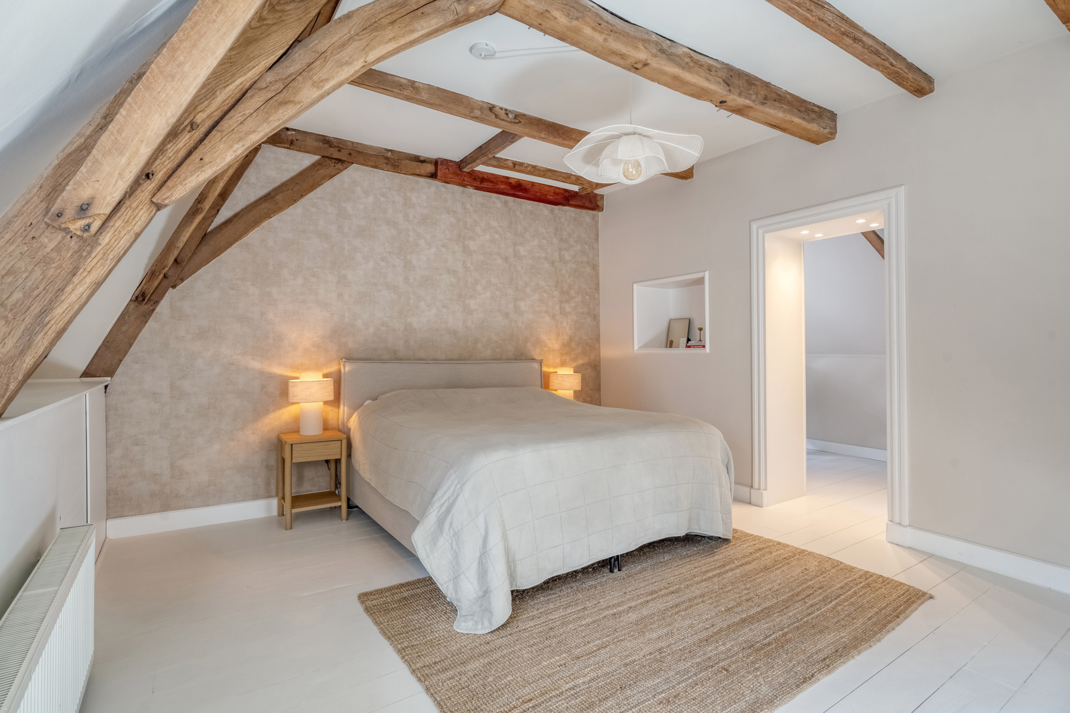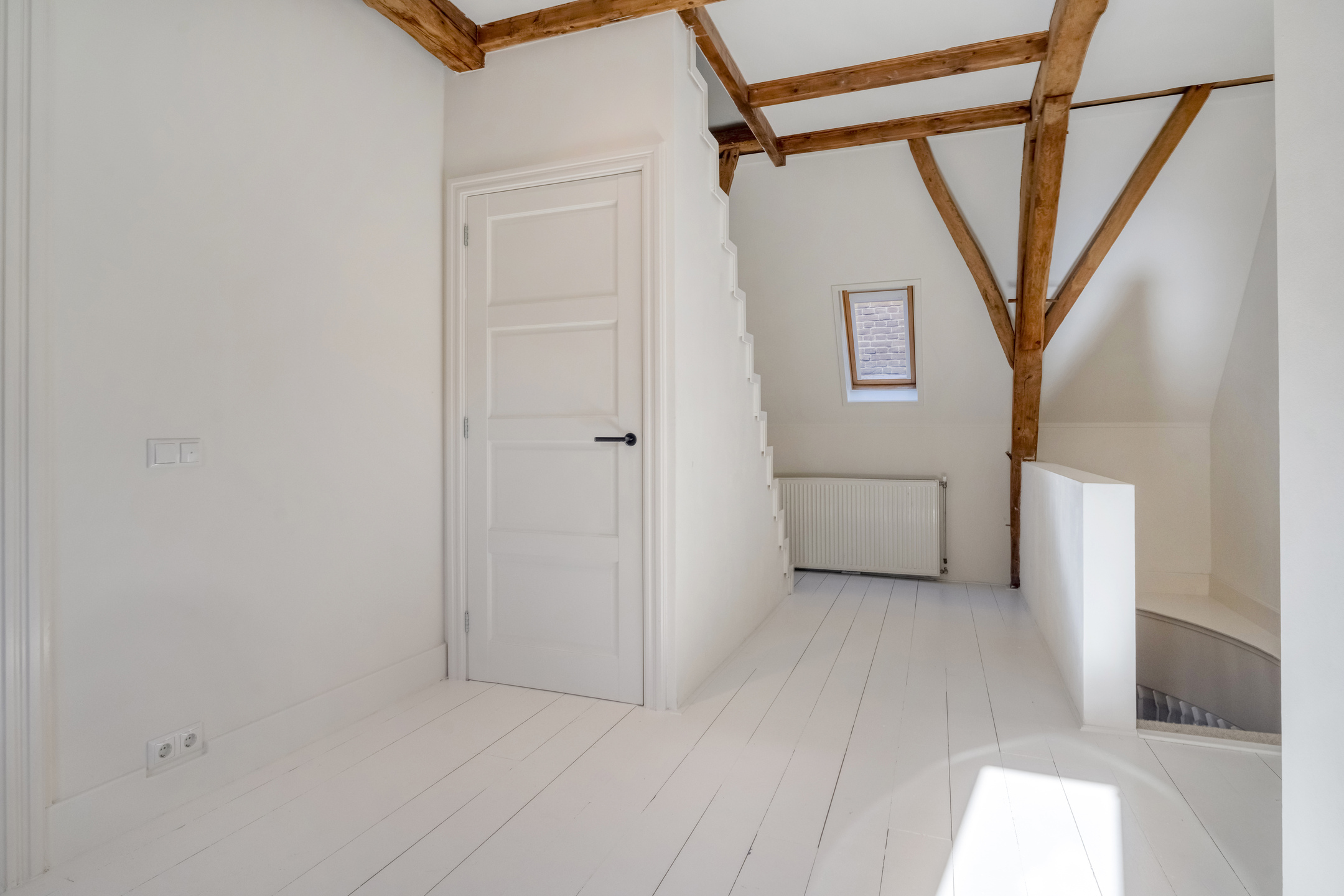 Op de eerste verdieping treft u twee ruime slaapkamers aan en een ruimte welke gebruikt kan worden als inloopkast of als kantoor. Ook op deze verdieping zijn de authentieke elementen bewaard gebleven: houten balken en houten vloeren geven elke kamer zijn eigen karakter. Ook de badkamer is in 2024 volledig vernieuwd en beschikt over een extra groot bad, een regendouche, dubbele wastafel, toilet en dat alles met vloerverwarming.