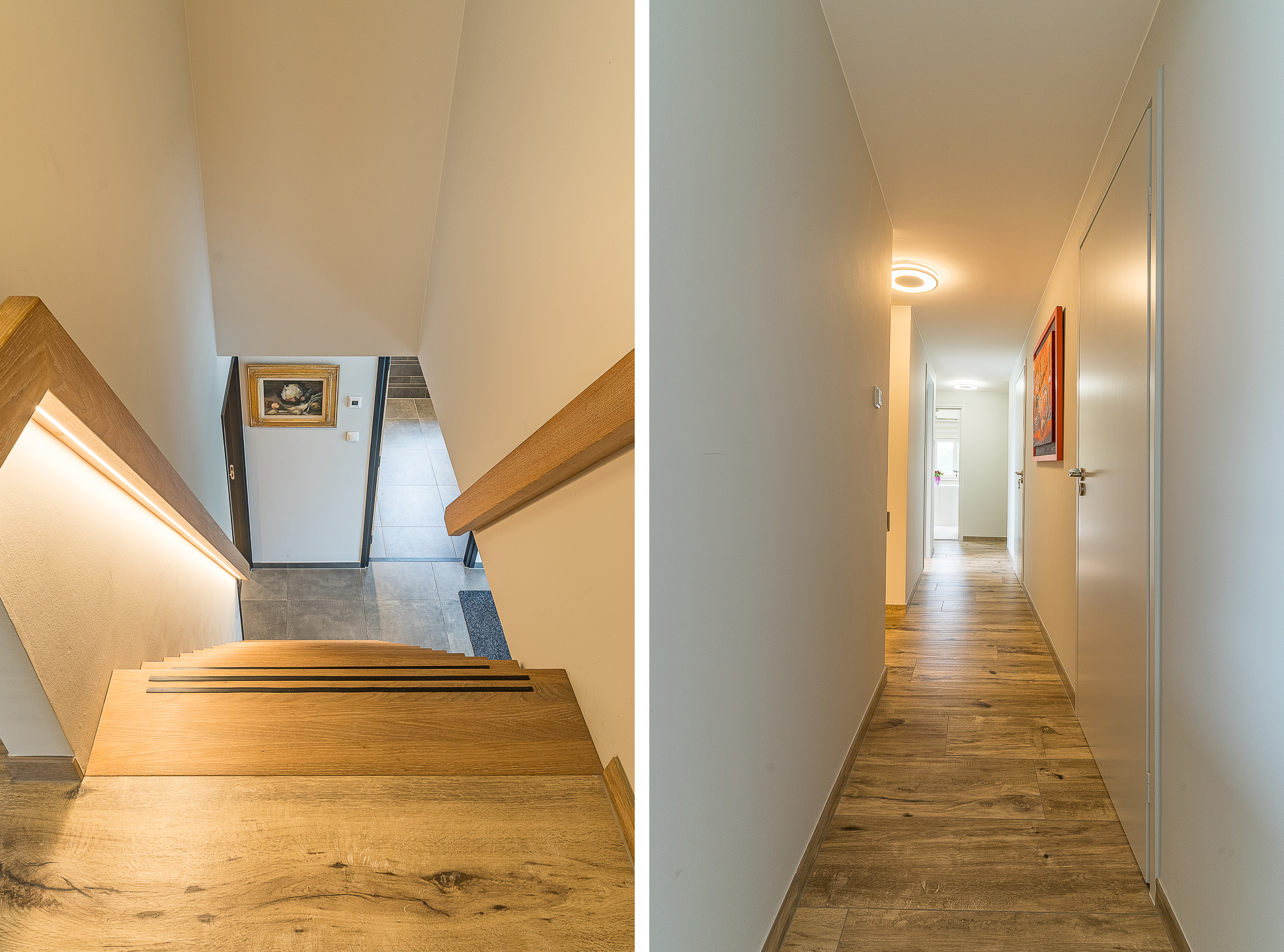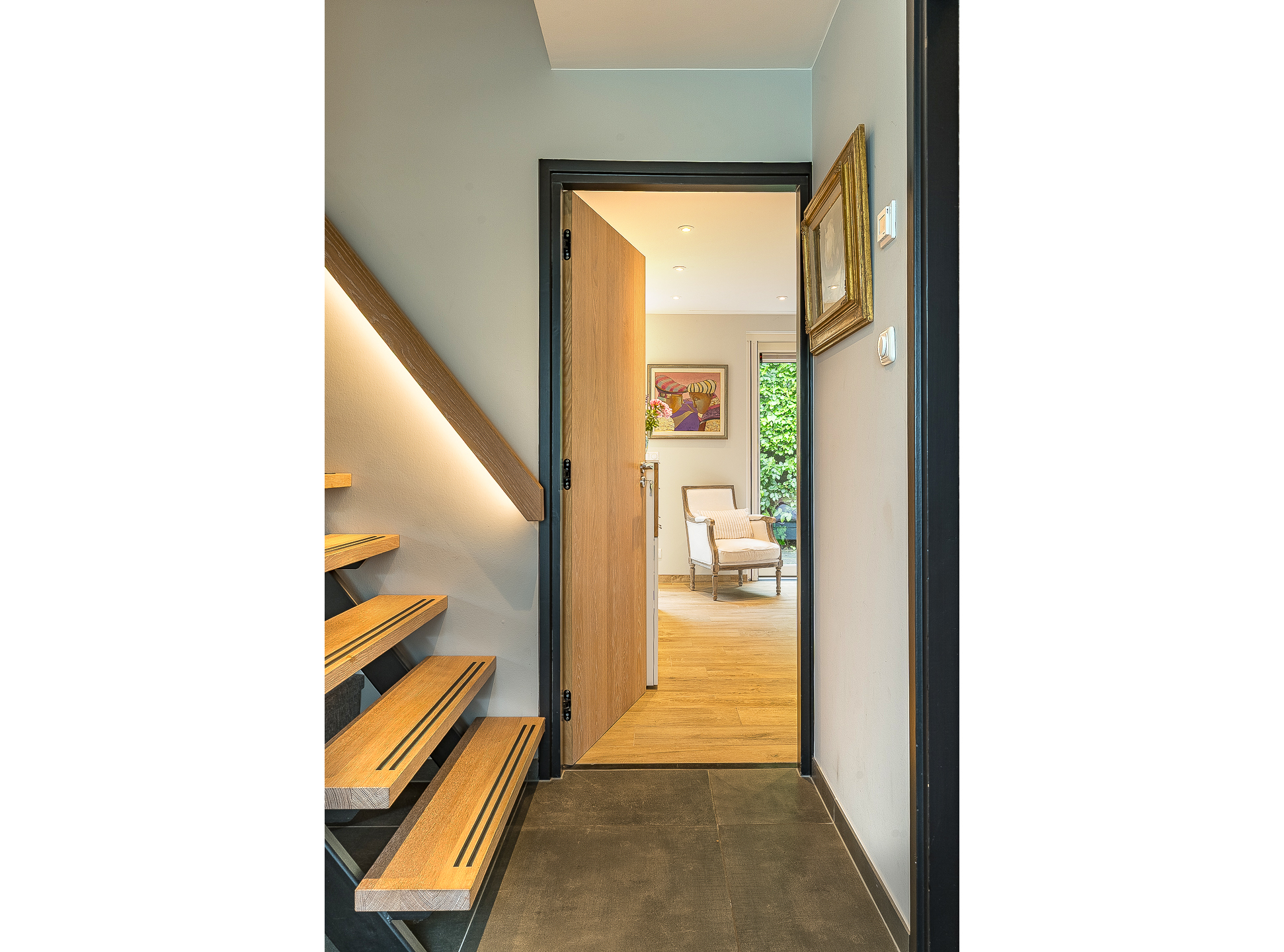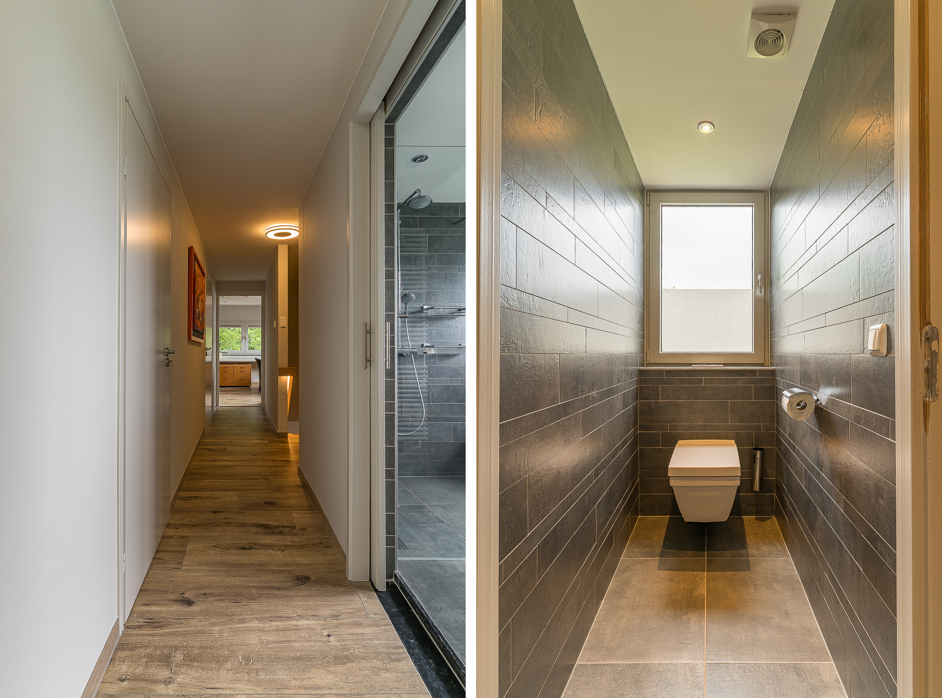U komt de woning binnen in de hal, waar u dezelfde luxe en hoogwaardige afwerking tegenkomt. In de hal is de massief eikenhouten trap met het indirecte licht bij de trapleuning een échte eyecatcher. De tussendeuren zijn vervaardigd uit hetzelfde hout, waardoor het een mooi geheel is geworden.
