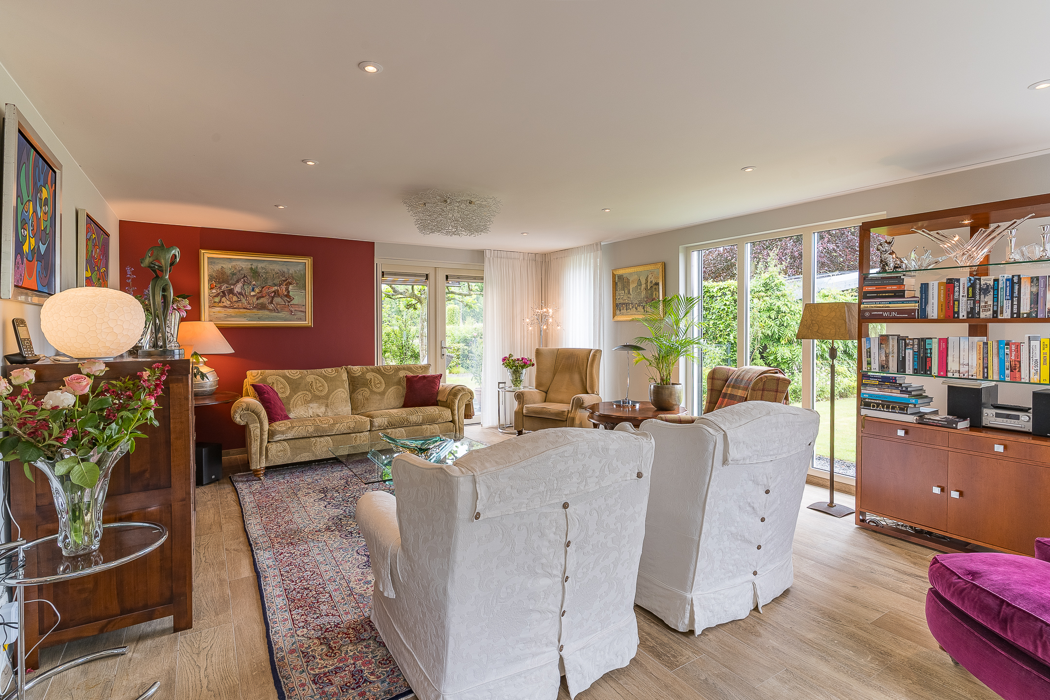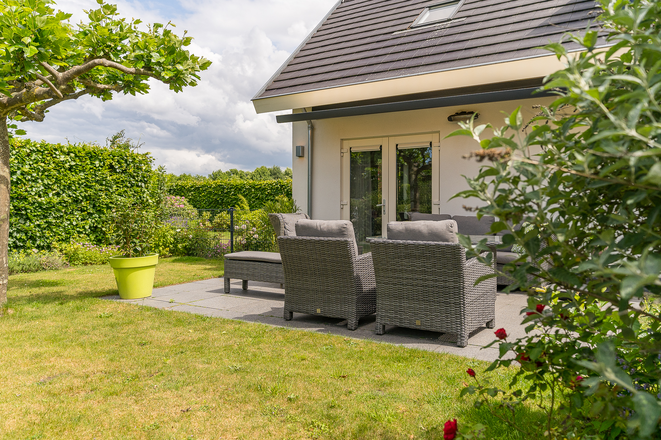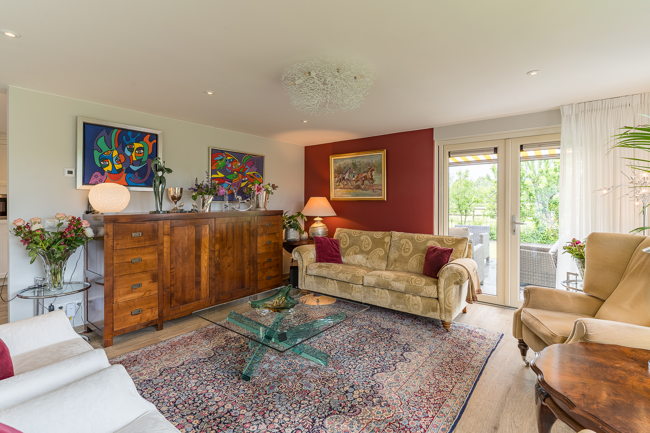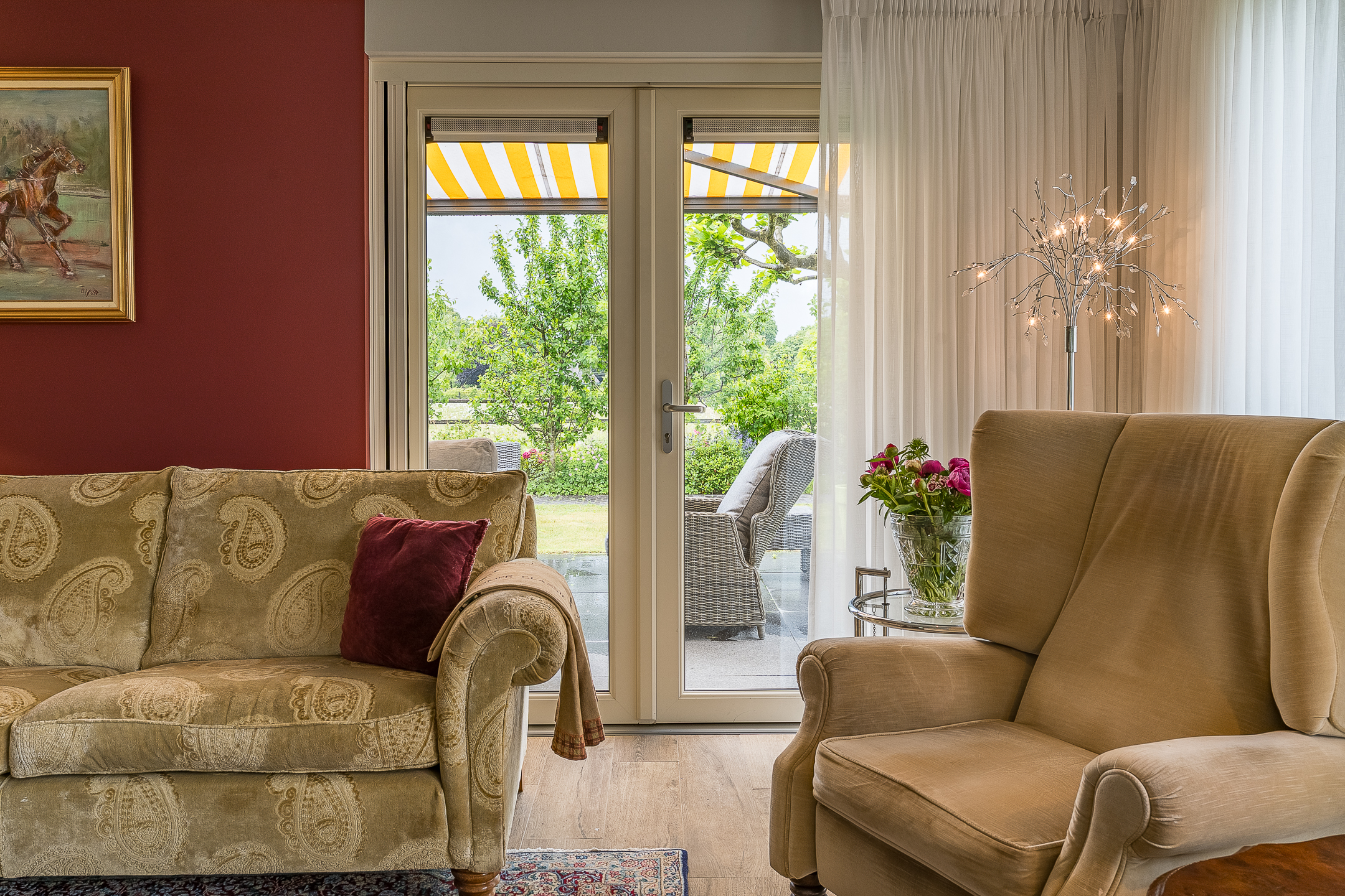 Vanuit de woonkamer is er aan weerszijden toegang tot een terras, waarvan er één een prachtig uitzicht biedt over de weide naast de woning.