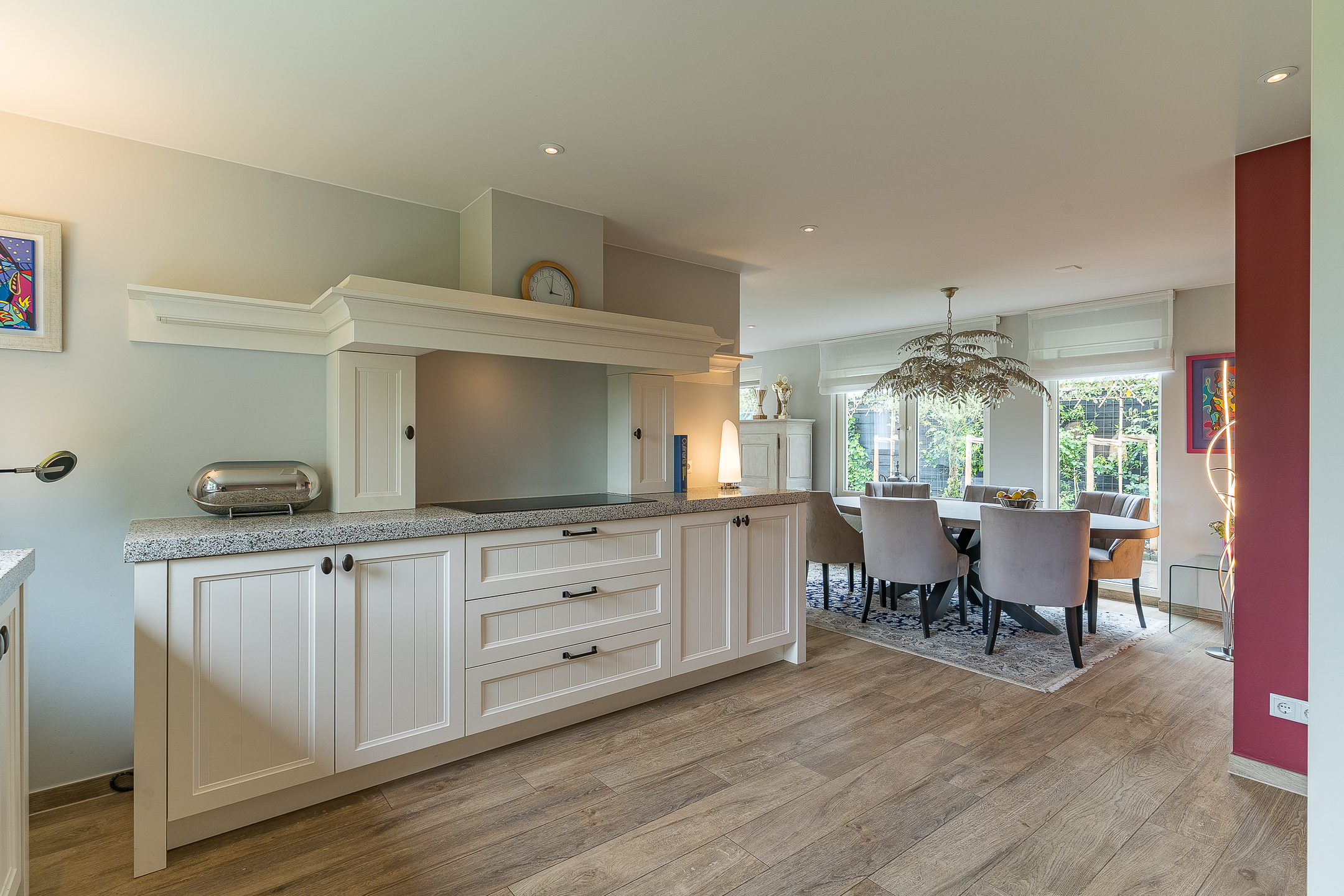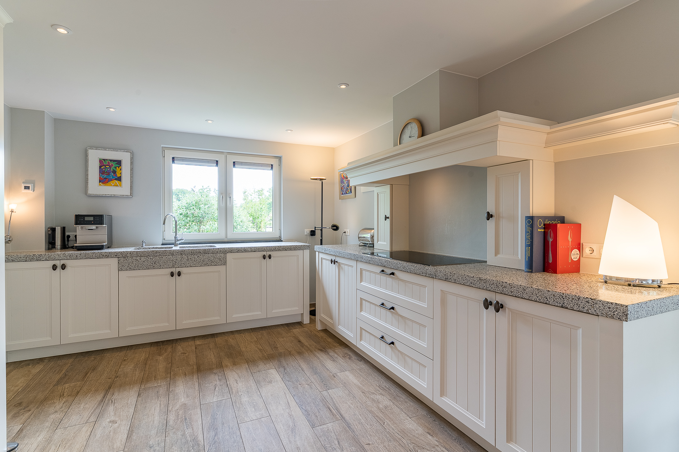 In de keuken is er uiteraard alle ruimte om de lekkerste gerechten te bereiden. De royale keukenopstelling bestaat uit een tweetal aanrechten en een kastenwand. Naast veel werk- en bergruimte, beschikt de keuken over diverse, luxe inbouwapparatuur.